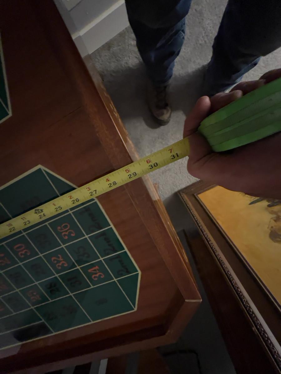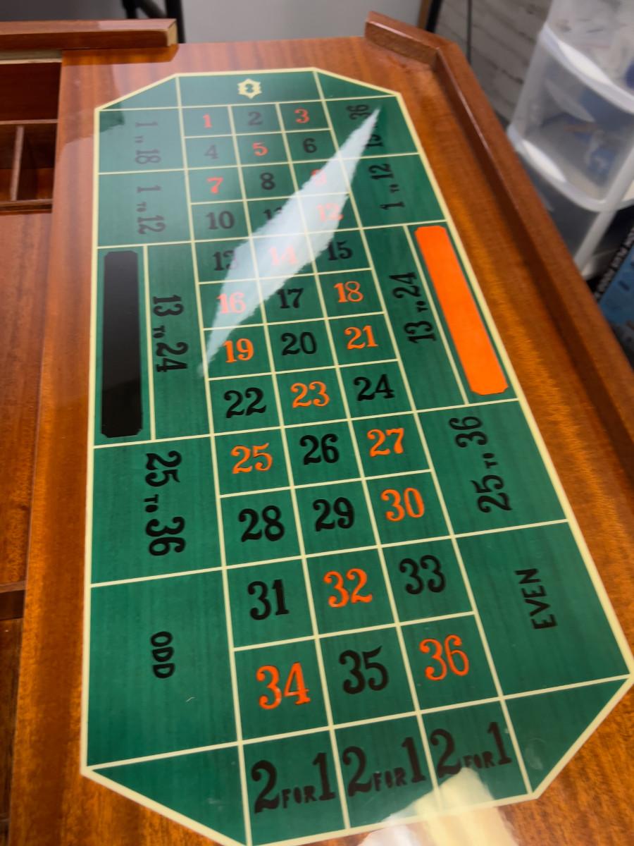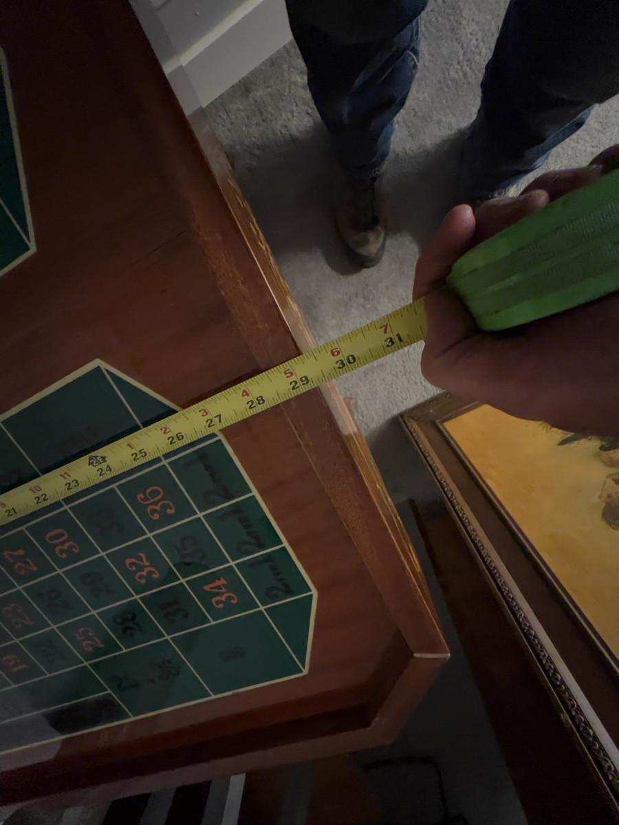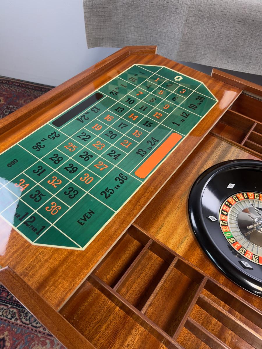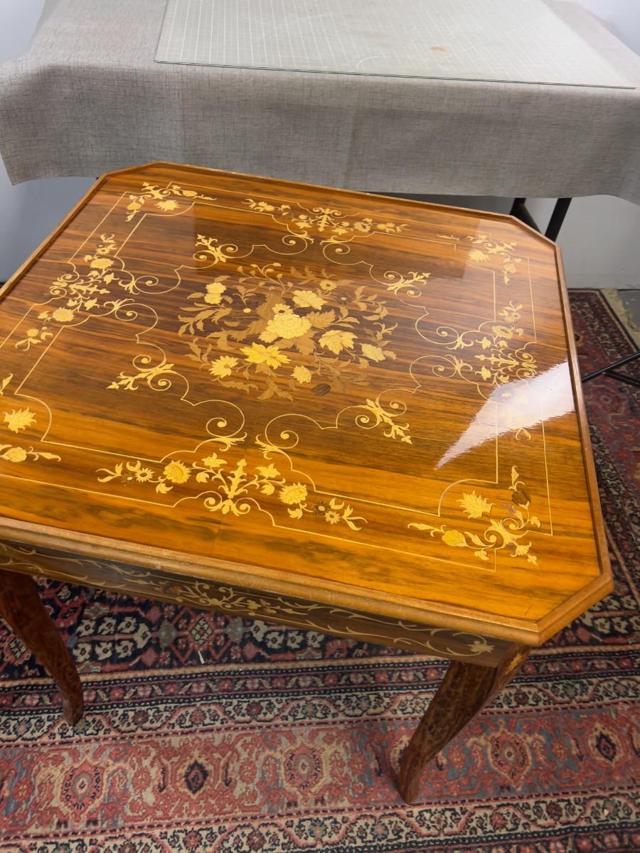 Table is in excellent condition, 30" square and 30" tall. Beautifully kept circa 1960's inlay table. Chess, Checkers, Backgammon, Felt top for cards, including a roulette table. If shipping is desired we can facilitate dropping of at a crater/shipping company of the buyers choice.