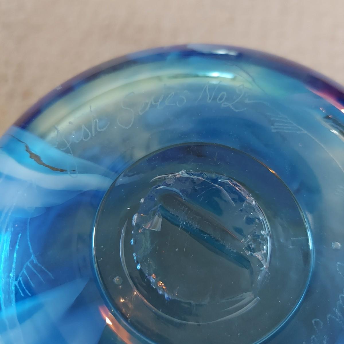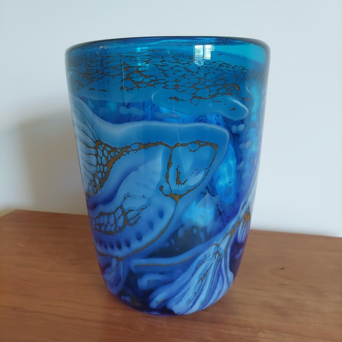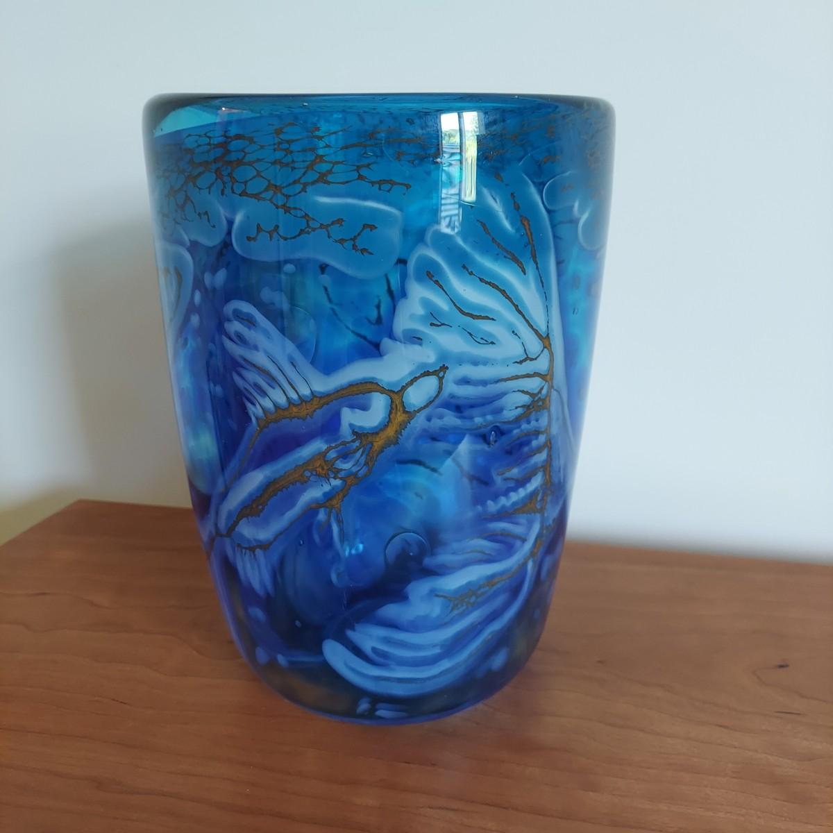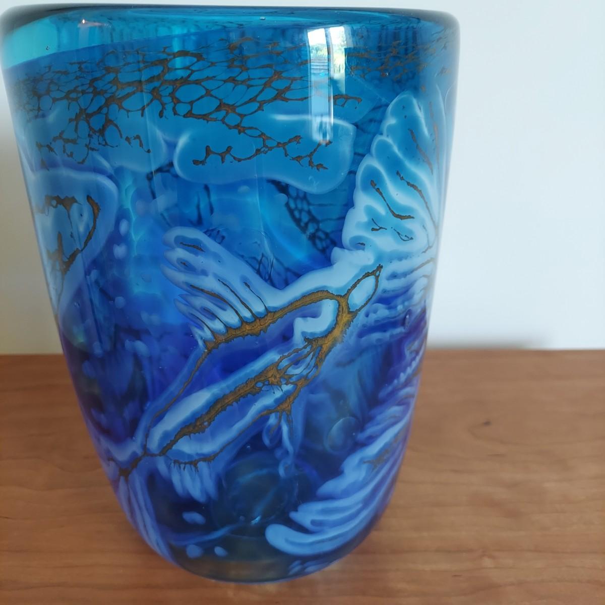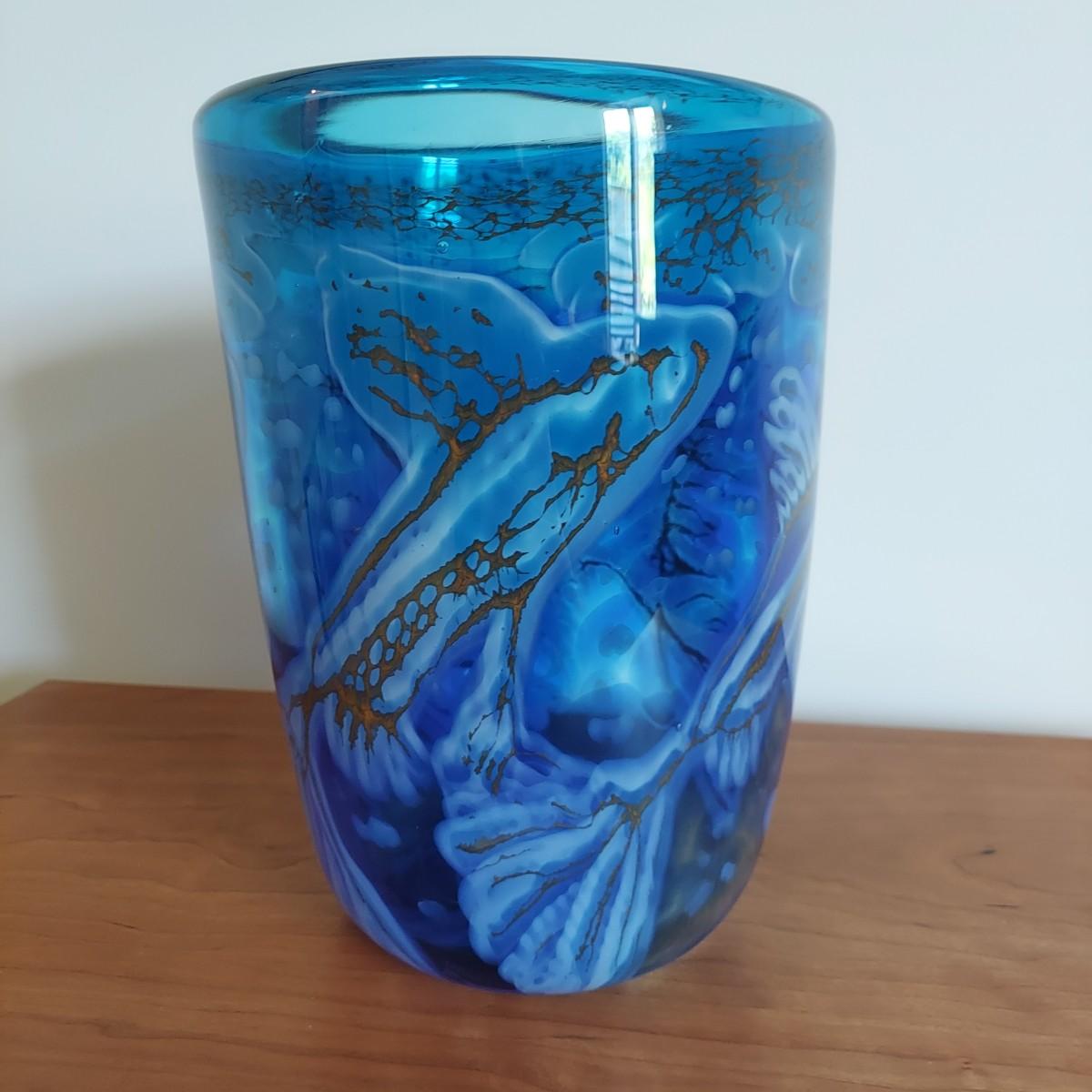 Beautiful blue and gold blown glass vase. The bottom reads "Fish Series No 2 Fern Tail Blues April 1999 Jean Forbes". It's approximately 9.5" tall. Please note that the white lines are a reflection and do not actually appear on the vase. Shipping available