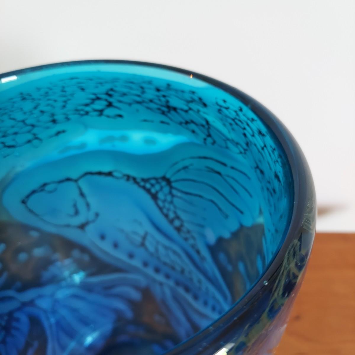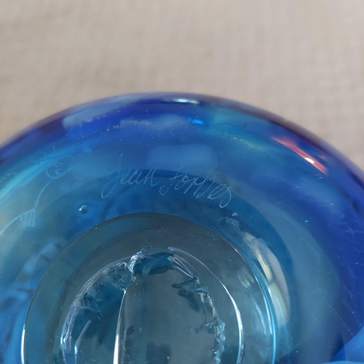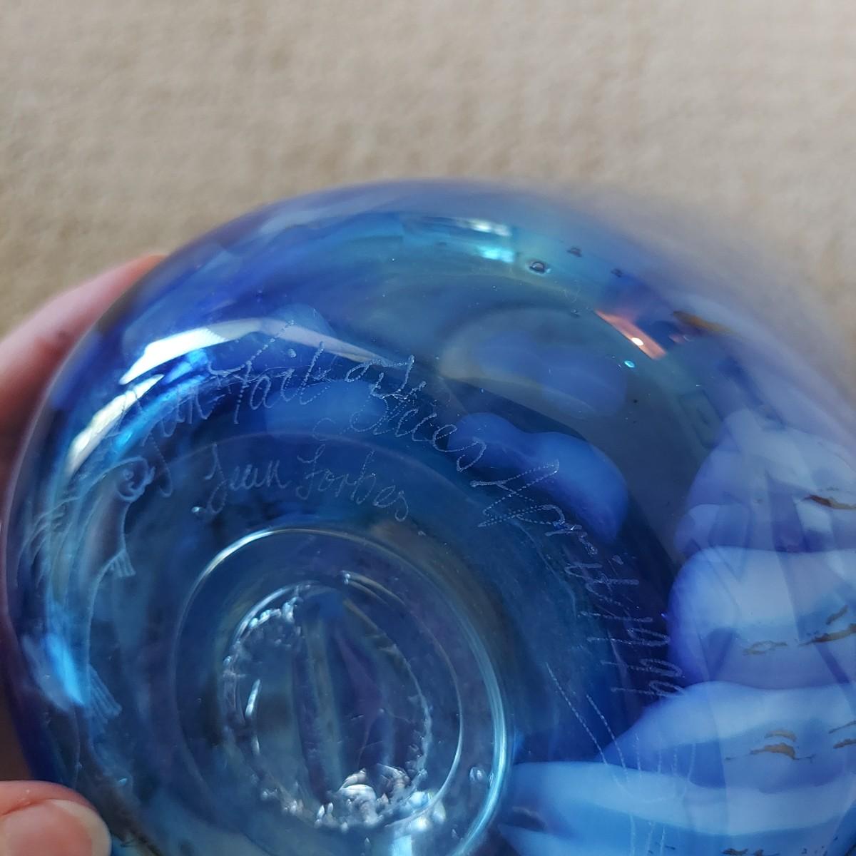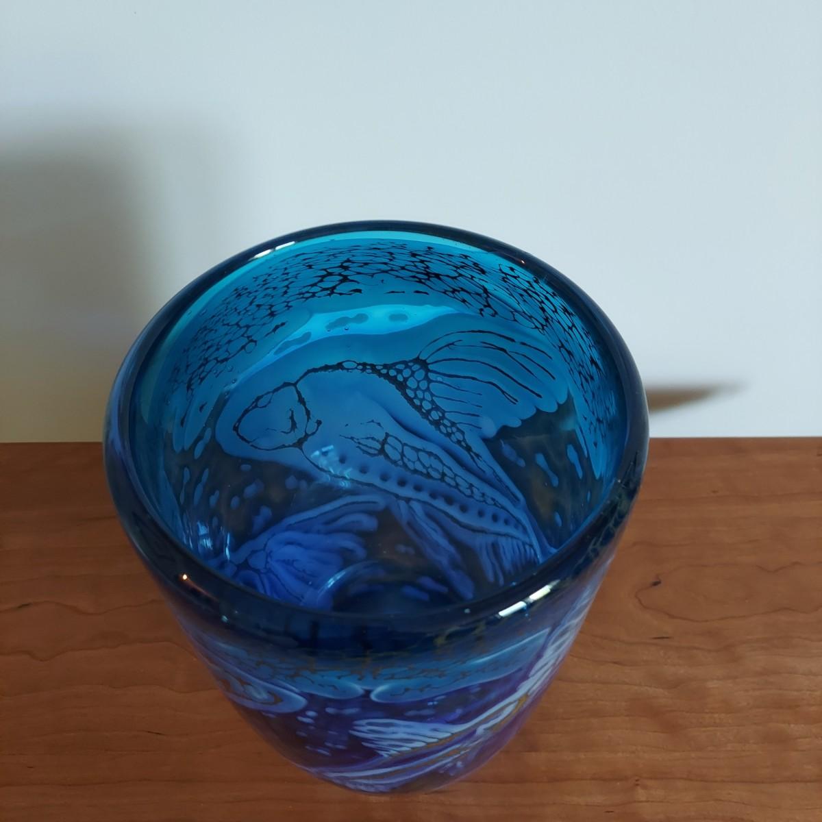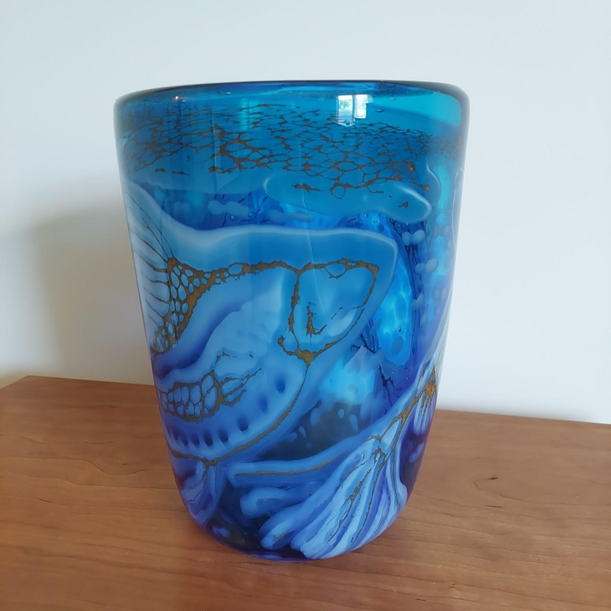 Beautiful blue and gold blown glass vase. The bottom reads "Fish Series No 2 Fern Tail Blues April 1999 Jean Forbes". It's approximately 9.5" tall. Please note that the white lines are a reflection and do not actually appear on the vase. Shipping available
