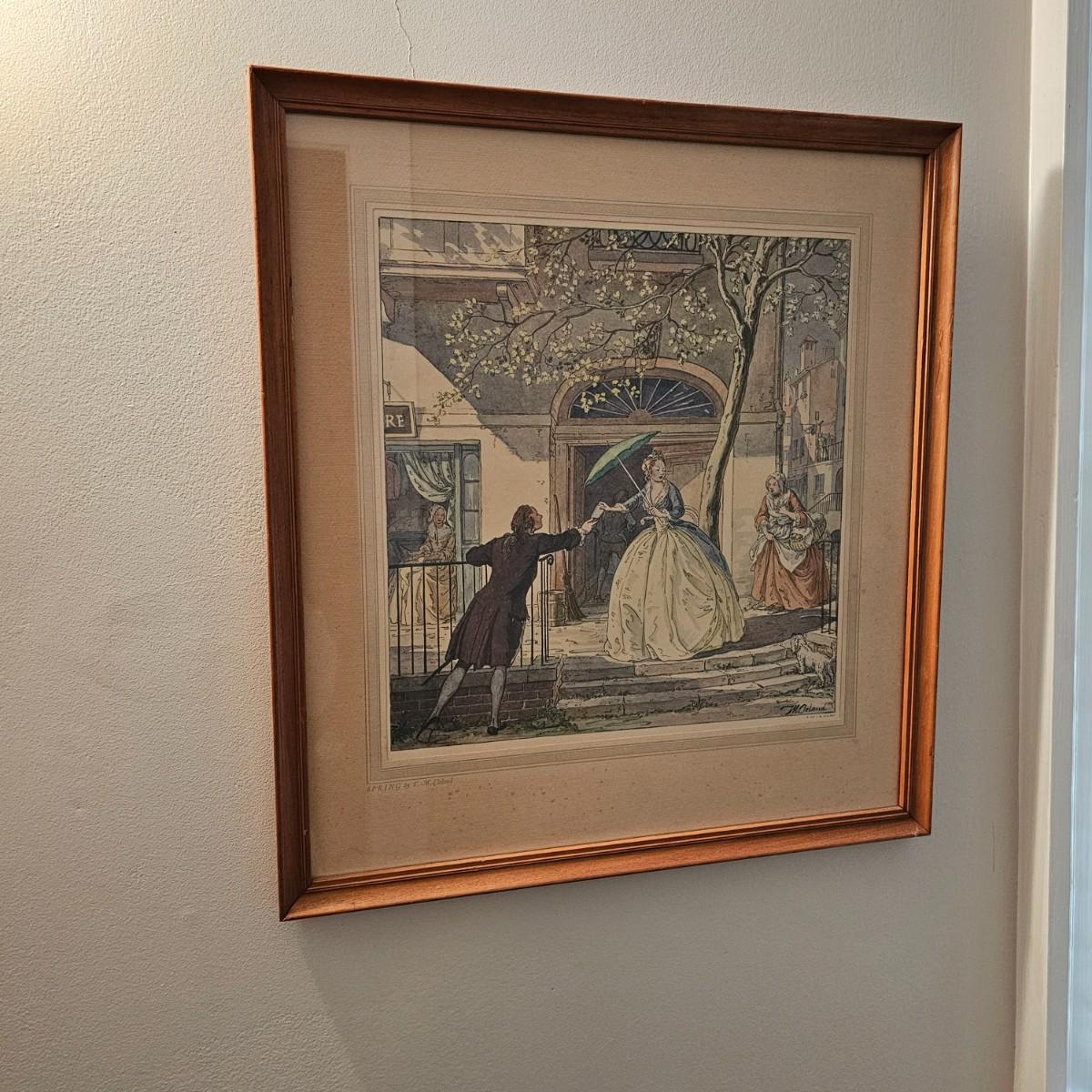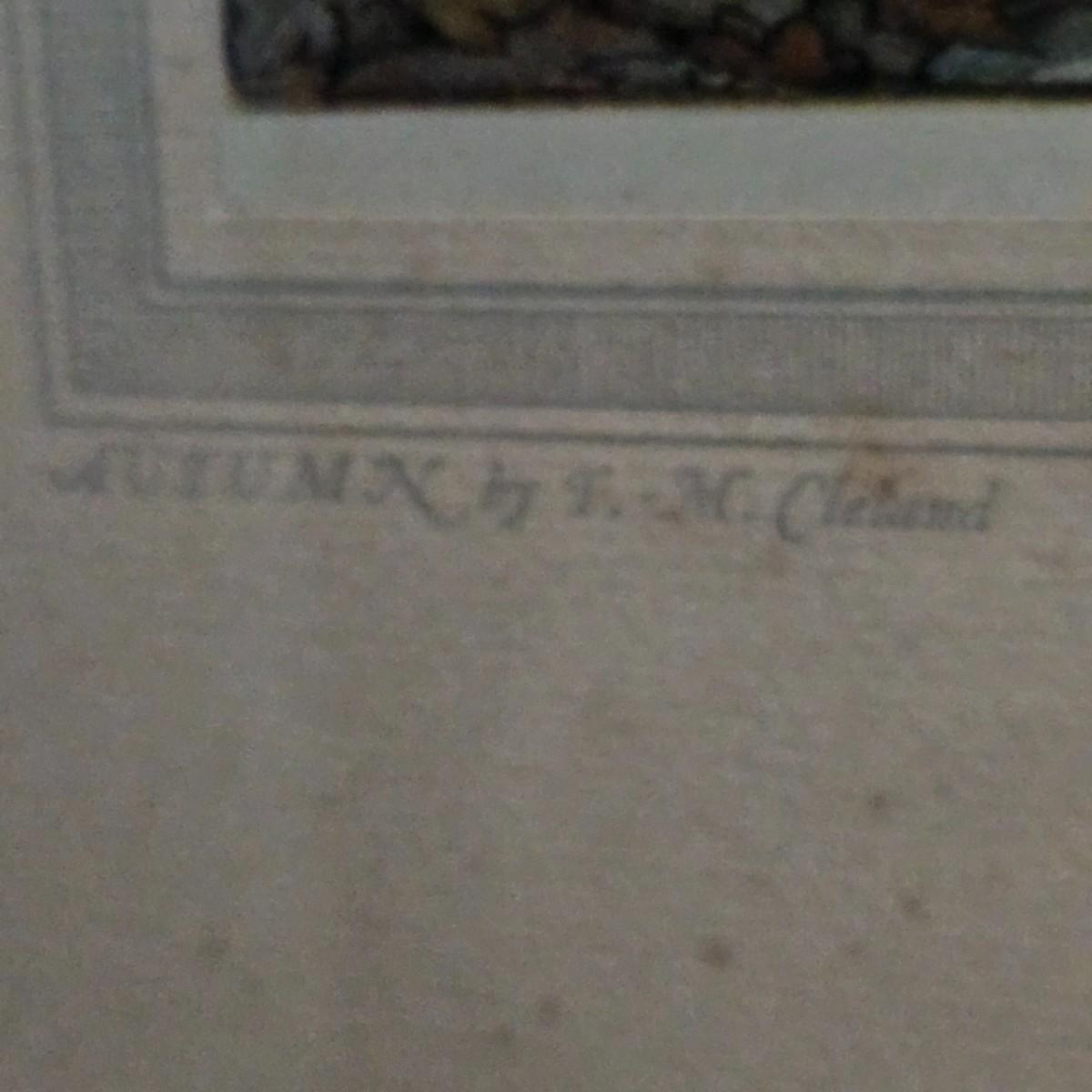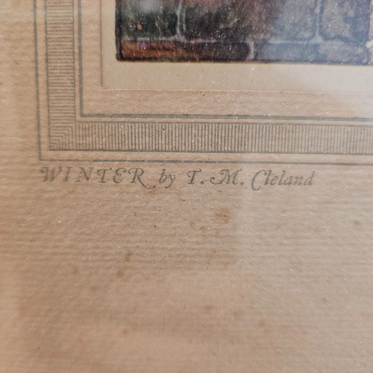 Four 1930's era depictions of the four seasons as interpreted by the artist T.M. Cleland. Images showing home life throughout the year in this collection of four complementing lithographs. Each item is framed identical and measures 17" x 18.25"H. See photos for details. Shipping available. Shipping can be costly. We suggest contacting our preferred local shipping provider, Postage Express, with dimensions and getting an estimate before bidding: (828) 255-9250 or shipping@postageexpressnc.com.
