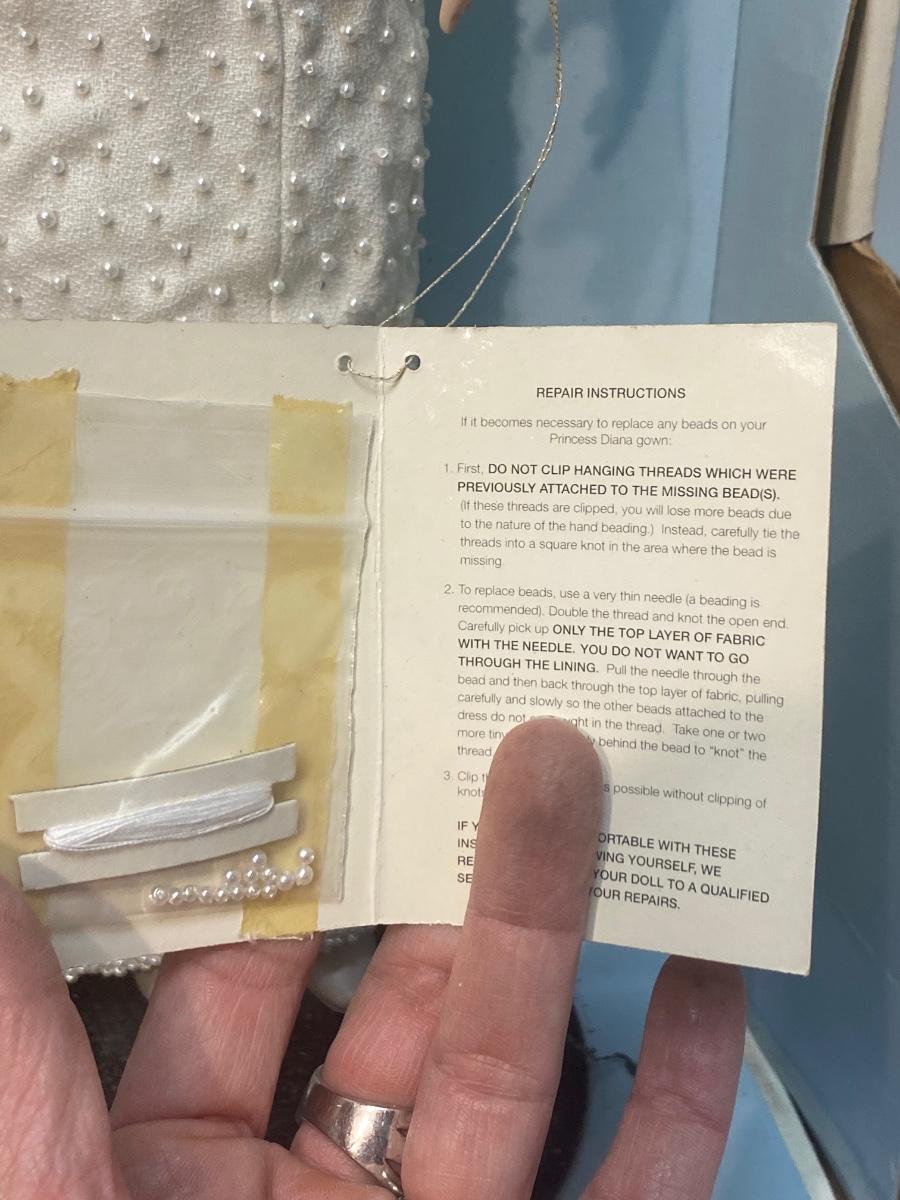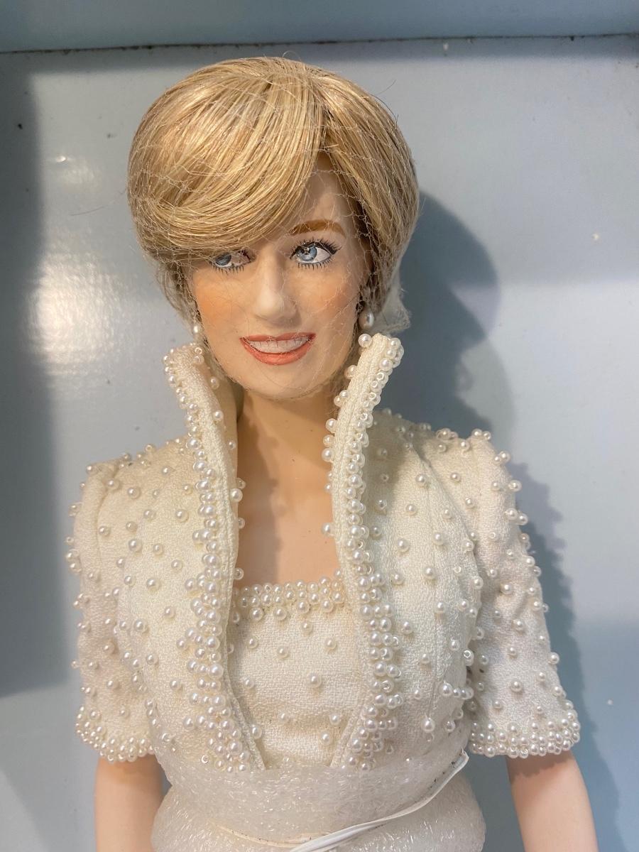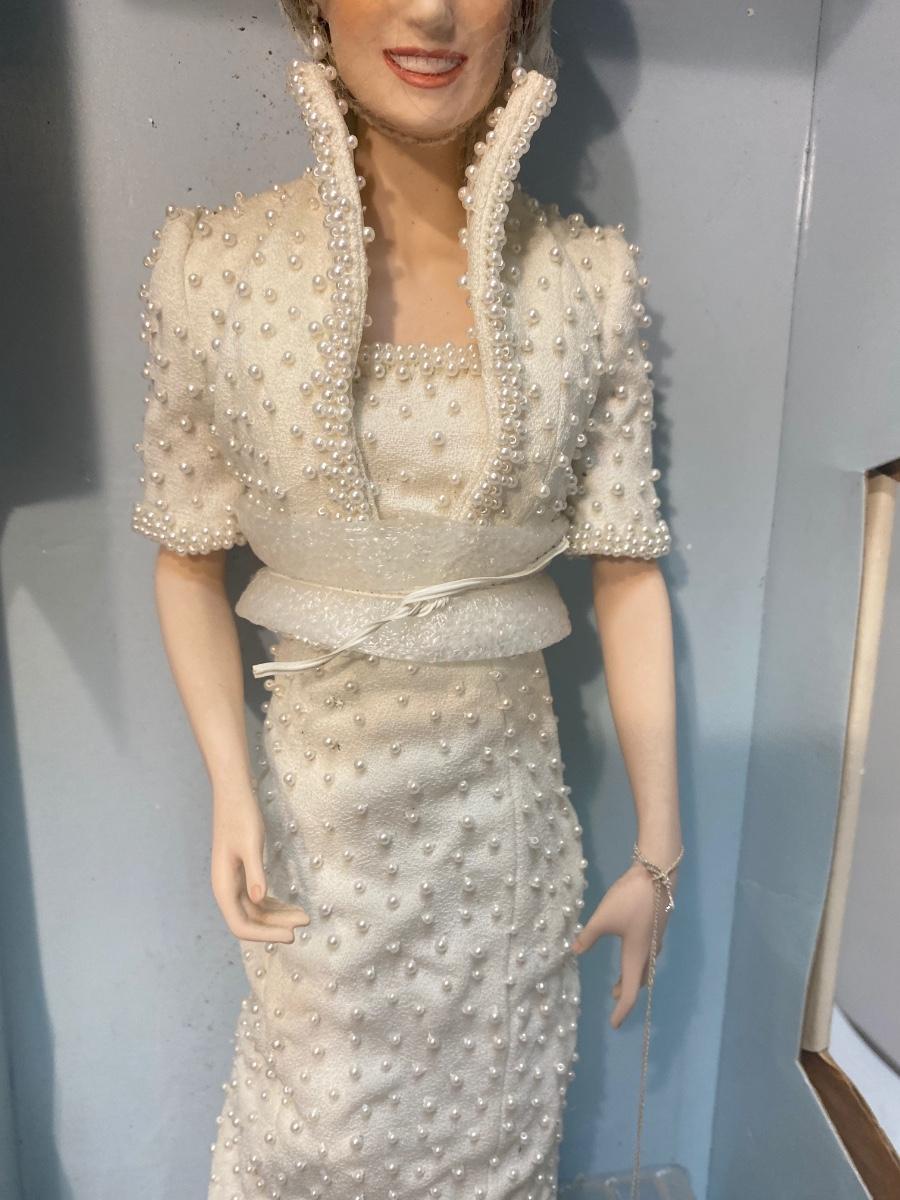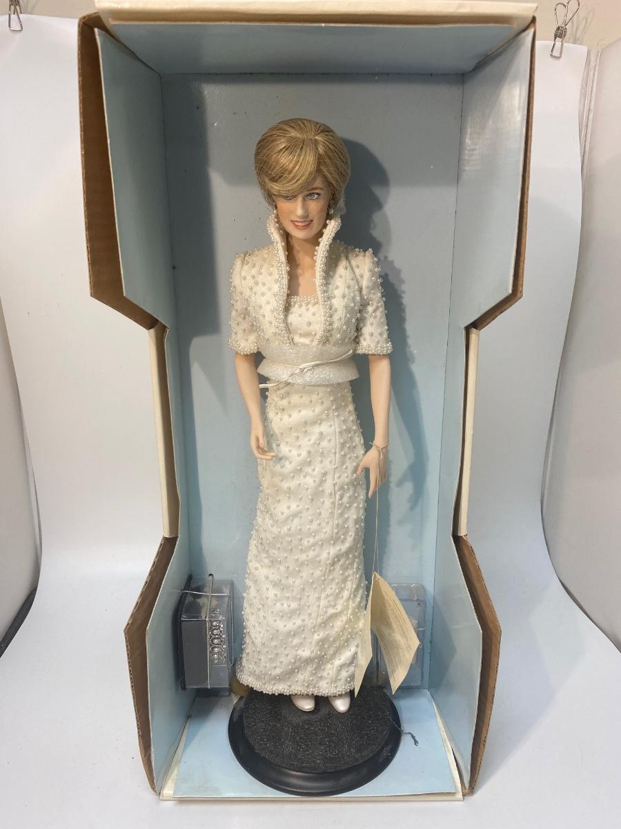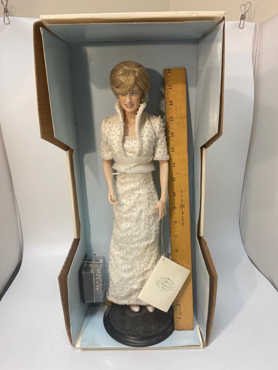 The Franklin Mint Diana, Princess of Wales Porcelain Collector Doll. Still attached to box, never removed but missing part of box. In good condition, light dust. Looks to have all accessories included. About 18" size doll.