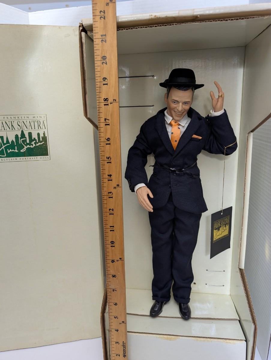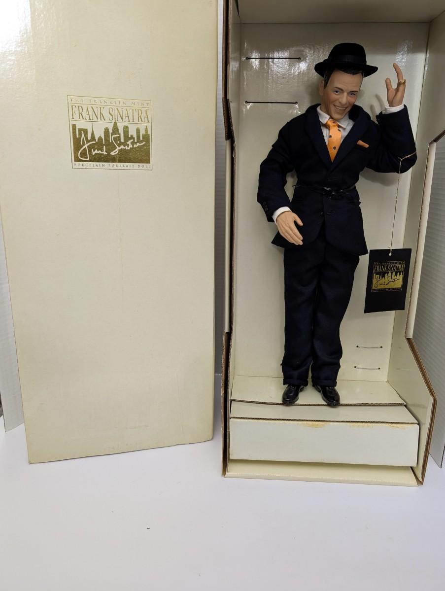 Frank Sinatra doll, Franklin Mint collectible, porcelain portrait doll, Sinatra memorabilia, vintage collectible doll, entertainer figure, boxed collectible, damaged finger, music legend collectible, classic crooner memorabilia