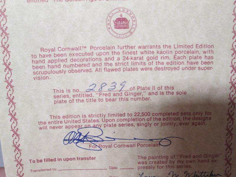 Approximately 9 and 1/4 in Fred & Ginger are from a collector series of six plates this is the third in the series of the golden age of Cinema the plate is number 2839 of the limited edition of 22500