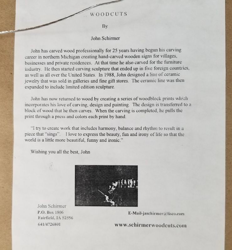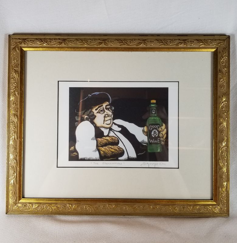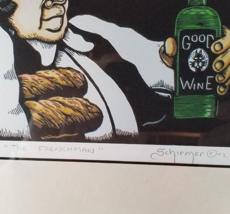 "The Frenchman" is a woodblock print which has been hand colored and signed by listed artist John Schirmer. It is nicely framed. A full description is attached to the back. Overall framed size is 16-inches tall X 13-inches wide. It would make a fun addition to your kitchen or bar area. Very good and ready to hang condition.