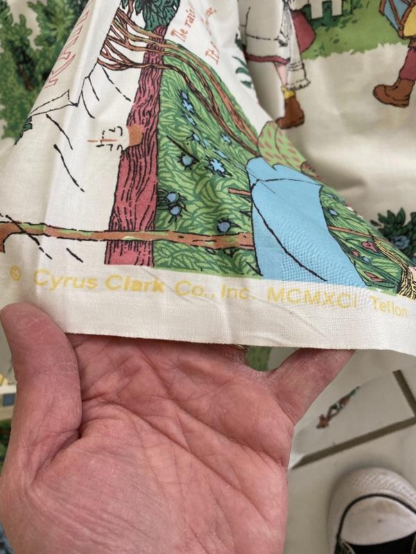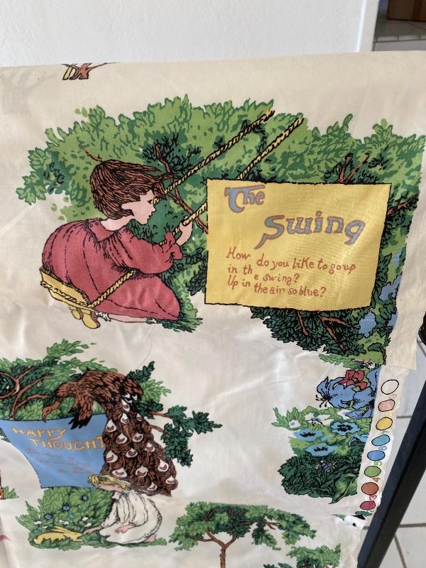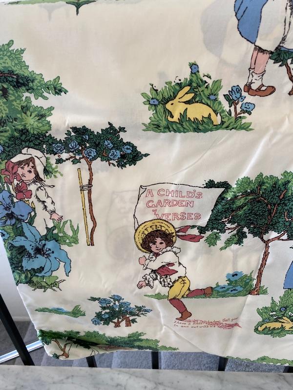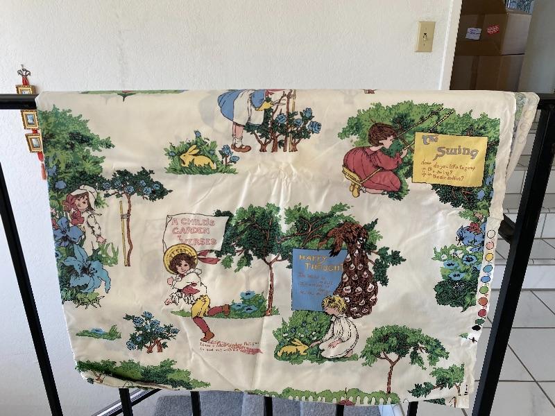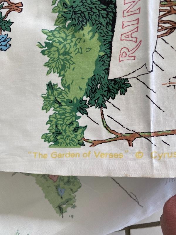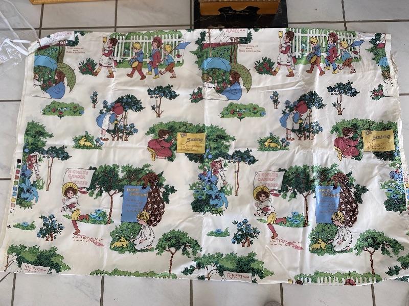 The Garden of Versus patterned fabric material from Cyrus Clark Co. 1991. Almost 57" wide and probably twice that in length. Features different images of Victorian children playing with little versus/quotes. Good condition.