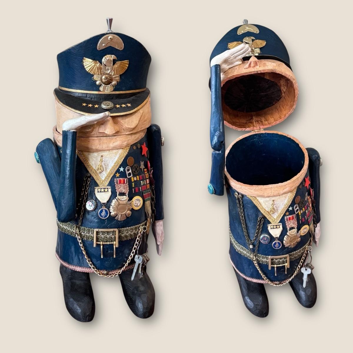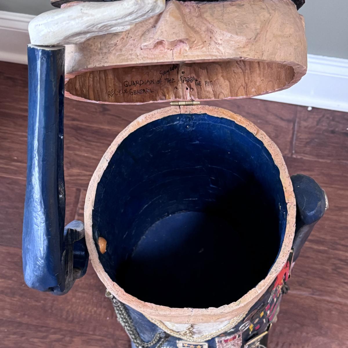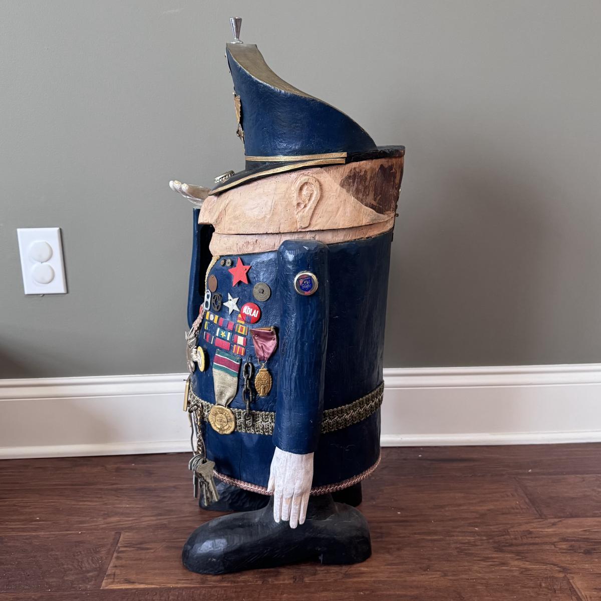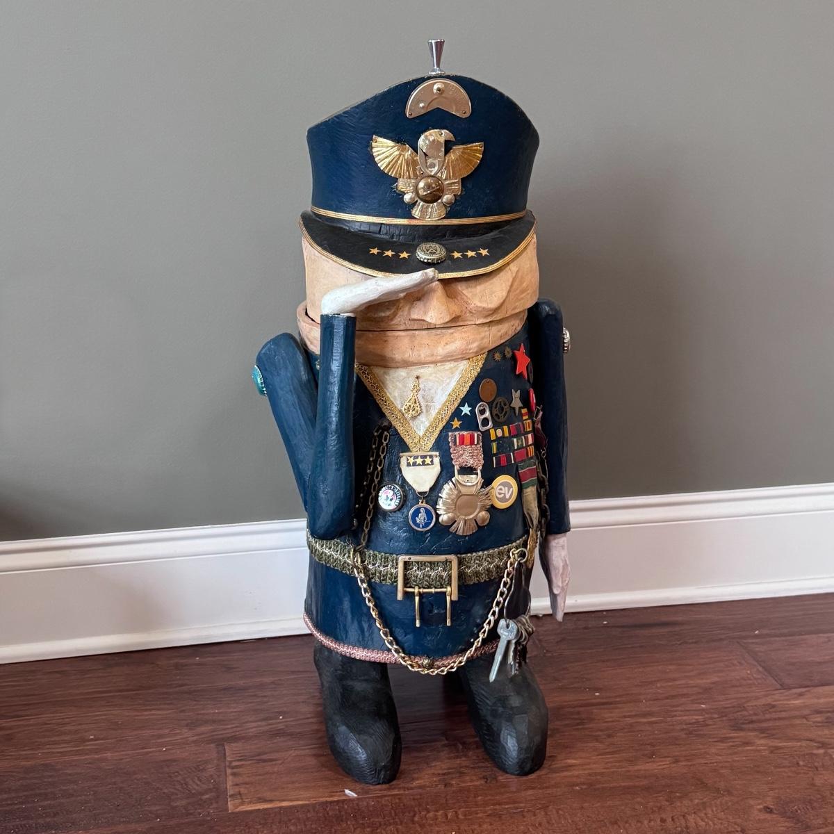 Folk art style carved sculpture of “The General” by Chicago, Illinois area artist George Suyeoka. The sculpture is made of wood and measures 12” x 11” x 26”H and opens up to a storage compartment. Inside reads "Gaudian of the Garbage Pit Recycle General-Suyeoka." You’ll find several pins and keys on the sculpture - see picture included. Shipping available. Shipping certain items can be costly. We suggest contacting our preferred local shipping provider, Postage Express, with dimensions and getting an estimate before bidding: (828) 255-9250 or shipping@postageexpressnc.com