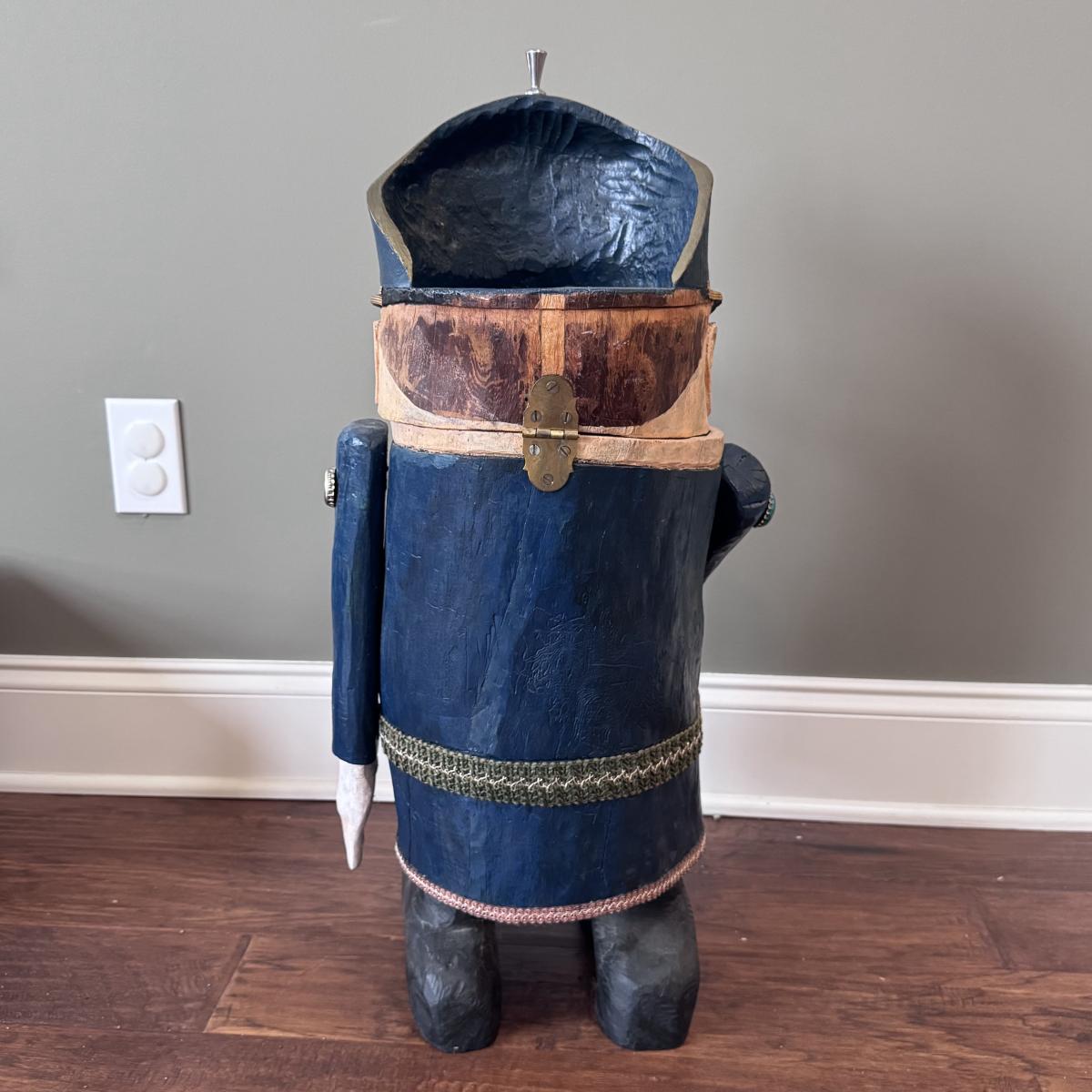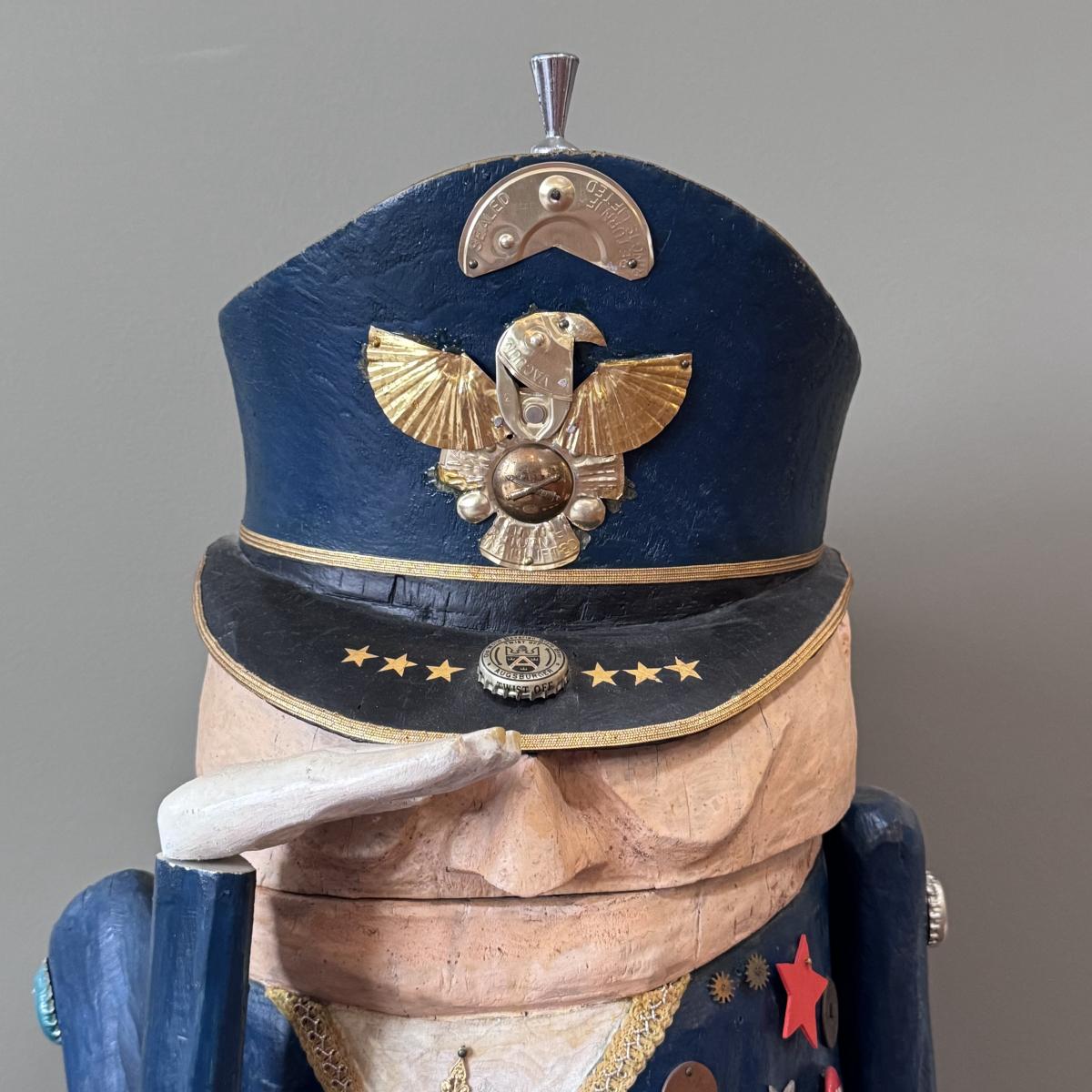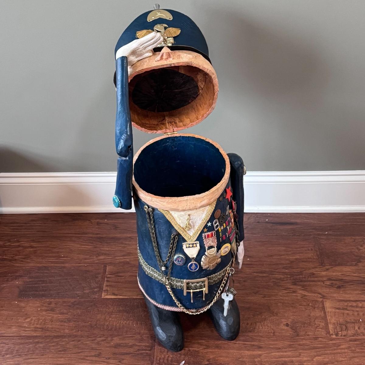 Folk art style carved sculpture of “The General” by Chicago, Illinois area artist George Suyeoka. The sculpture is made of wood and measures 12” x 11” x 26”H and opens up to a storage compartment. Inside reads "Gaudian of the Garbage Pit Recycle General-Suyeoka." You’ll find several pins and keys on the sculpture - see picture included. Shipping available. Shipping certain items can be costly. We suggest contacting our preferred local shipping provider, Postage Express, with dimensions and getting an estimate before bidding: (828) 255-9250 or shipping@postageexpressnc.com