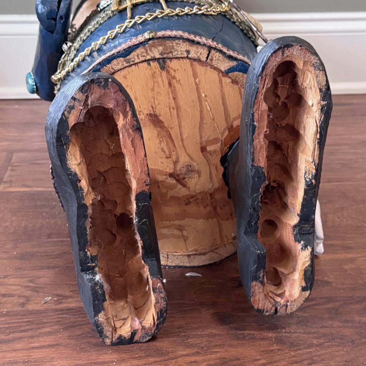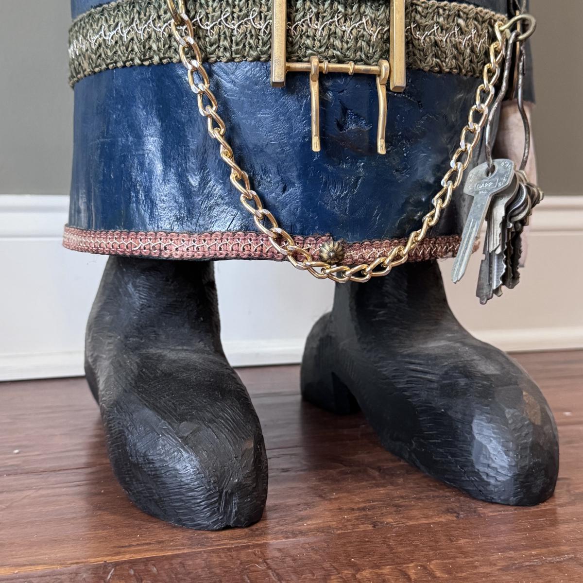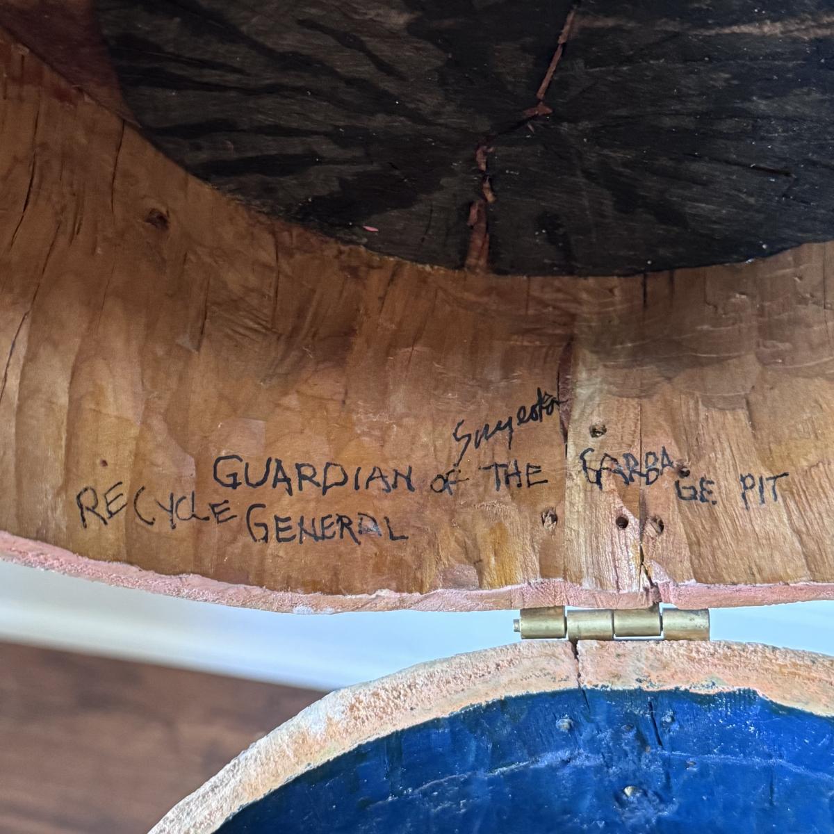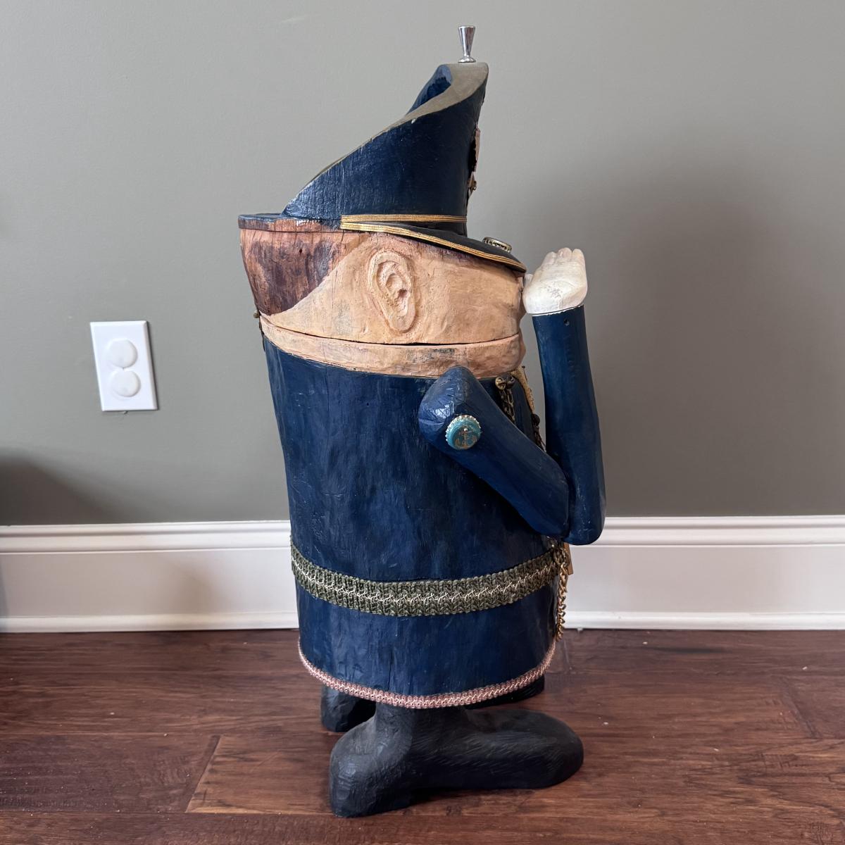 Folk art style carved sculpture of “The General” by Chicago, Illinois area artist George Suyeoka. The sculpture is made of wood and measures 12” x 11” x 26”H and opens up to a storage compartment. Inside reads "Gaudian of the Garbage Pit Recycle General-Suyeoka." You’ll find several pins and keys on the sculpture - see picture included. Shipping available. Shipping certain items can be costly. We suggest contacting our preferred local shipping provider, Postage Express, with dimensions and getting an estimate before bidding: (828) 255-9250 or shipping@postageexpressnc.com