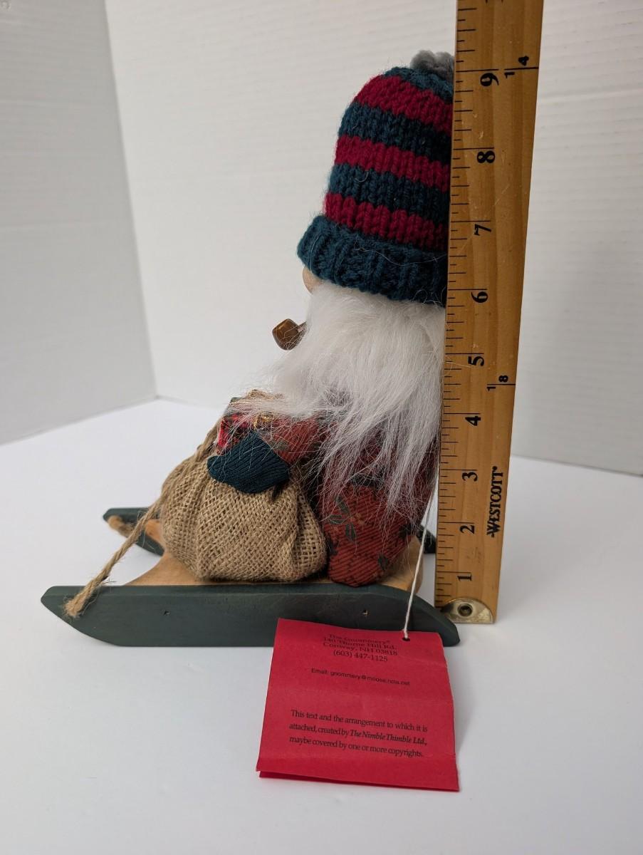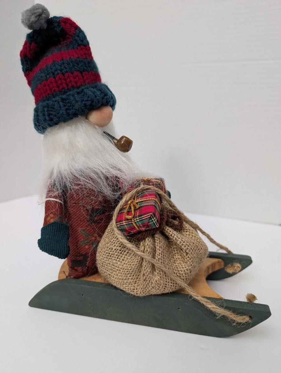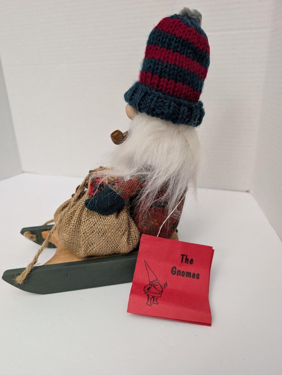 This handcrafted Christmas gnome from The Gnommery features a whimsical design with a long white beard, striped knit hat, and tiny pipe. Seated on a rustic wooden sled with a burlap gift sack tied in plaid ribbon, he brings a touch of Nordic charm and folk art magic to holiday décor. A unique collectible piece created by The Nimble Thimble Ltd, perfect for shelves, mantels, or festive displays.