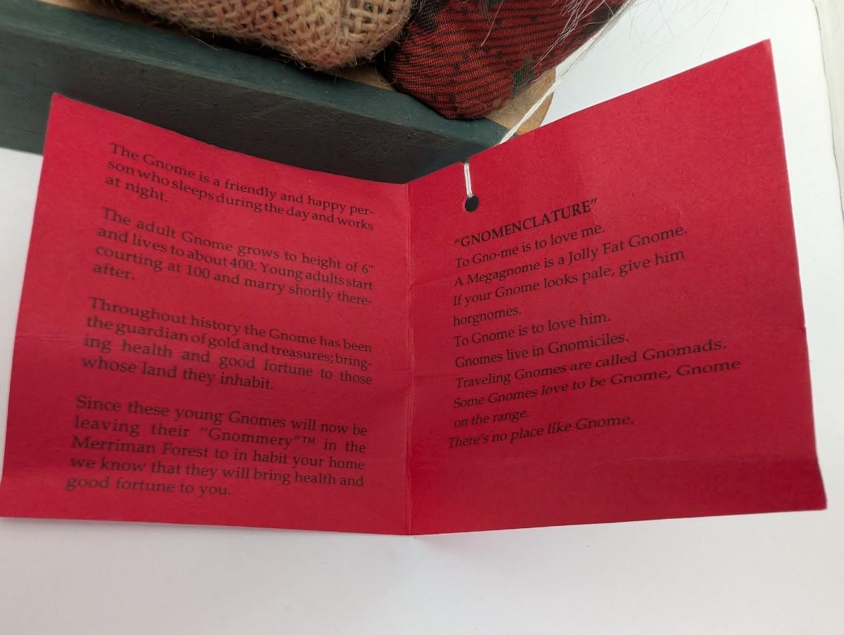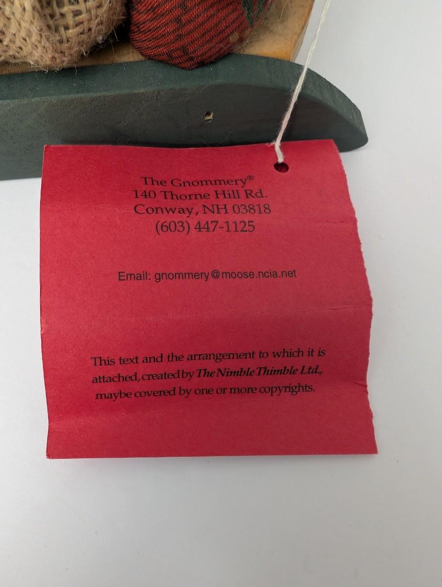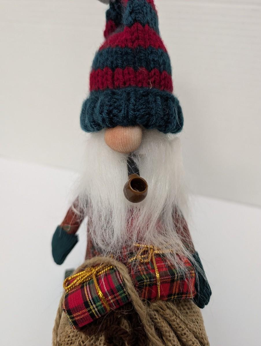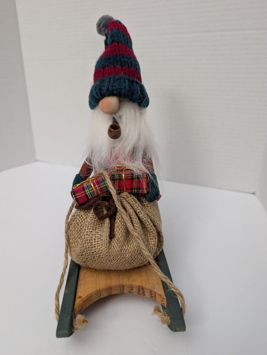 This handcrafted Christmas gnome from The Gnommery features a whimsical design with a long white beard, striped knit hat, and tiny pipe. Seated on a rustic wooden sled with a burlap gift sack tied in plaid ribbon, he brings a touch of Nordic charm and folk art magic to holiday décor. A unique collectible piece created by The Nimble Thimble Ltd, perfect for shelves, mantels, or festive displays.