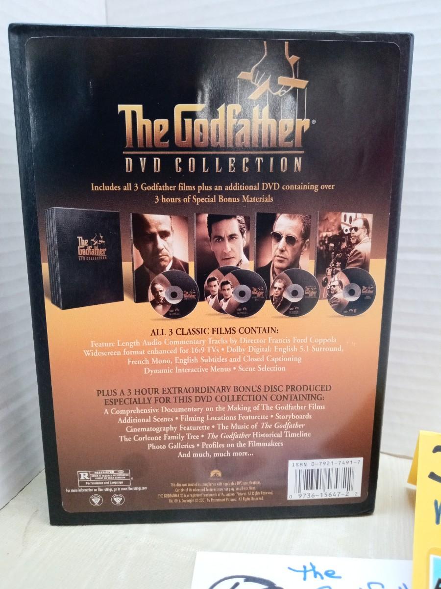 Includes all 3 Godfather films plus an additional DVD Containing over 3 hours of Special BONUS Materials. Very Good Condition. See PHOTOS.
