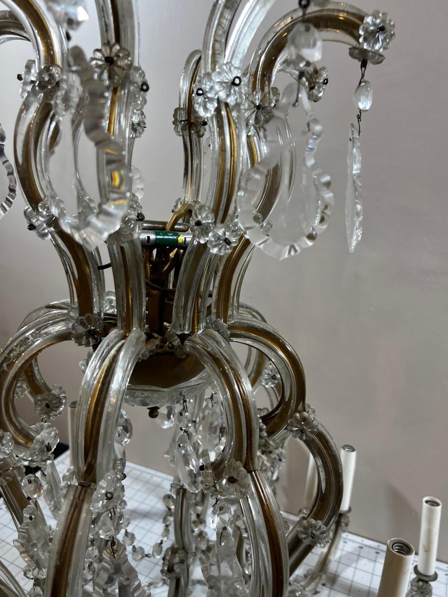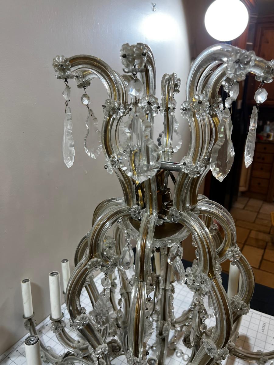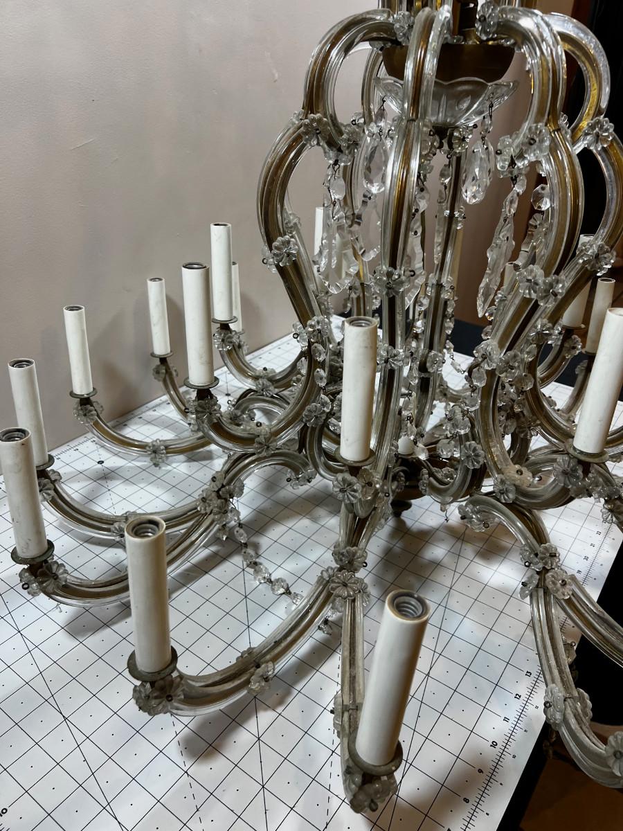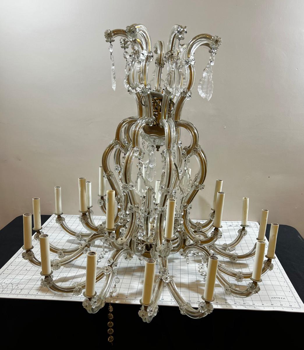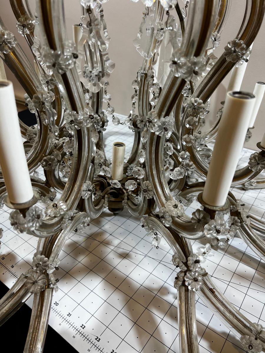 AWESOME! Has 24 Candle Light outlets. May or may not be missing Crystals but appears to have all of them (see photos). Its impressive regardless! TOO BIG TO SHIP. 27" Tall 32 Diameter HEAVY !