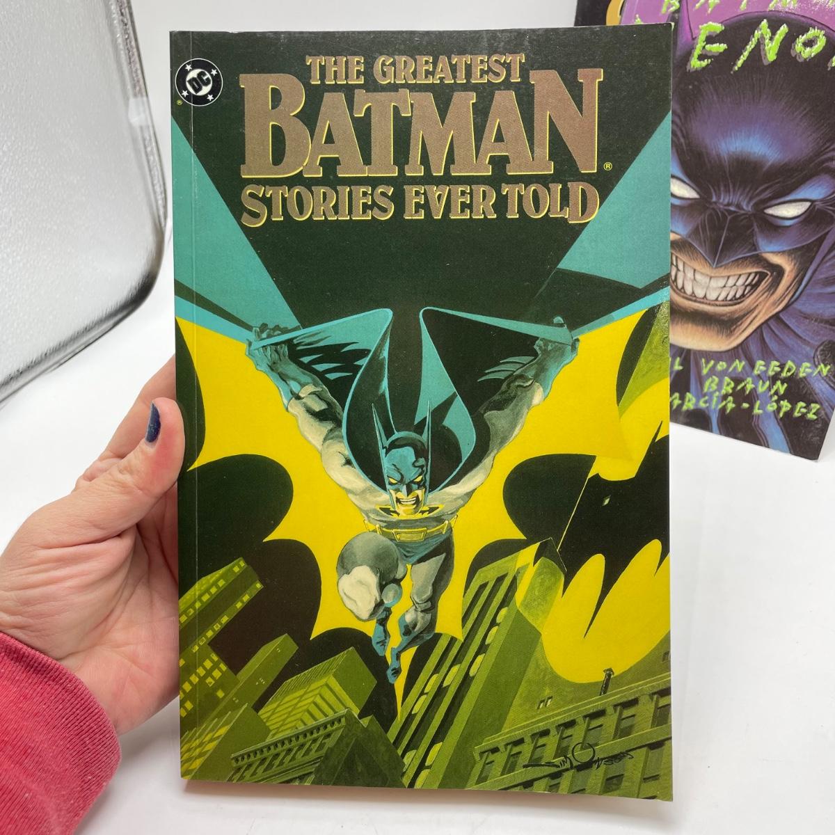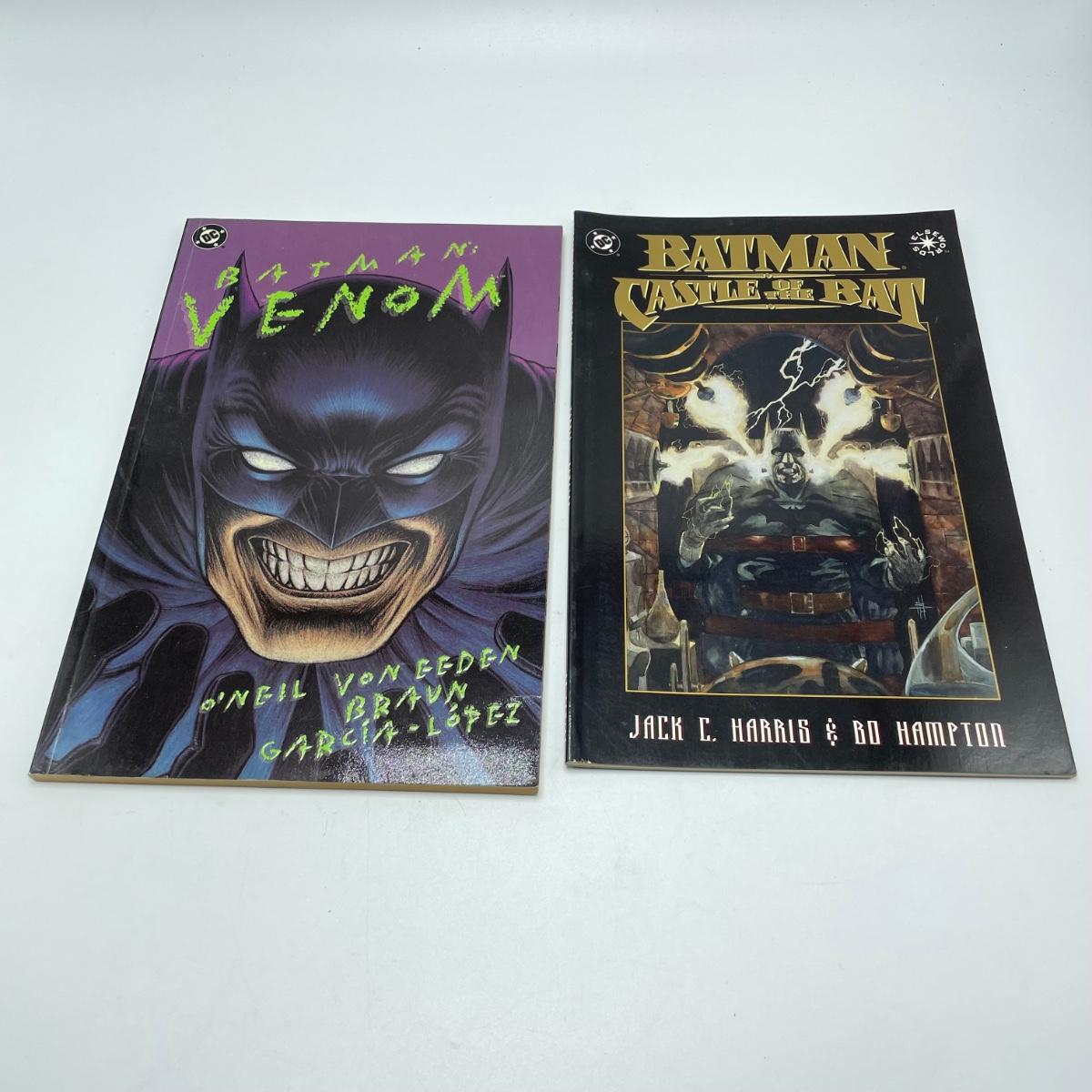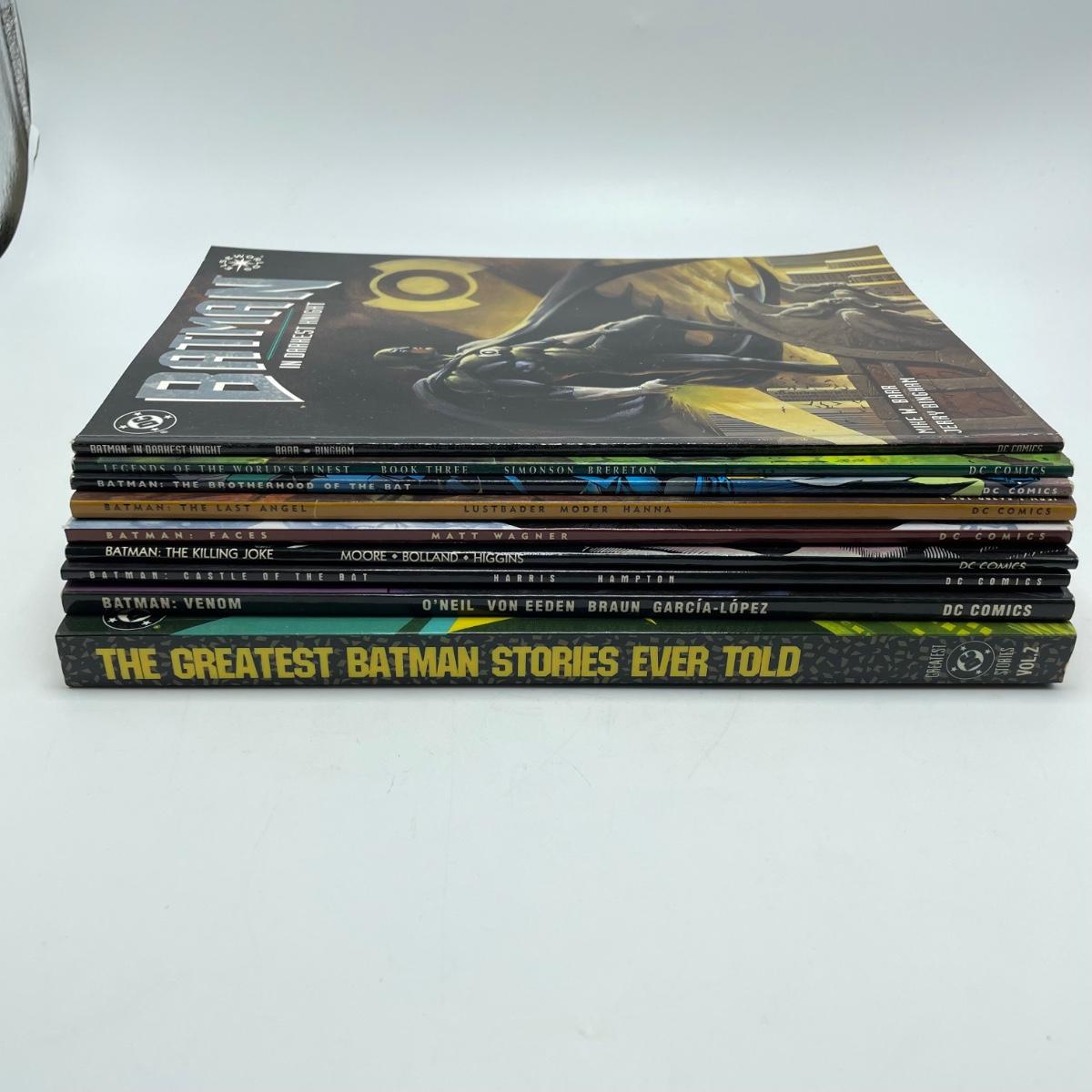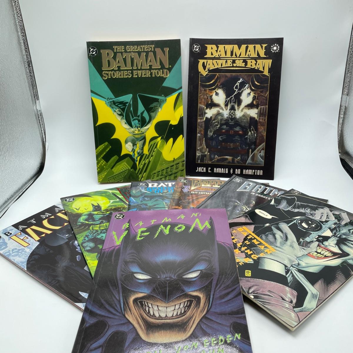 Nine Batman paperback novels from DC Comics by various artists. Lot includes The Greatest Batman Stories Ever Told Vol 2, Batman: Venom, Batman: Castle of the Bat, Batman: The Killing Joke, Batman: Faces, Batman: The Last Angel, Batman: The Brotherhood of the Bat, Legends of the World’s Finest and Batman: In Darkest Knight. See images for printing dates and artists. Items are sold as-is. No returns or refunds. Please bid accordingly.