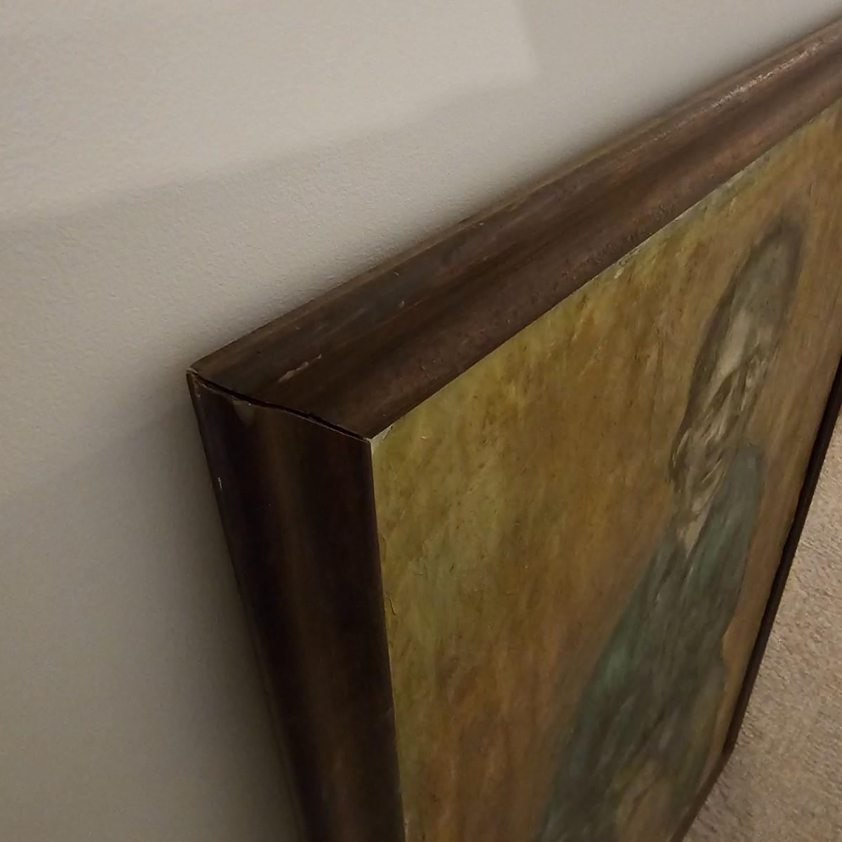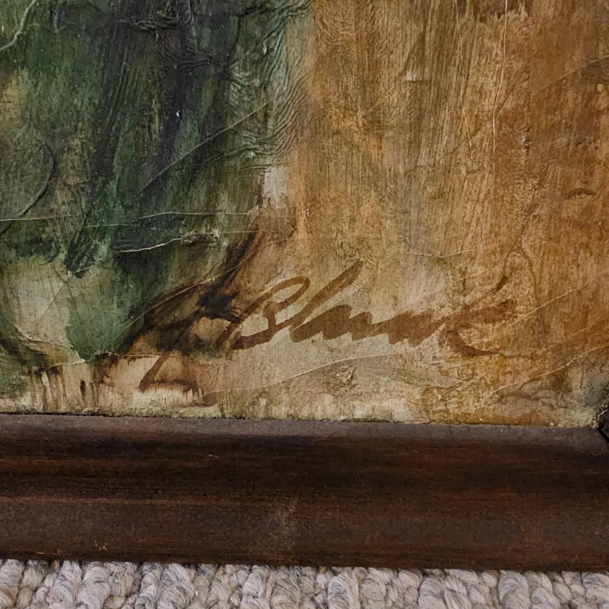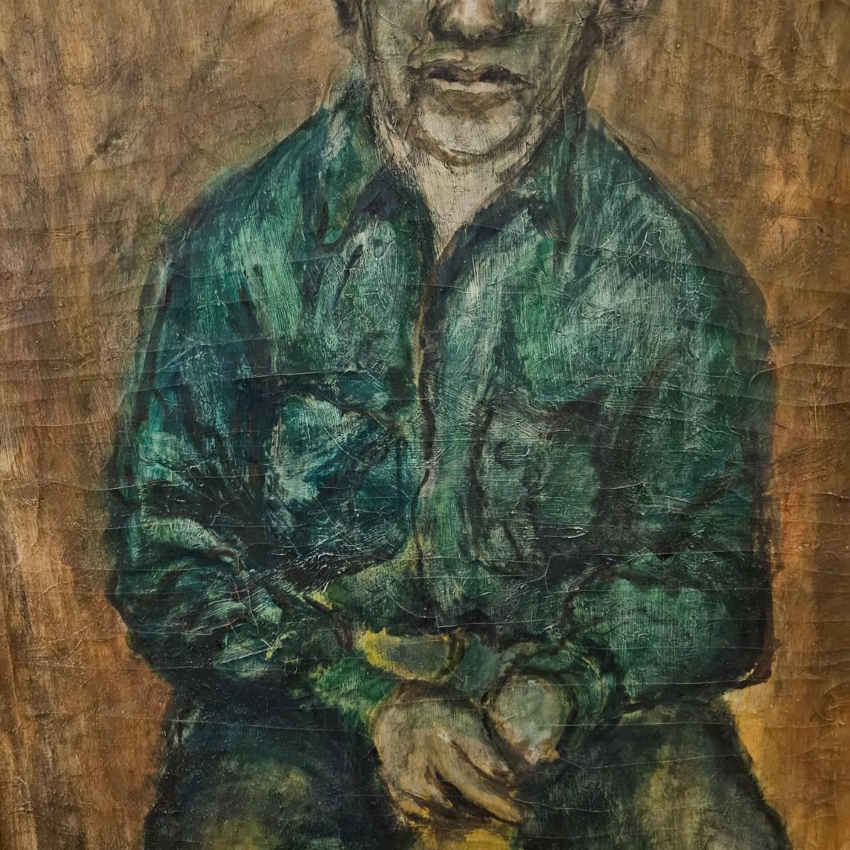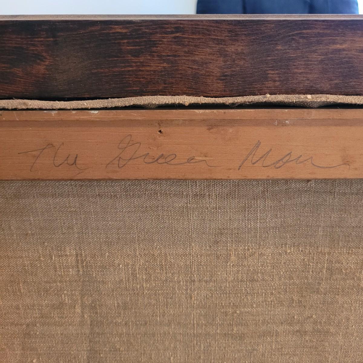 A somber faced man sits quietly with his hands folded; all clad in green. This oil on canvas piece is wood framed, measures 33.5" x 51"H. Cracking in the pigment is present throughout as some older paintings tend to do. Signed by artist on front and back. See photos for details. Shipping available. Shipping can be costly. We suggest contacting our preferred local shipping provider, Postage Express, with dimensions and getting an estimate before bidding: (828) 255-9250 or shipping@postageexpressnc.com.