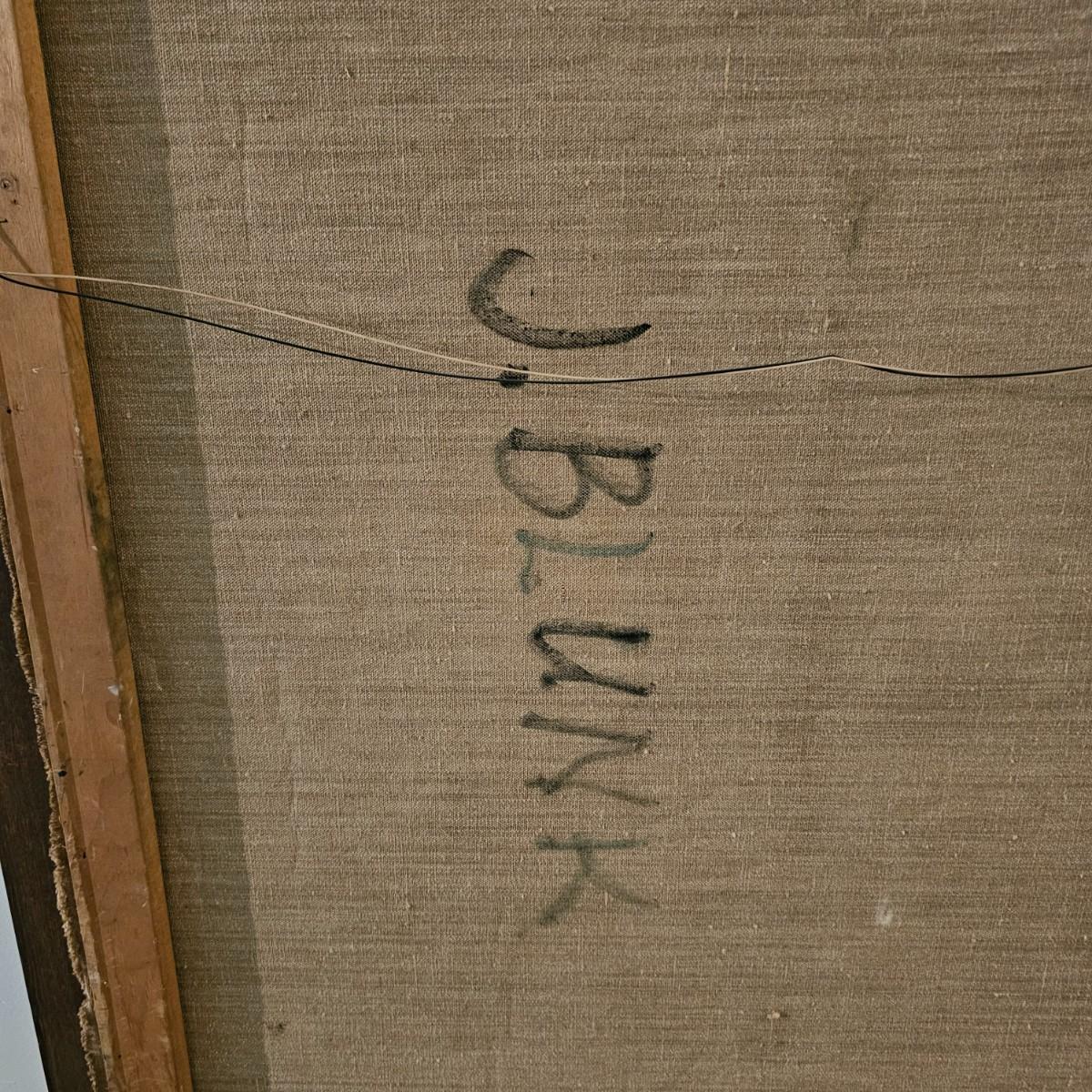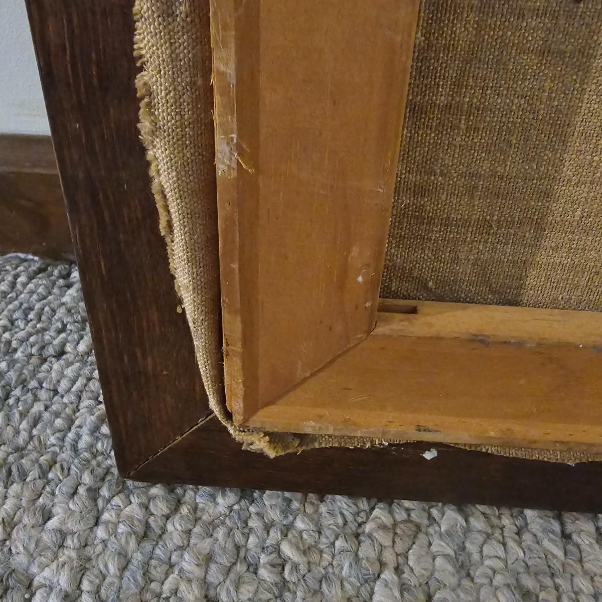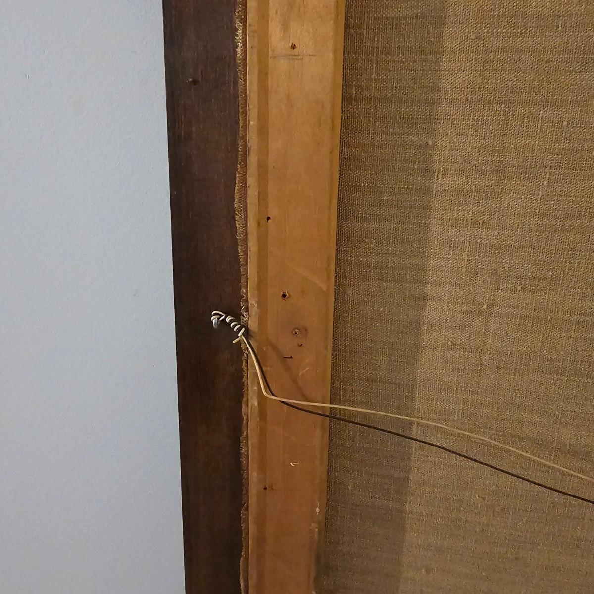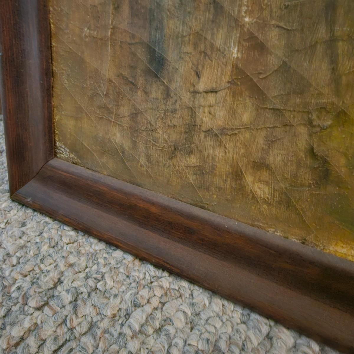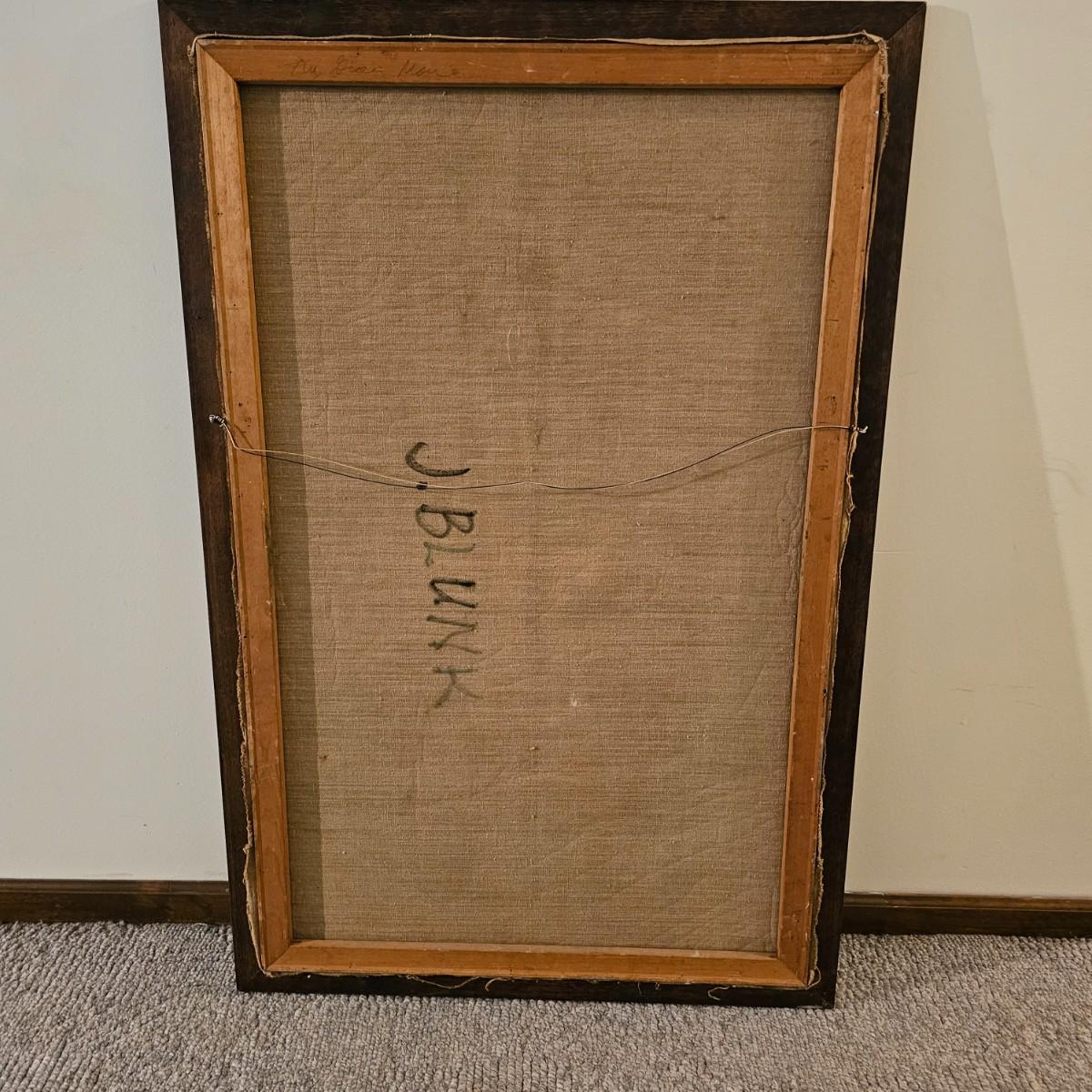 A somber faced man sits quietly with his hands folded; all clad in green. This oil on canvas piece is wood framed, measures 33.5" x 51"H. Cracking in the pigment is present throughout as some older paintings tend to do. Signed by artist on front and back. See photos for details. Shipping available. Shipping can be costly. We suggest contacting our preferred local shipping provider, Postage Express, with dimensions and getting an estimate before bidding: (828) 255-9250 or shipping@postageexpressnc.com.