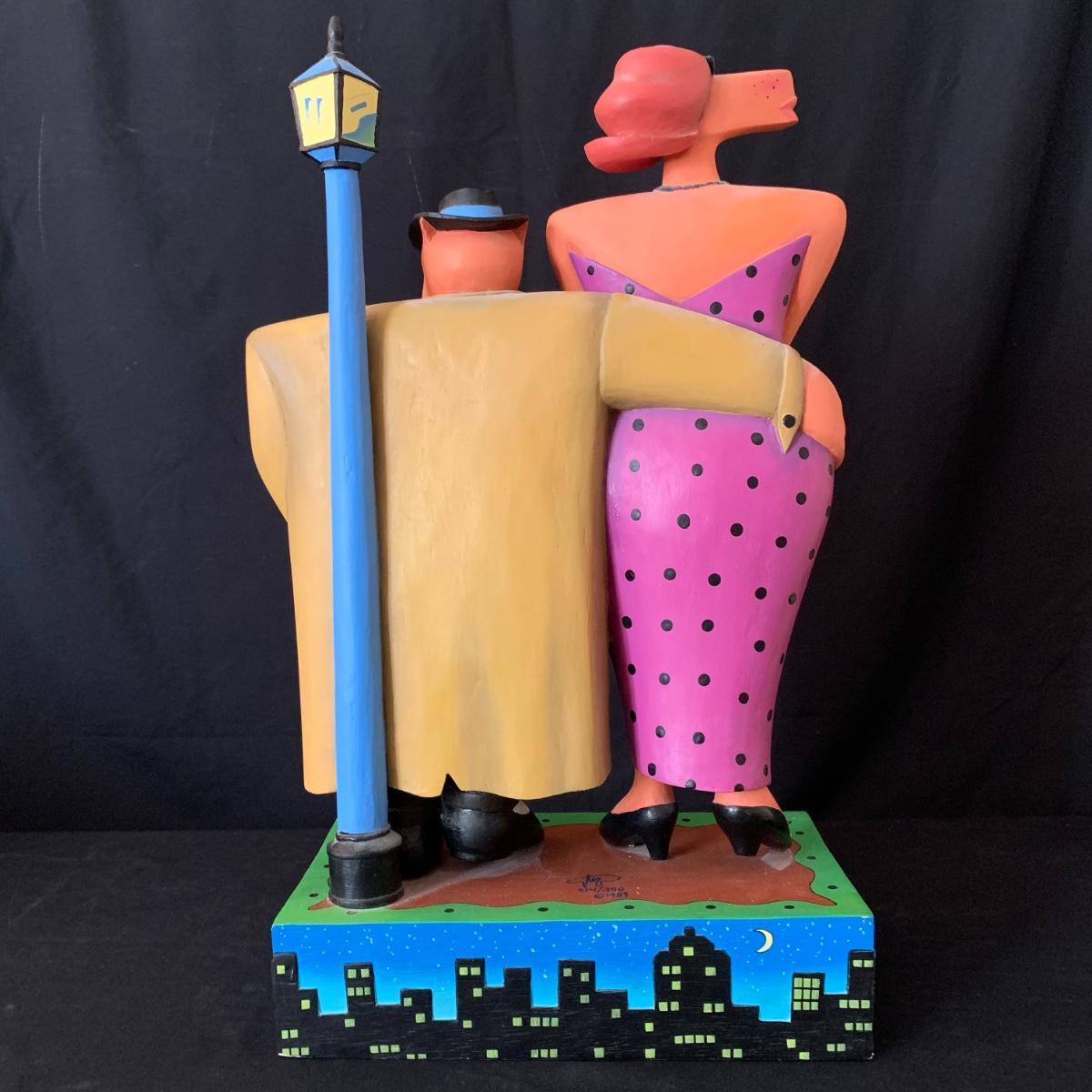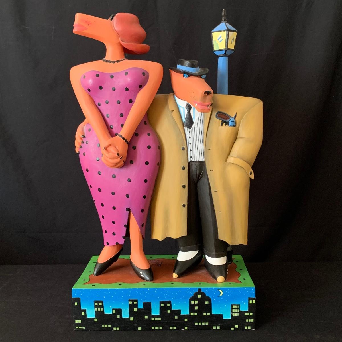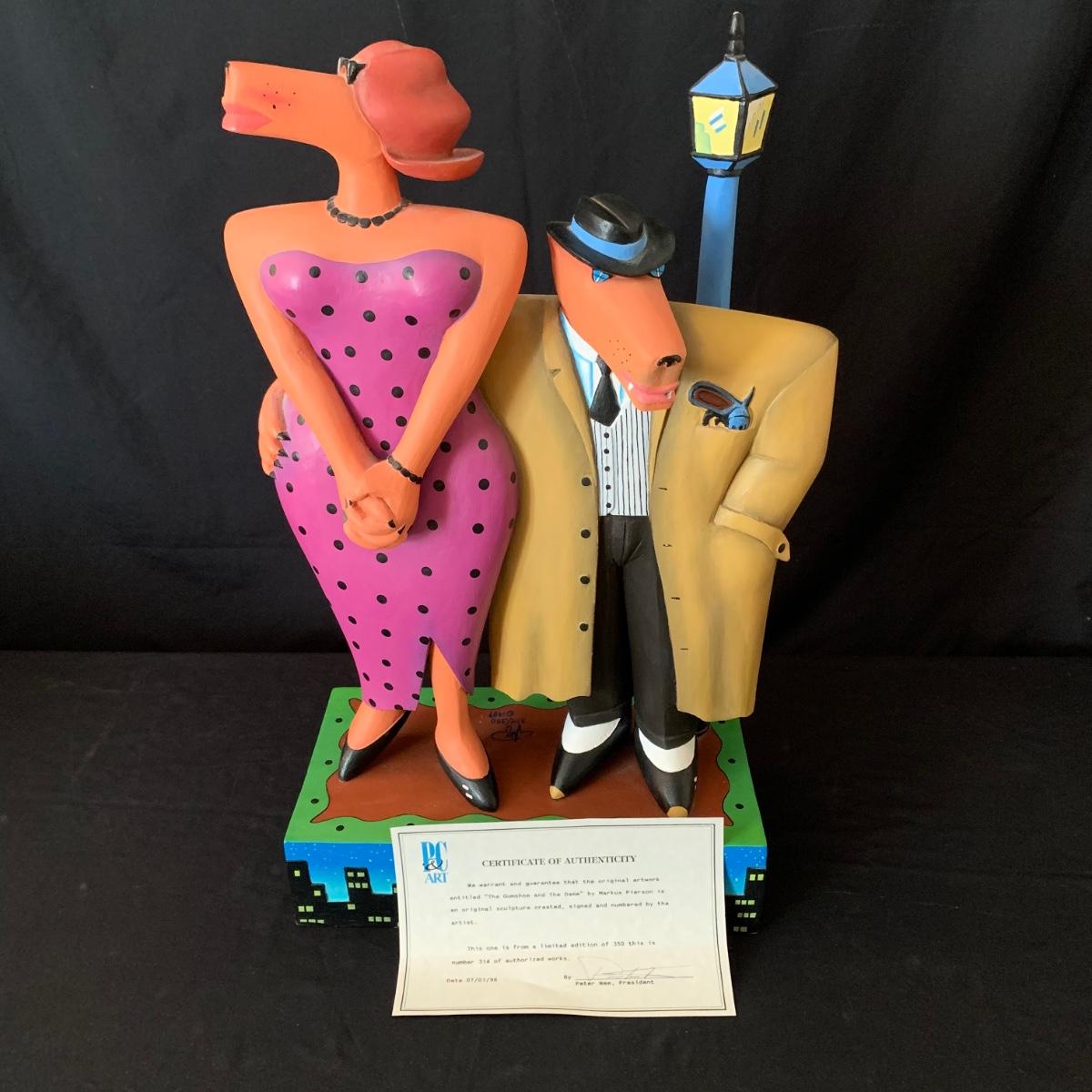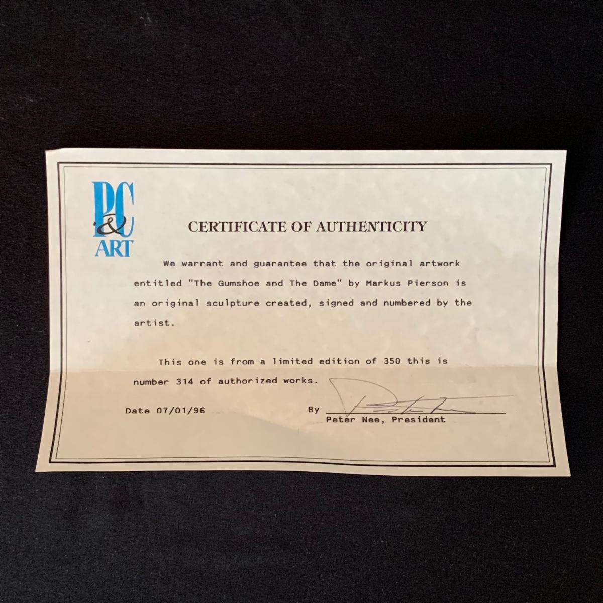 Sculpture titled “The Gumshoe and The Dame” by Markus Pierson. Sculpture comes with a Certificate of Authenticity stating that it is an original sculpture created, signed, and numbered by the artist. It appears to be made of resin and wood. It is hand-painted and it measures 12.5” x 6.75” x 22.25”. There is a hole is the “gumshoe’s” mouth where it looks like a cigarette is missing; see photos.