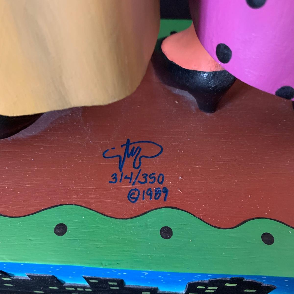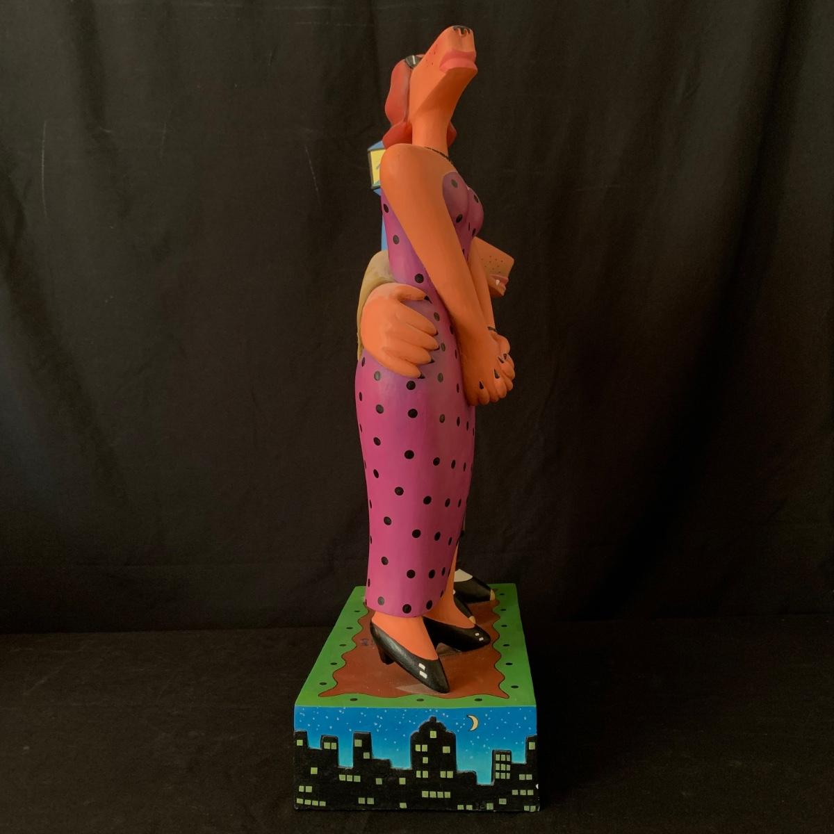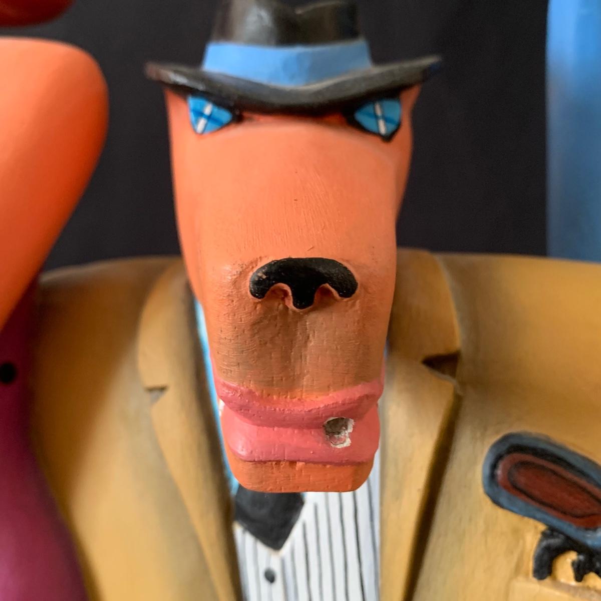 Sculpture titled “The Gumshoe and The Dame” by Markus Pierson. Sculpture comes with a Certificate of Authenticity stating that it is an original sculpture created, signed, and numbered by the artist. It appears to be made of resin and wood. It is hand-painted and it measures 12.5” x 6.75” x 22.25”. There is a hole is the “gumshoe’s” mouth where it looks like a cigarette is missing; see photos.