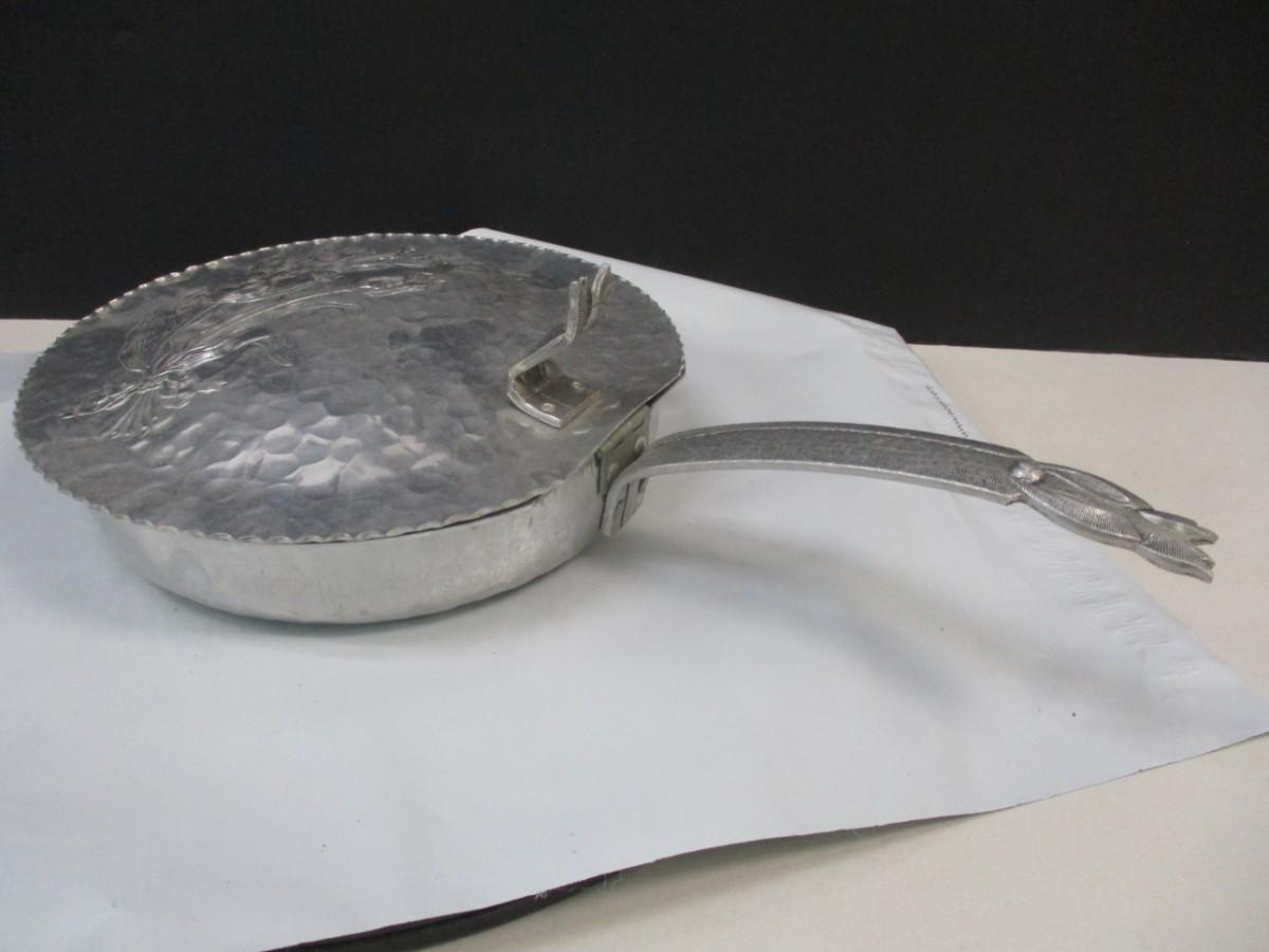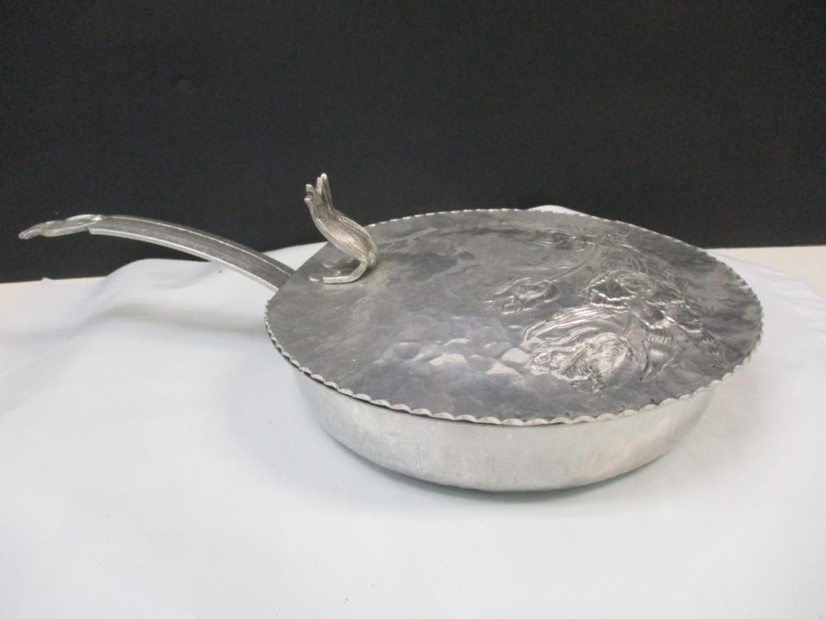 The Hand Wrought Creations by Rodney Kent Aluminum Silent Butler Crumb Catcher is a unique and beautifully crafted piece made of aluminum. This collectible metalware item not only serves its practical purpose of catching crumbs but also adds a touch of artistry to any table setting. The intricate design and quality craftsmanship make it a desirable addition for collectors or those looking to add a distinctive touch to their dining experience.