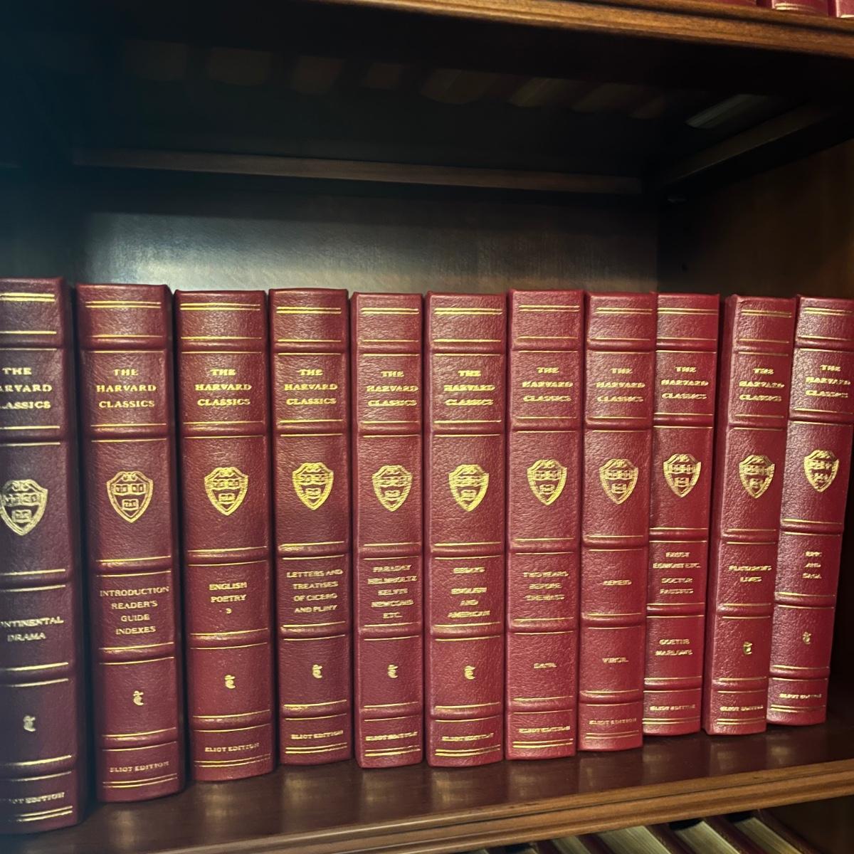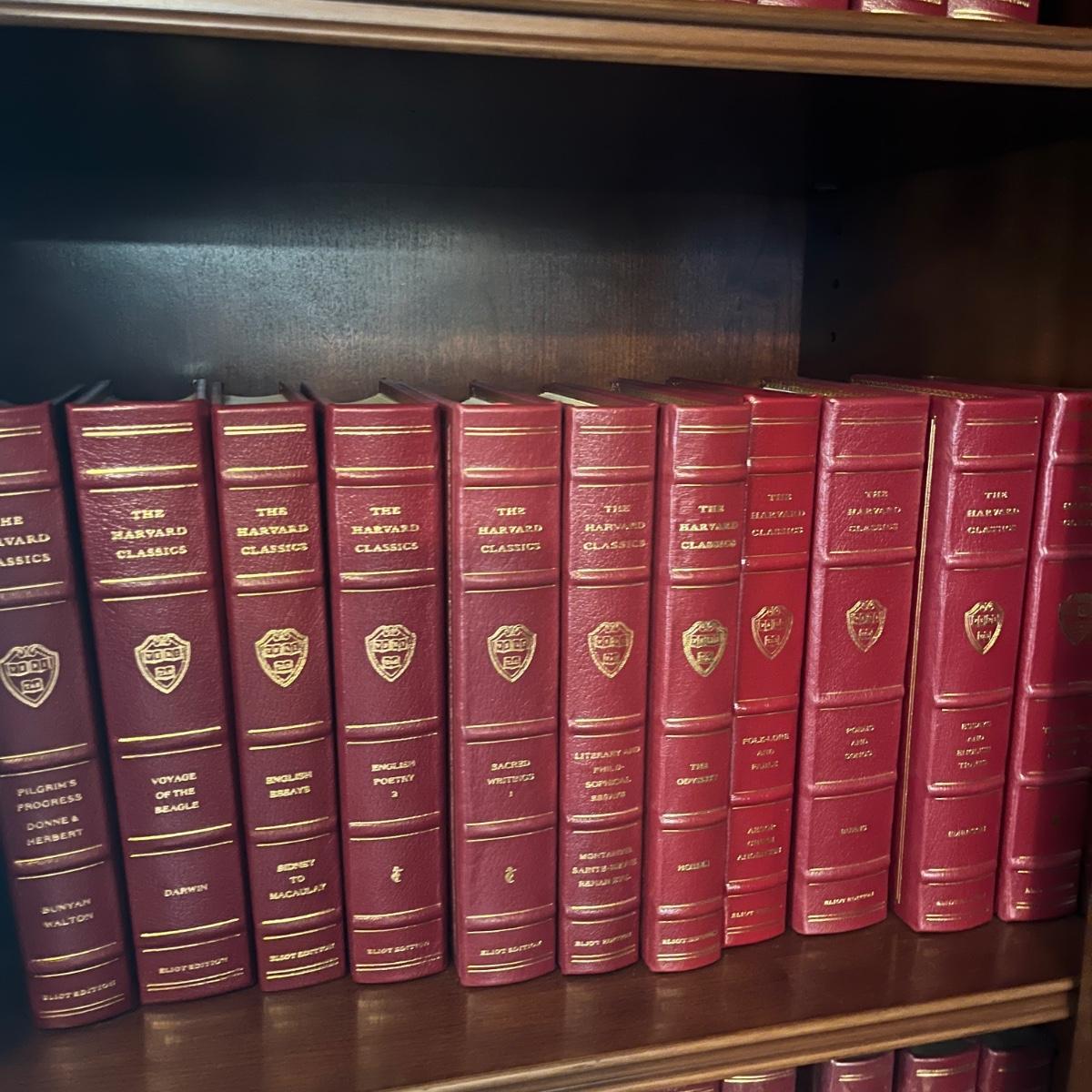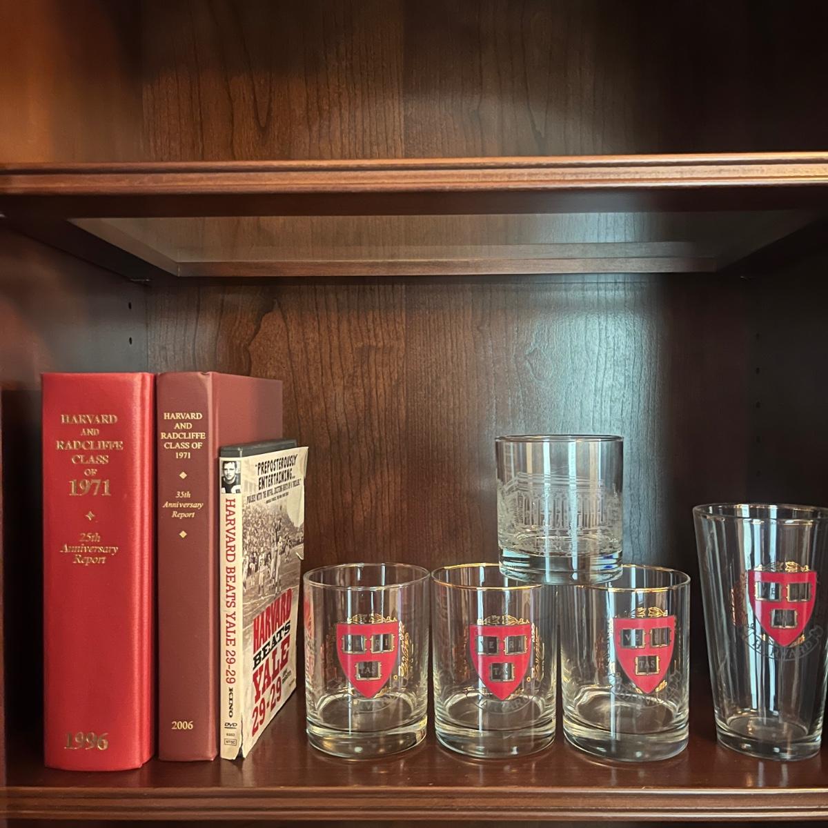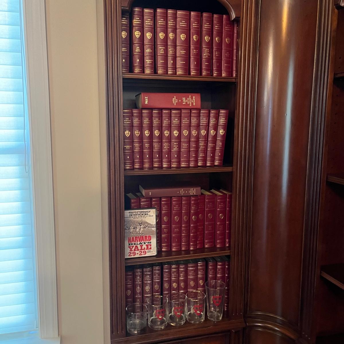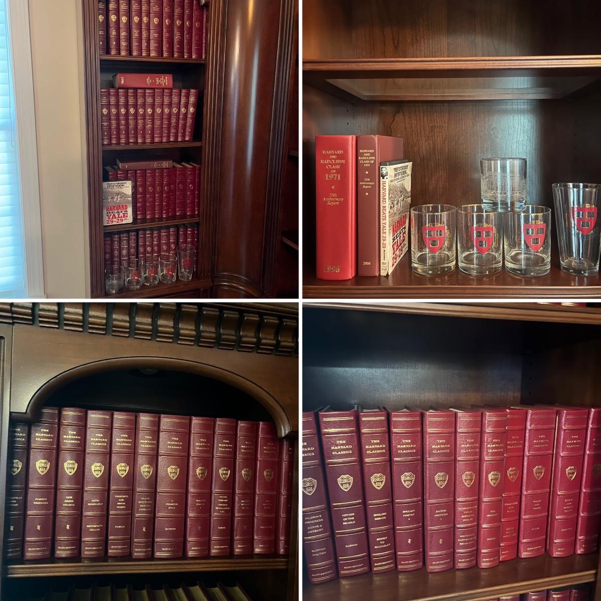 Lot includes over 40 The Harvard Classic leather bound books, five Harvard glasses, Harvard v Yale DVD and two Anniversary Reports. Bookcase not included.