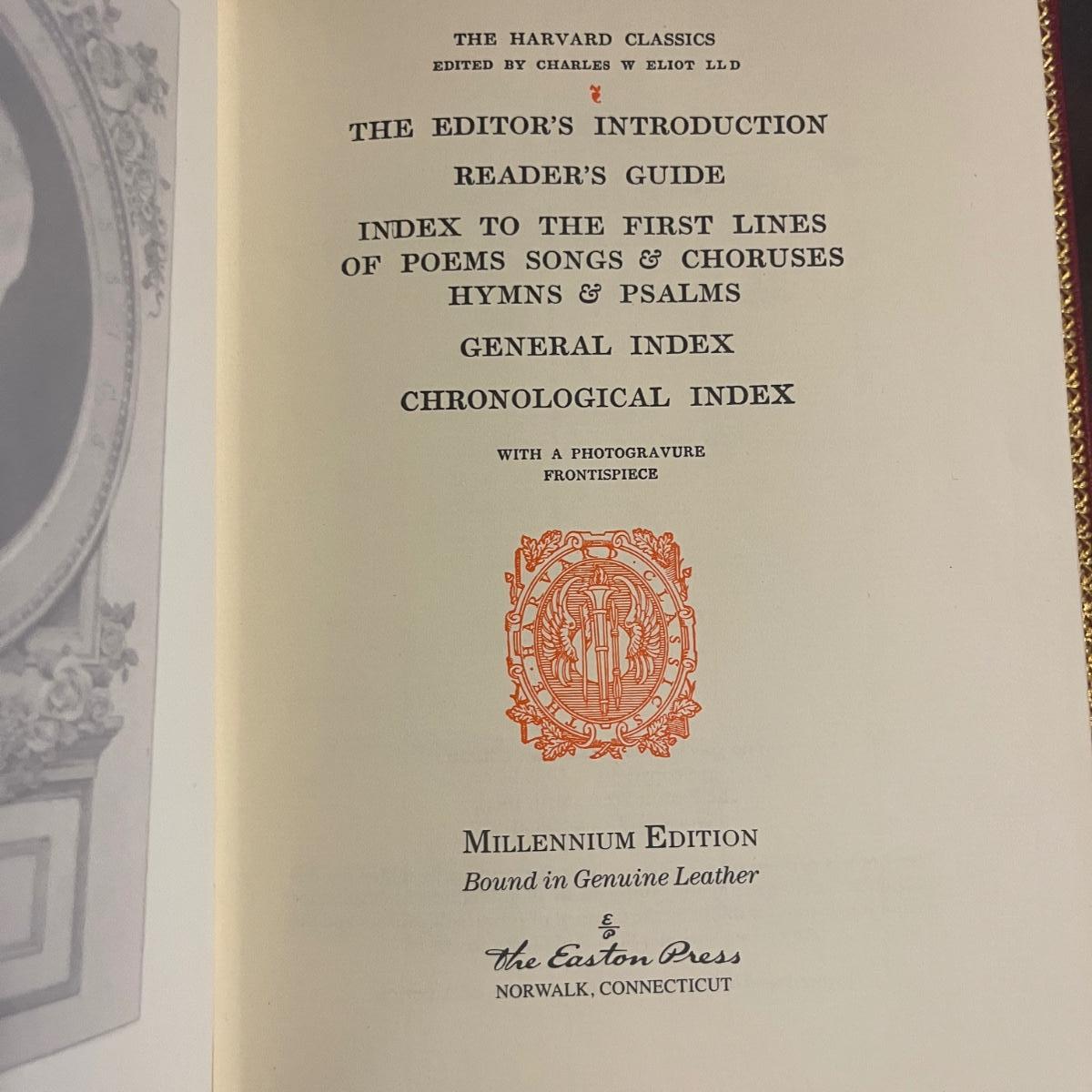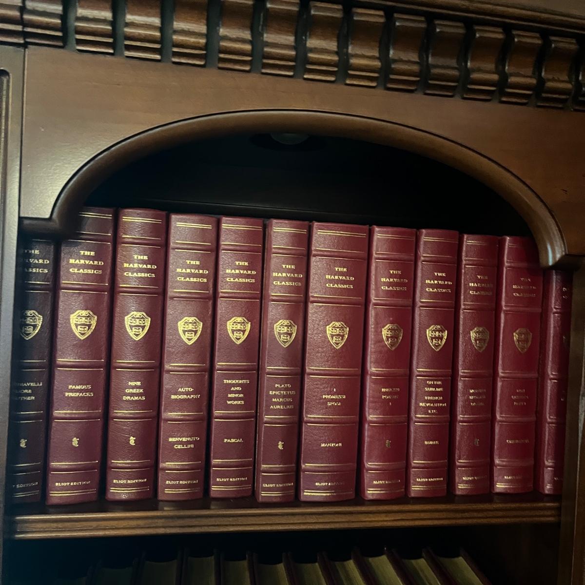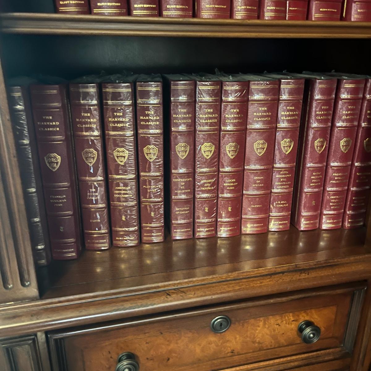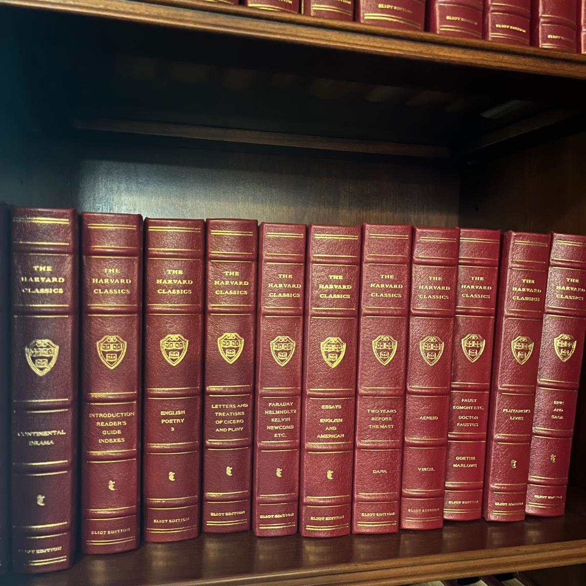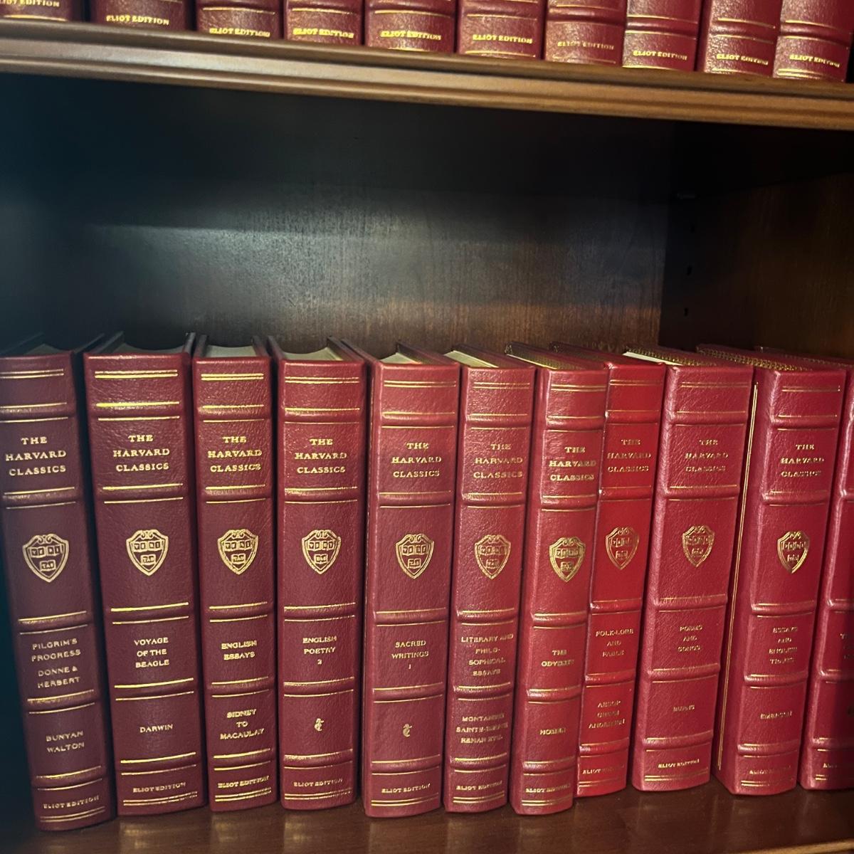 Lot includes over 40 The Harvard Classic leather bound books, five Harvard glasses, Harvard v Yale DVD and two Anniversary Reports. Bookcase not included.
