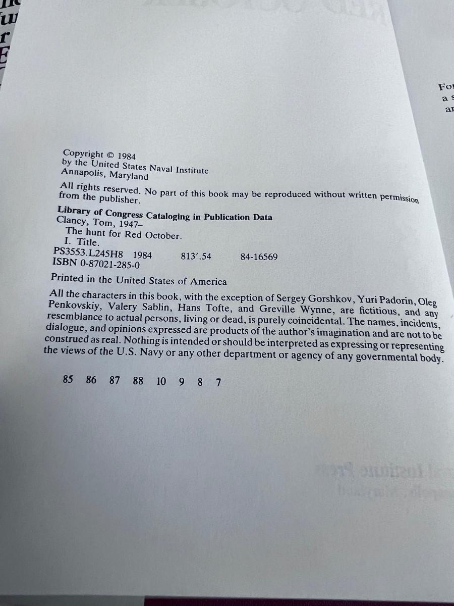 THE HUNT FOR RED OCTOBER, by Tom Clancy Possibly 1st Edition.