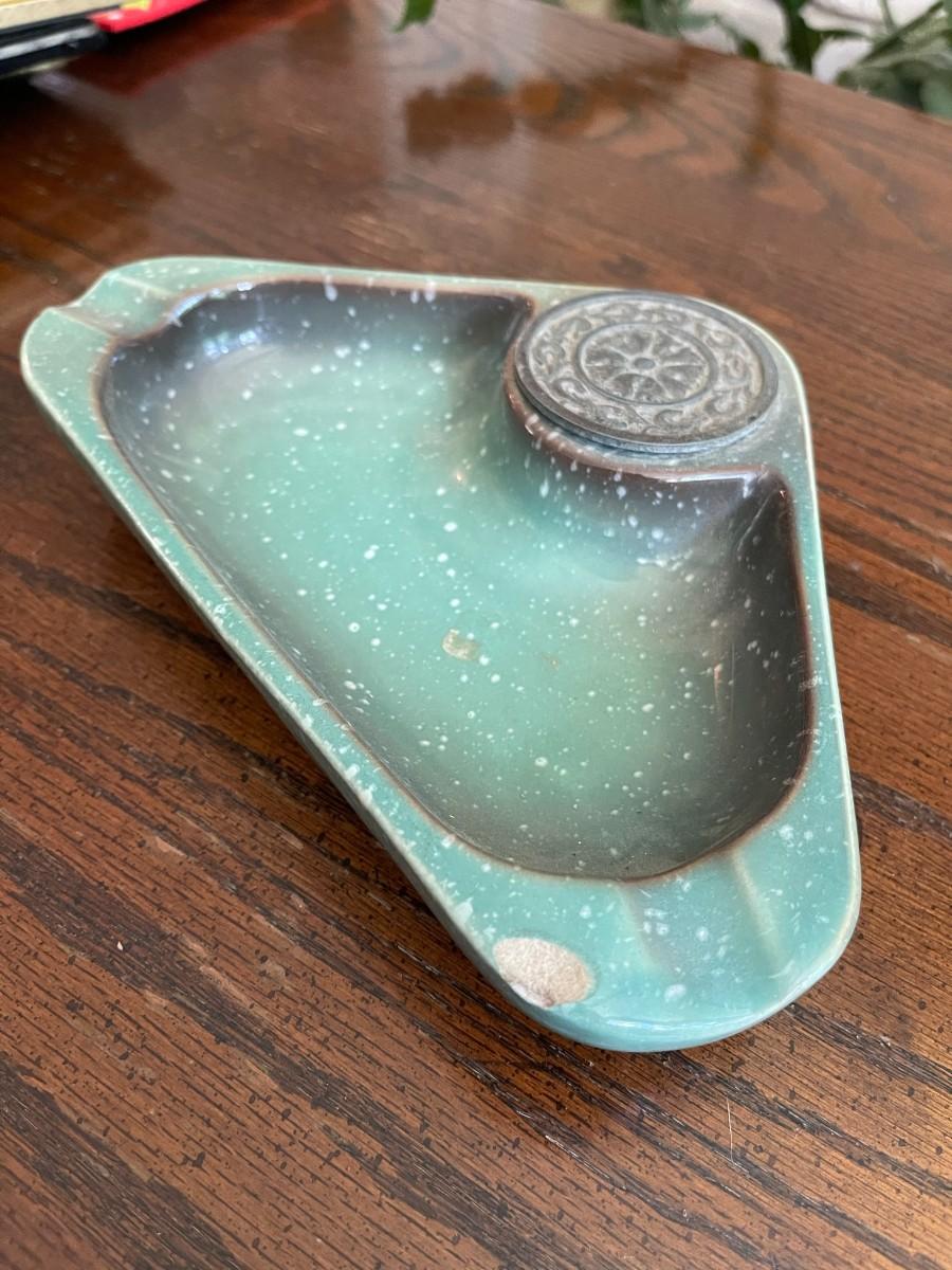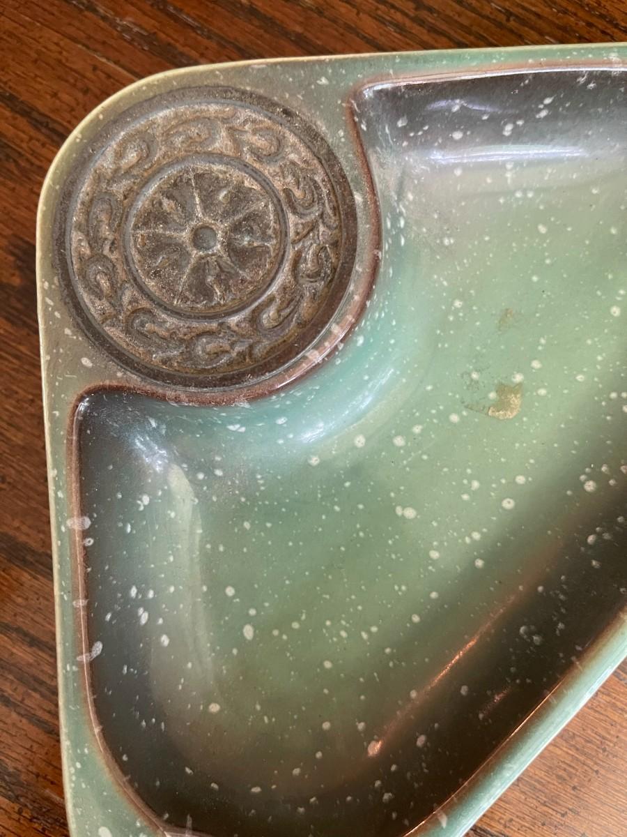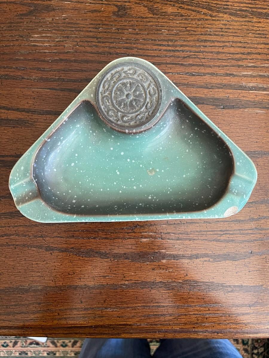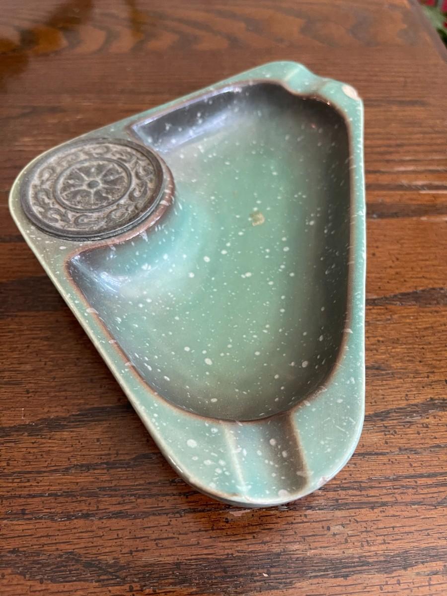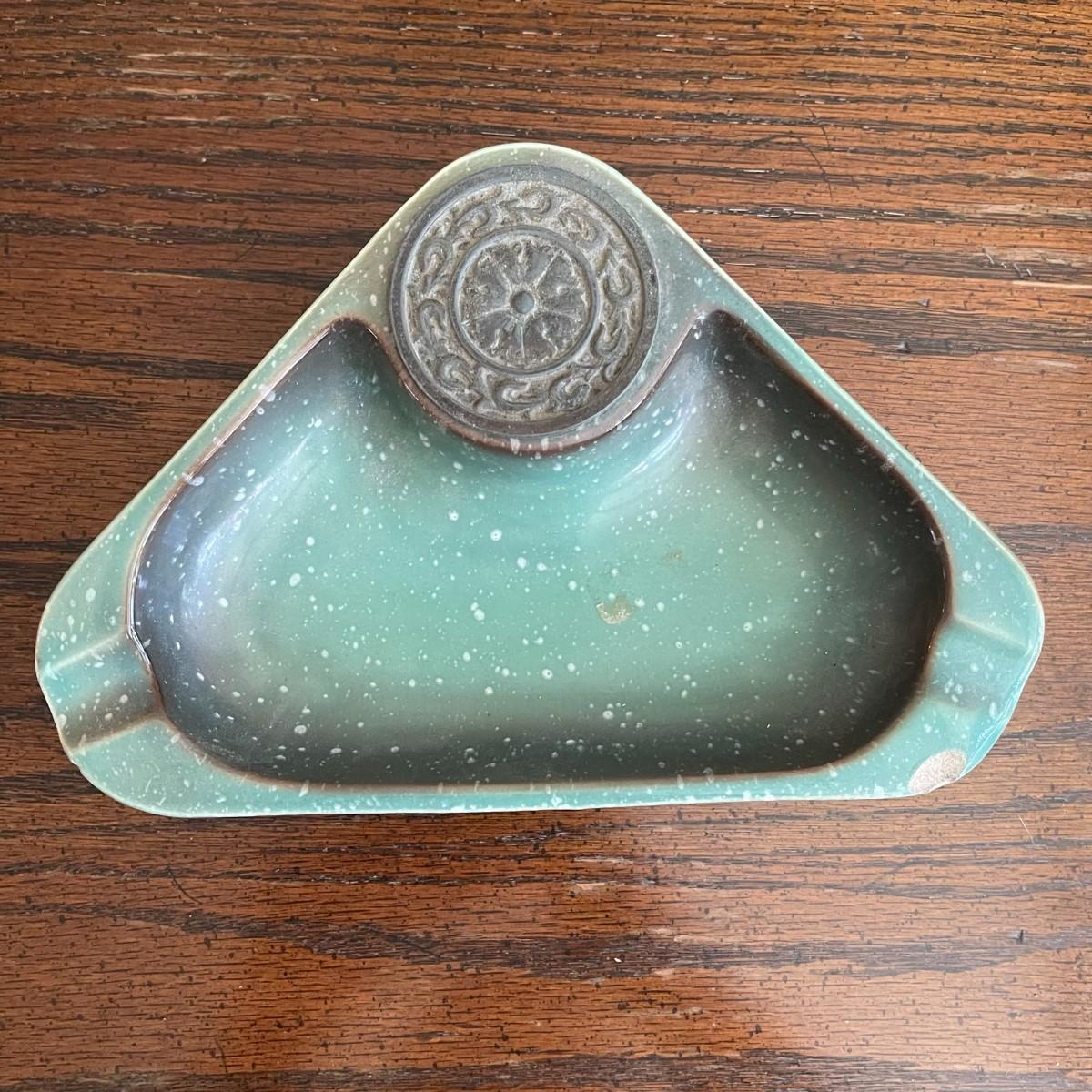 Vintage Roseville Pottery, The Hyde Park, No. 1940 Ashtray, aqua/green speckled, triangle shape, geometric brass medallion, Made in the USA. Makes a great catch-all if not used as ashtray.