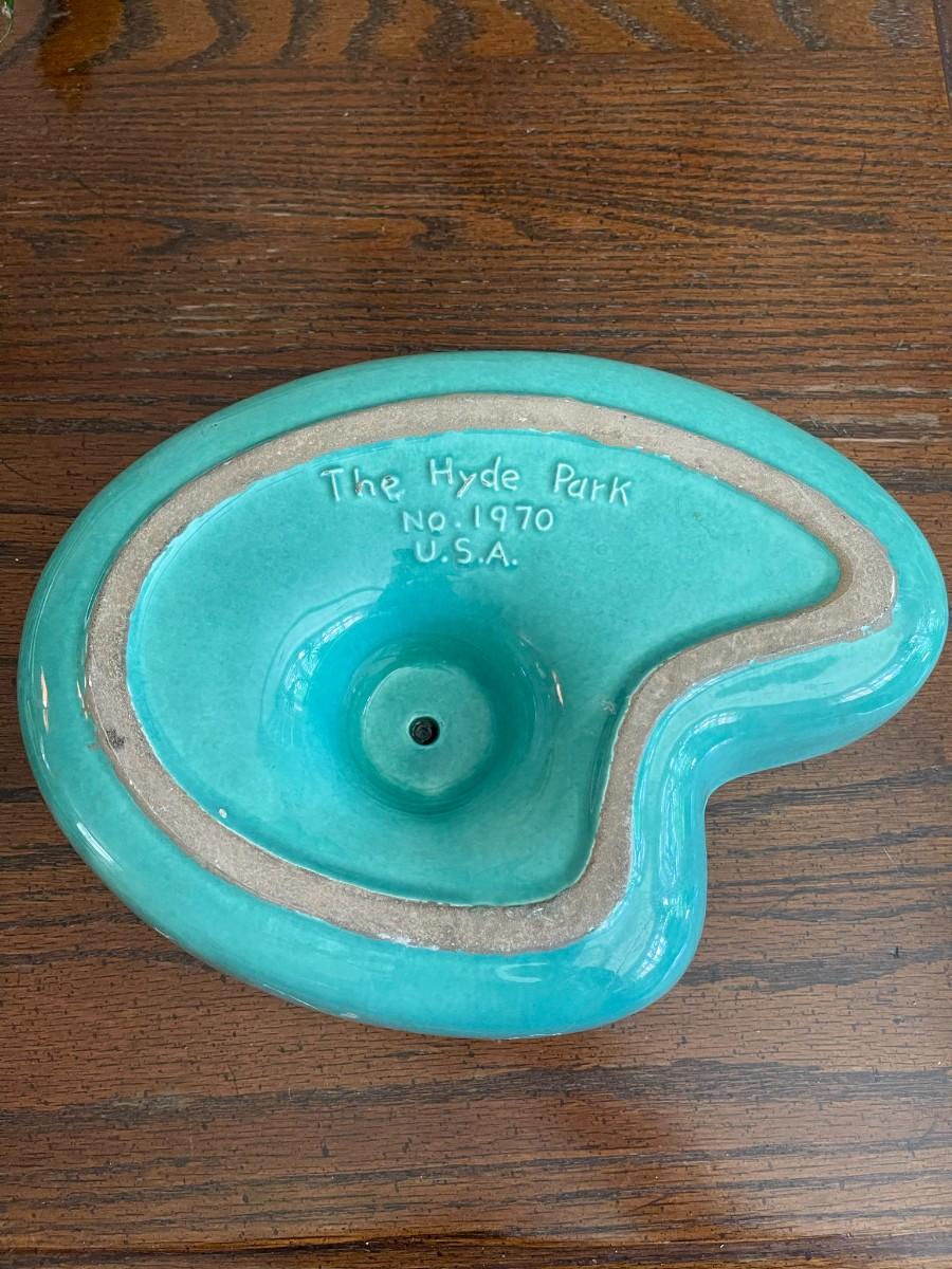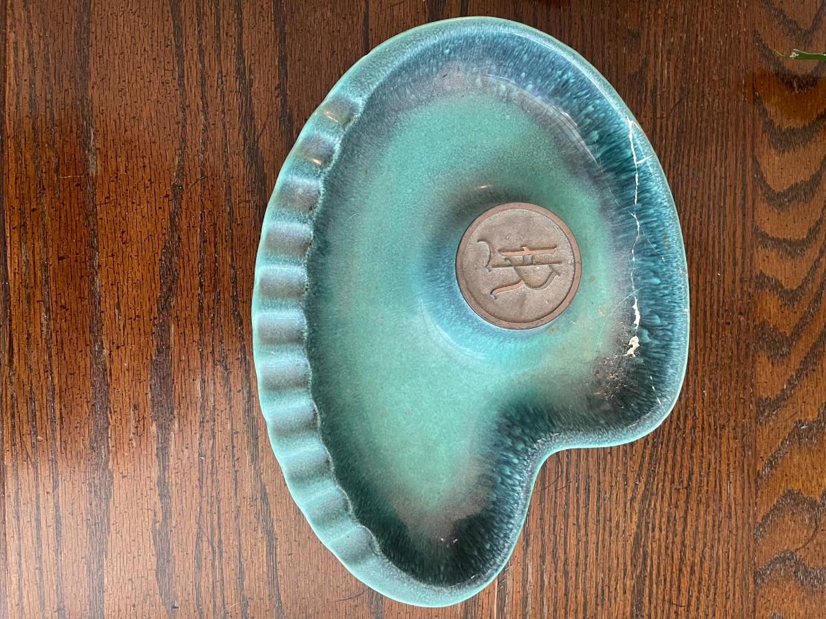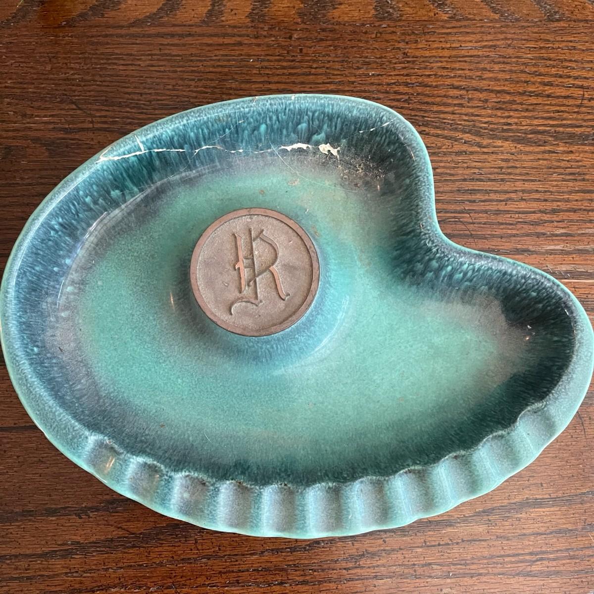 Vintage Roseville Pottery, The Hyde Park, No. 1970, Ashtray, "R" monogram medallion, Blue/Aqua