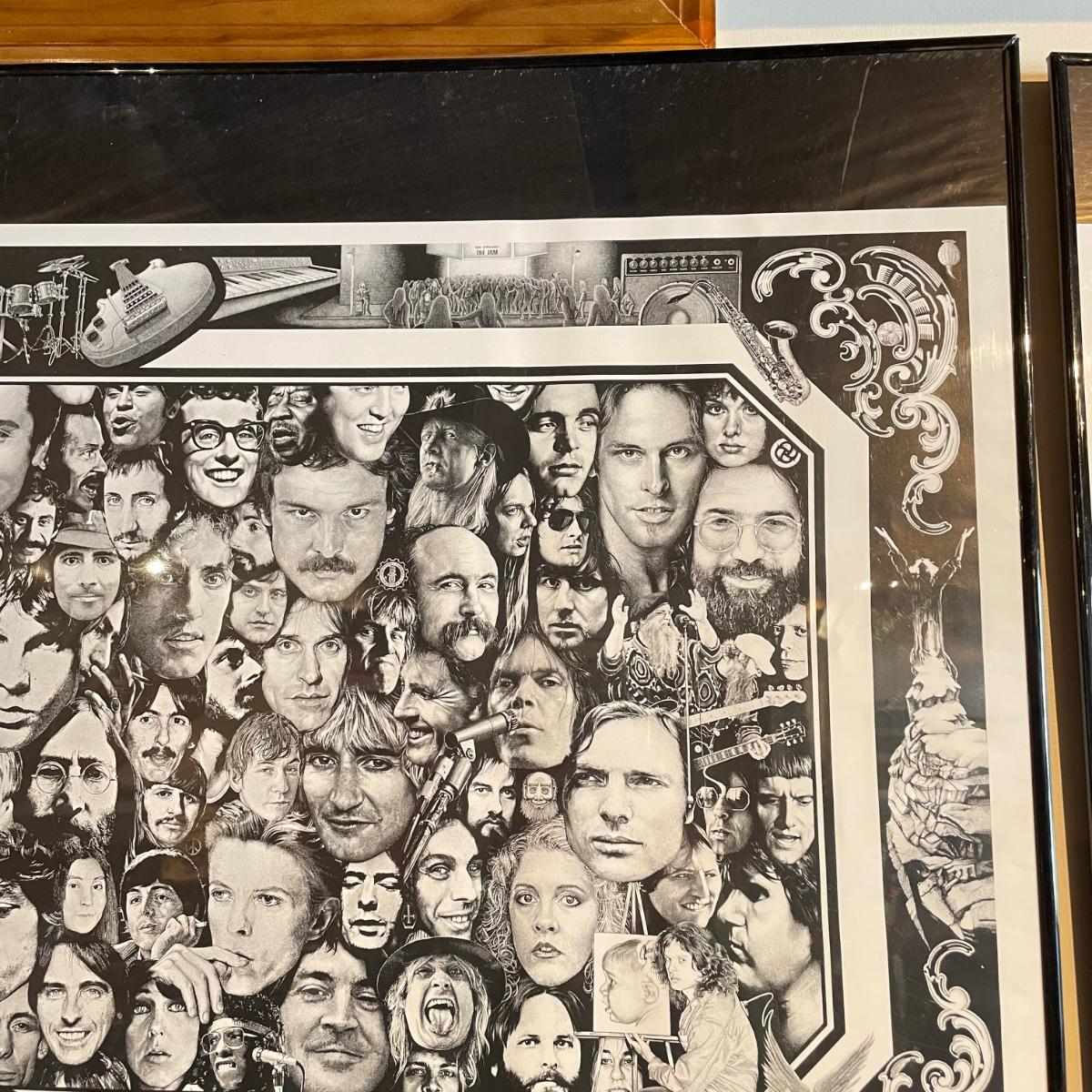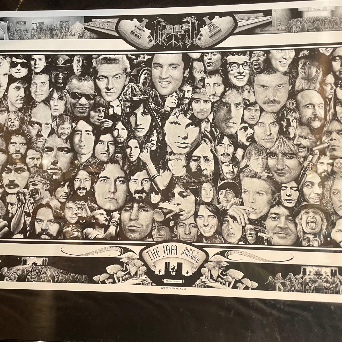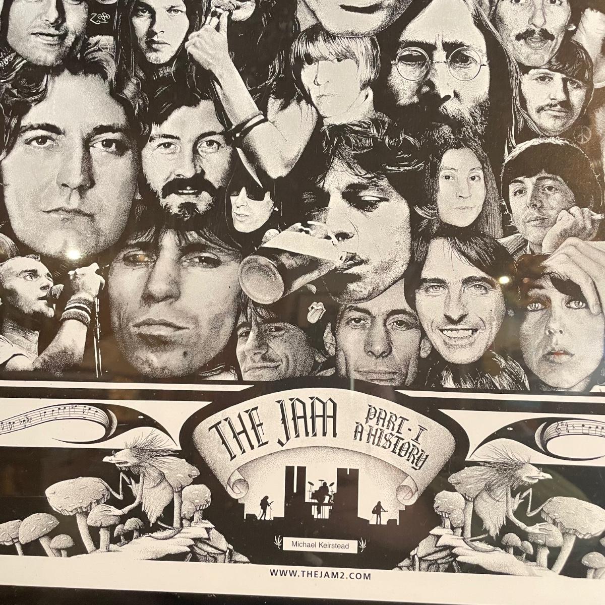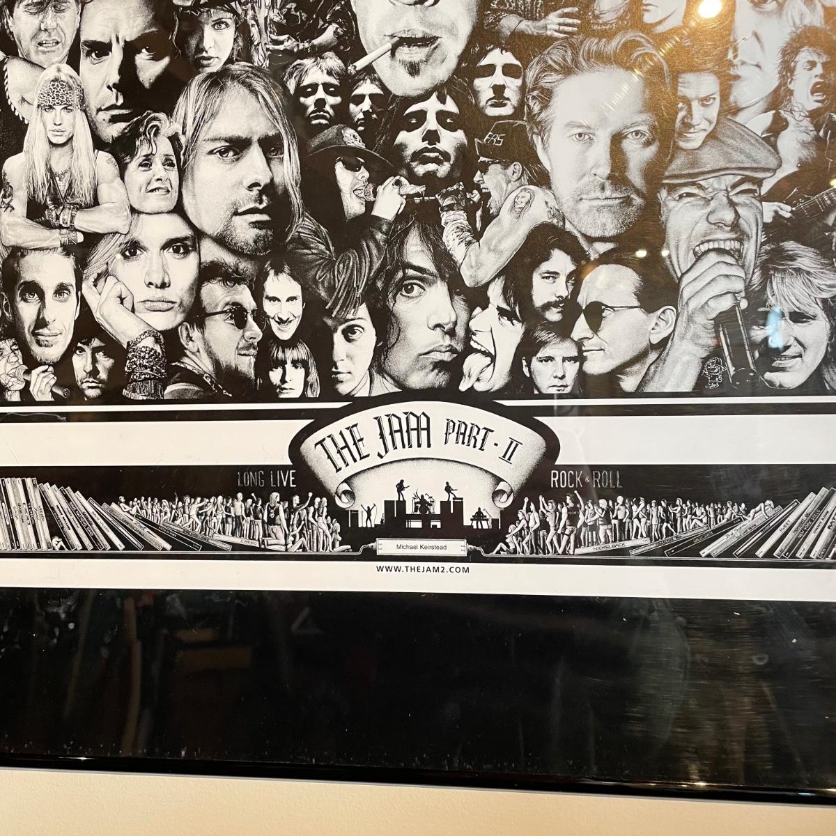 Two posters in simple black metal poster frames titled The Jam Part I - A History and The Jam Part II by Michael Keirstead. Part one features great legends from the beginning of the rock and roll movement through classic rock giants like The Doors, Beatles, Elvis, Grateful Dead etc. Part II features portraits of more recent rock music artists like Nirvana, Kiss, Tom Petty, Billy Idol, etc . The art appears to be 40” x 20” and frames measure 40” x 27”. Shipping available. Please call UPS with dimensions at 828-252-6930 for a shipping quote prior to bidding.