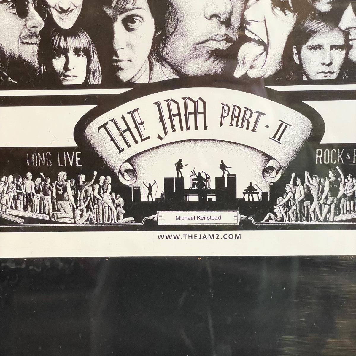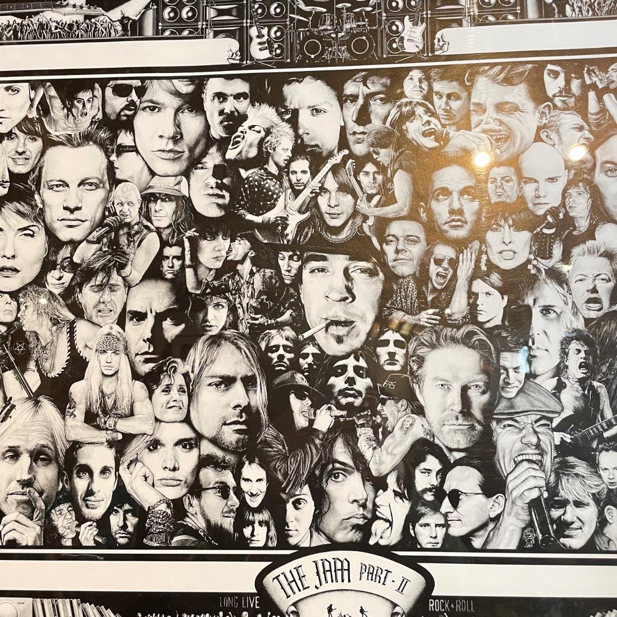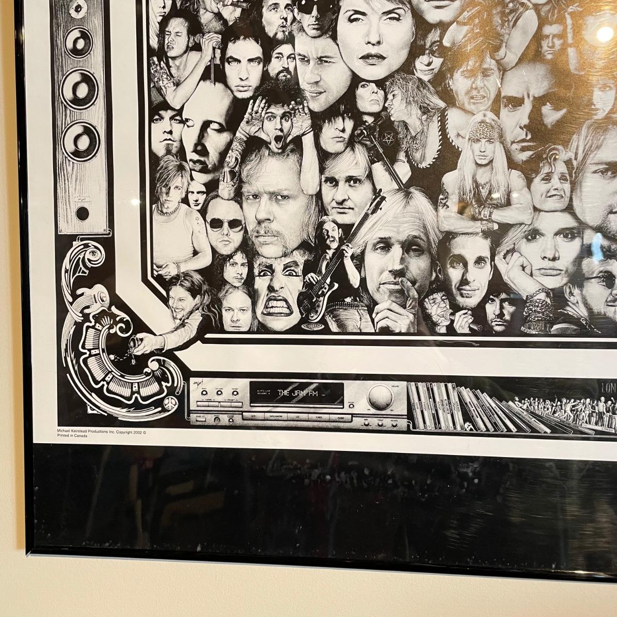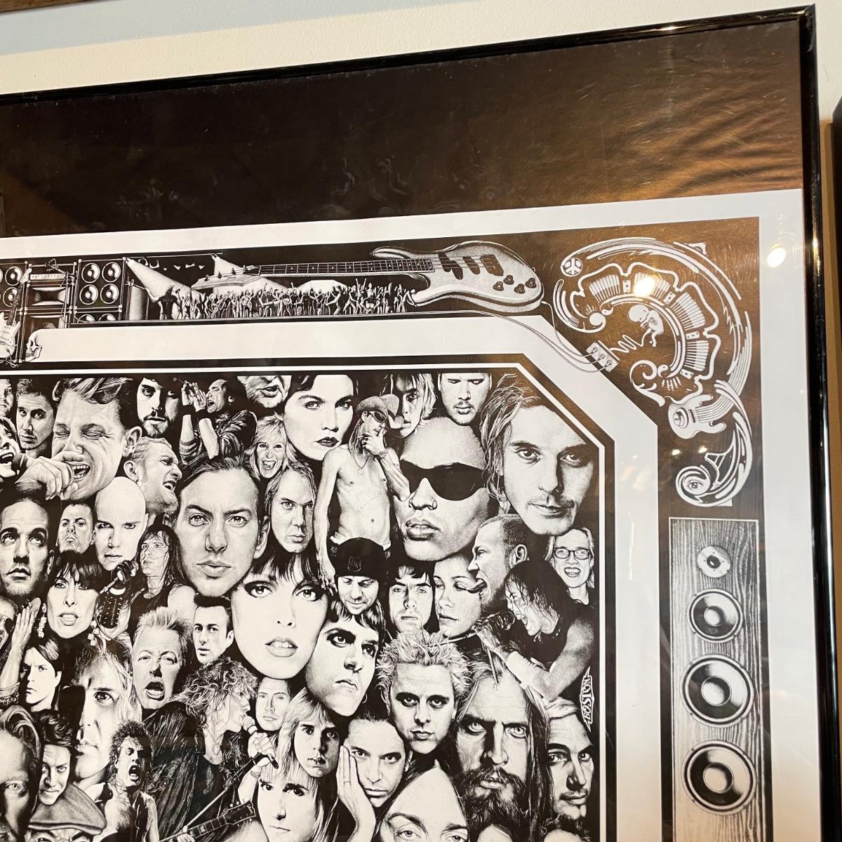Two posters in simple black metal poster frames titled The Jam Part I - A History and The Jam Part II by Michael Keirstead. Part one features great legends from the beginning of the rock and roll movement through classic rock giants like The Doors, Beatles, Elvis, Grateful Dead etc. Part II features portraits of more recent rock music artists like Nirvana, Kiss, Tom Petty, Billy Idol, etc . The art appears to be 40” x 20” and frames measure 40” x 27”. Shipping available. Please call UPS with dimensions at 828-252-6930 for a shipping quote prior to bidding.