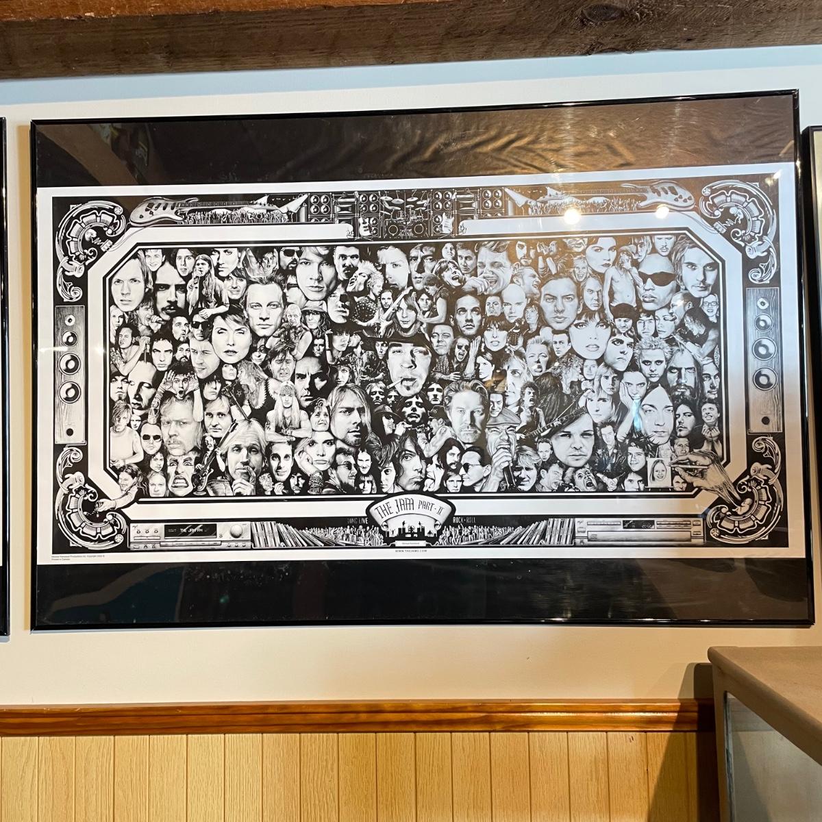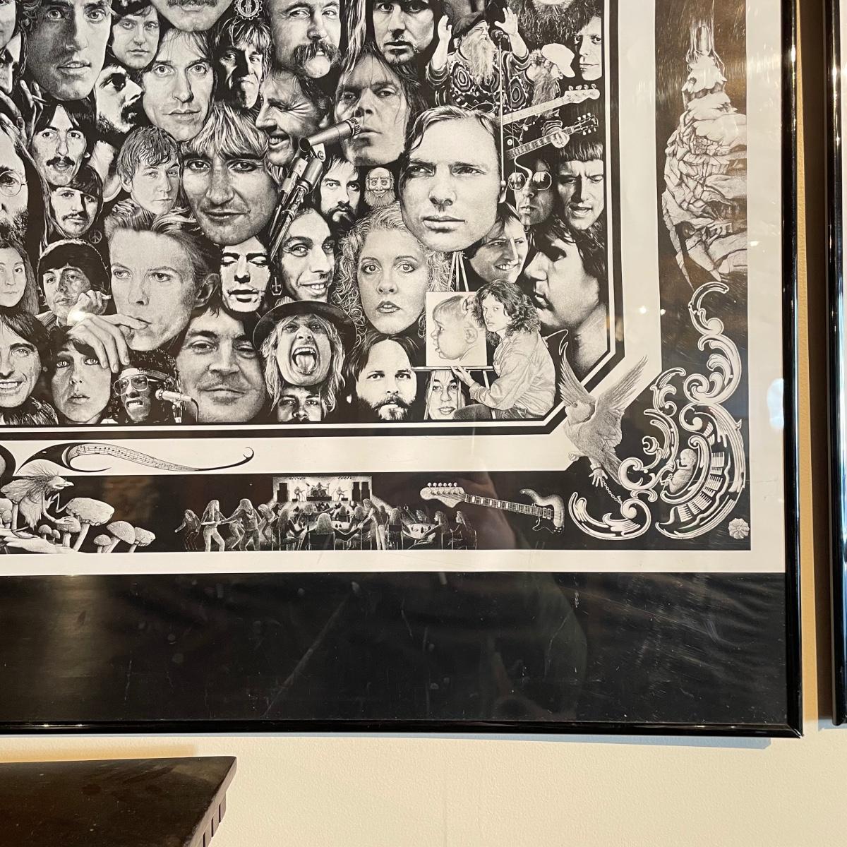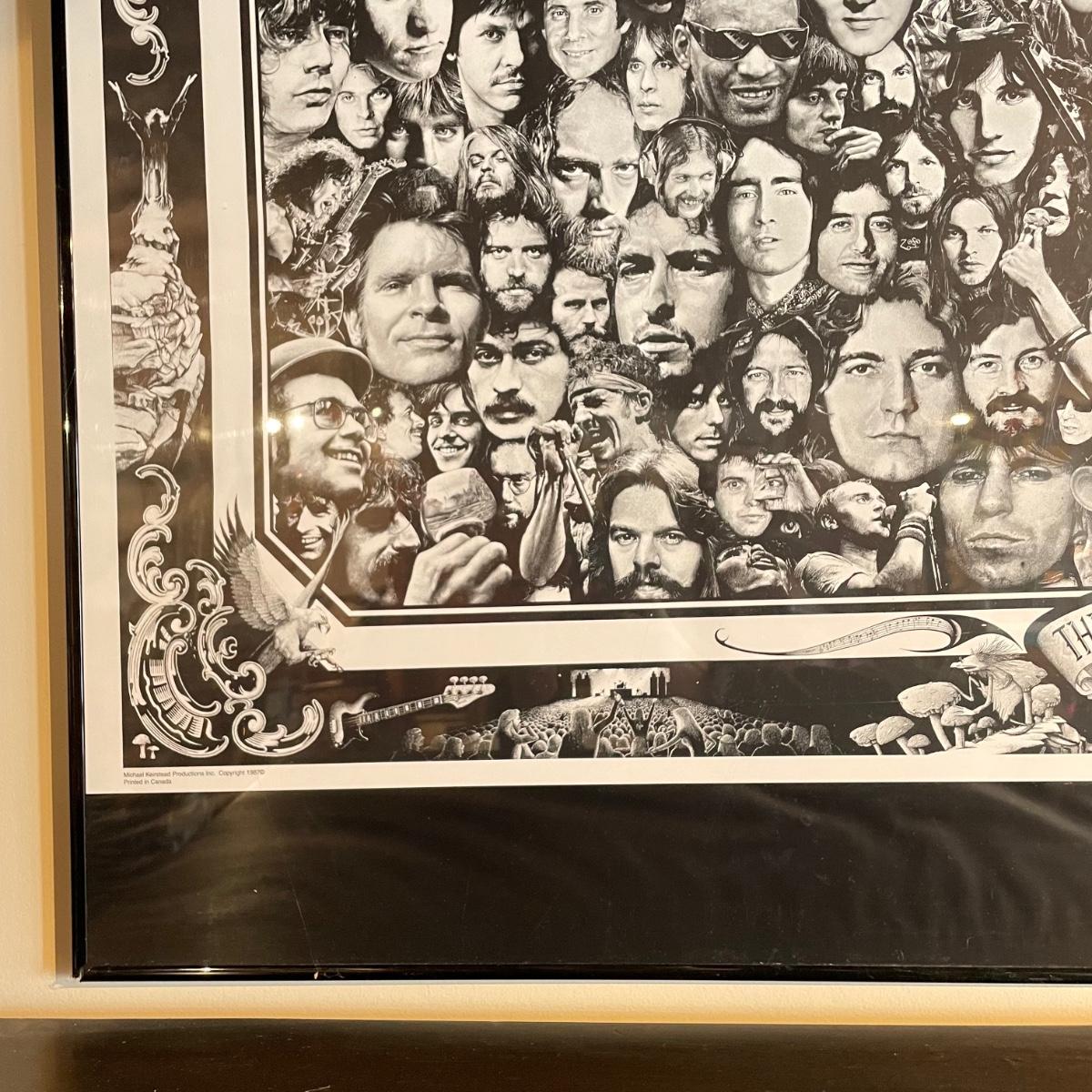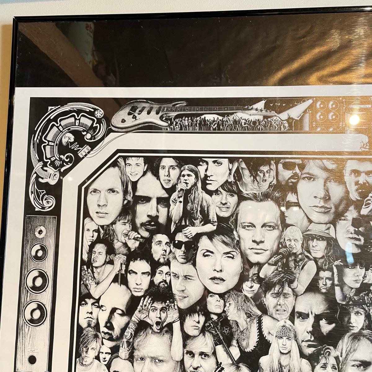 Two posters in simple black metal poster frames titled The Jam Part I - A History and The Jam Part II by Michael Keirstead. Part one features great legends from the beginning of the rock and roll movement through classic rock giants like The Doors, Beatles, Elvis, Grateful Dead etc. Part II features portraits of more recent rock music artists like Nirvana, Kiss, Tom Petty, Billy Idol, etc . The art appears to be 40” x 20” and frames measure 40” x 27”. Shipping available. Please call UPS with dimensions at 828-252-6930 for a shipping quote prior to bidding.