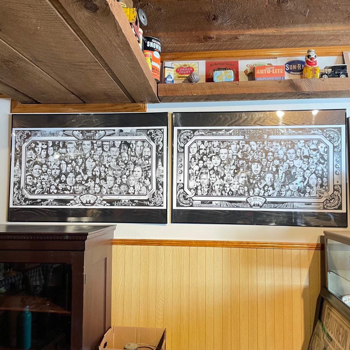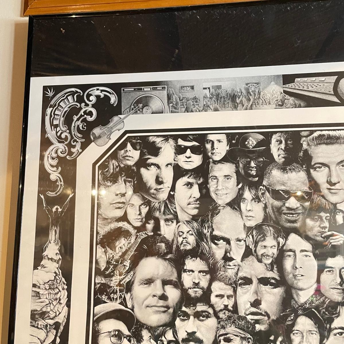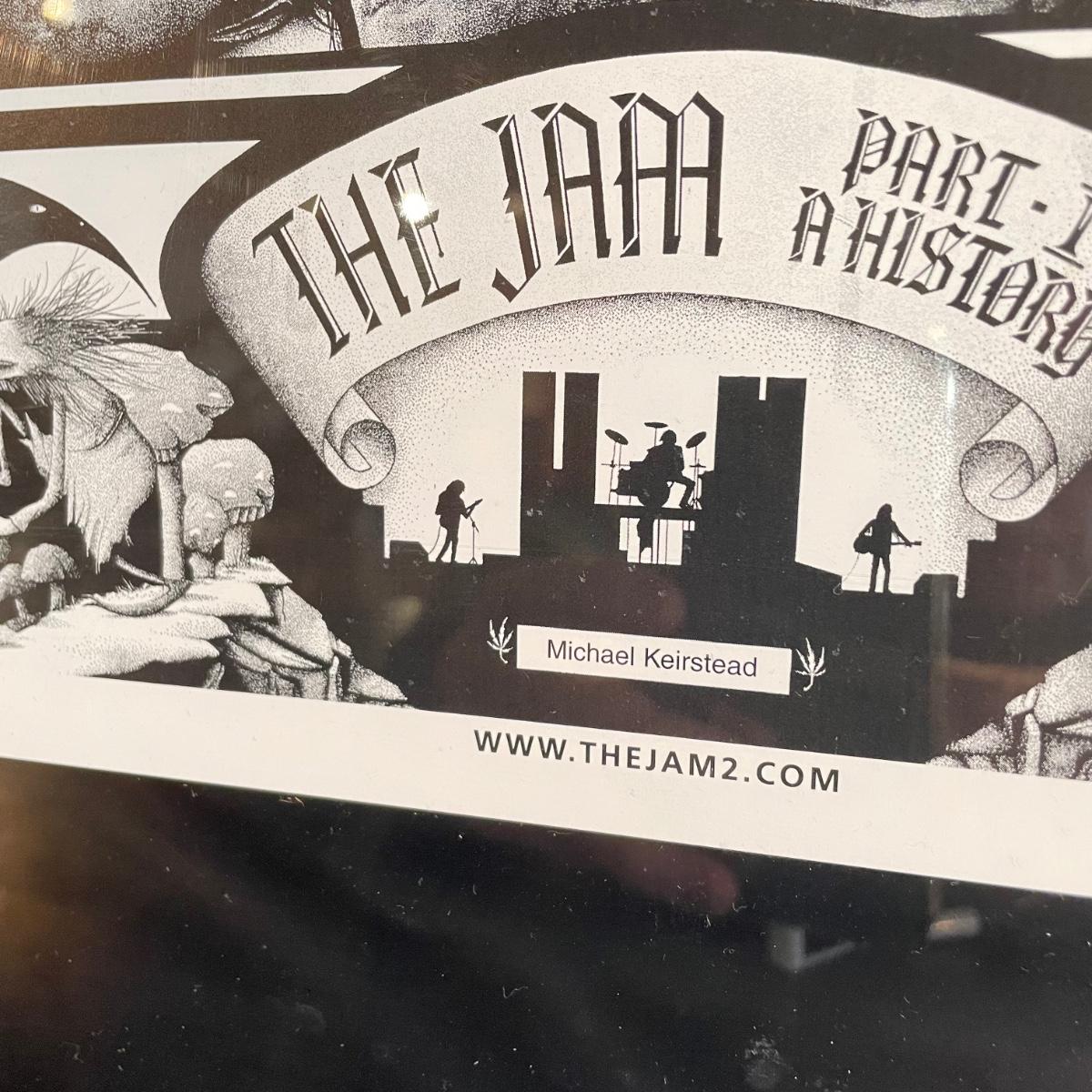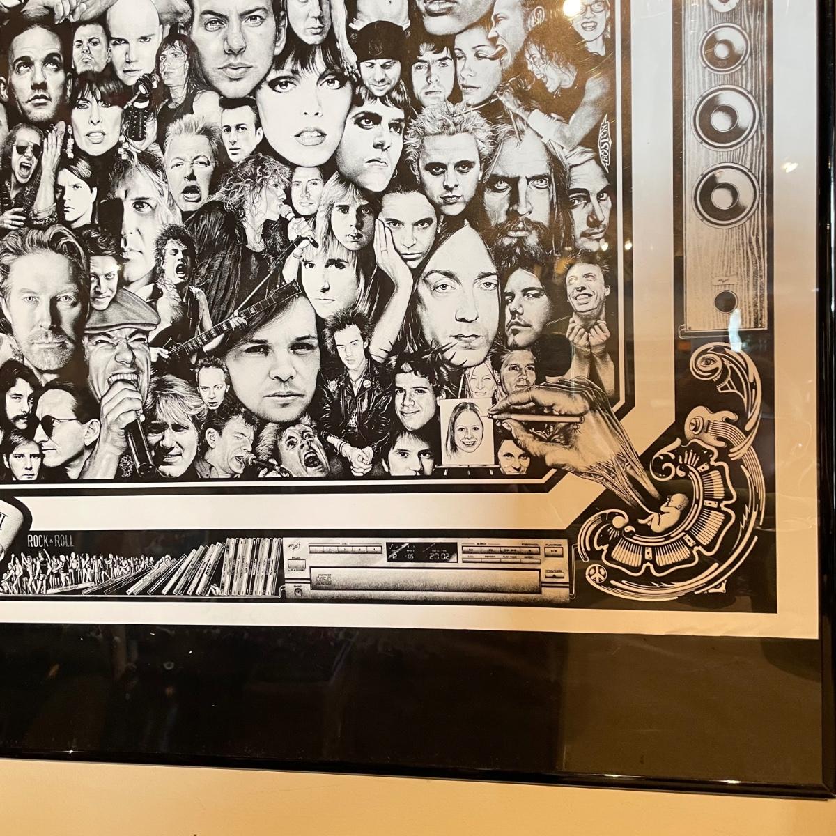 Two posters in simple black metal poster frames titled The Jam Part I - A History and The Jam Part II by Michael Keirstead. Part one features great legends from the beginning of the rock and roll movement through classic rock giants like The Doors, Beatles, Elvis, Grateful Dead etc. Part II features portraits of more recent rock music artists like Nirvana, Kiss, Tom Petty, Billy Idol, etc . The art appears to be 40” x 20” and frames measure 40” x 27”. Shipping available. Please call UPS with dimensions at 828-252-6930 for a shipping quote prior to bidding.