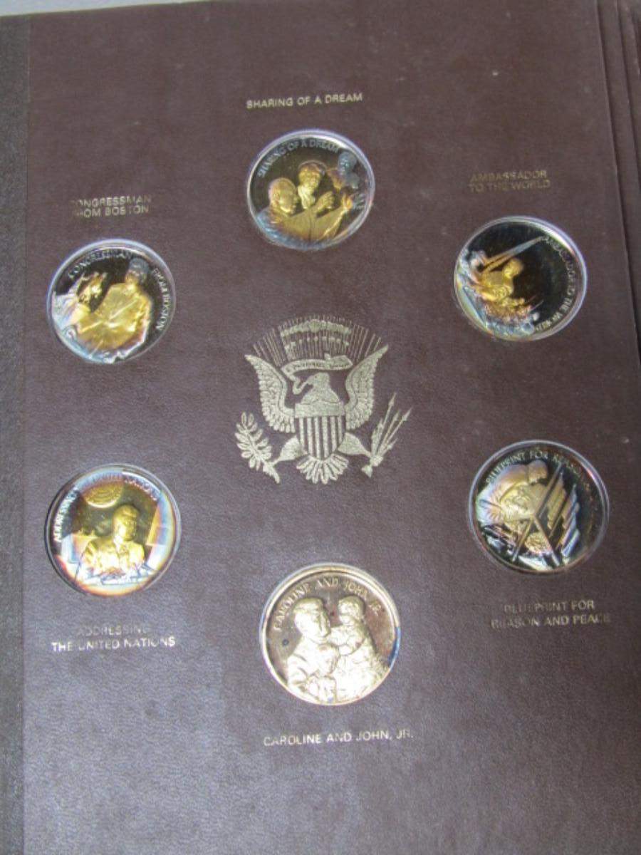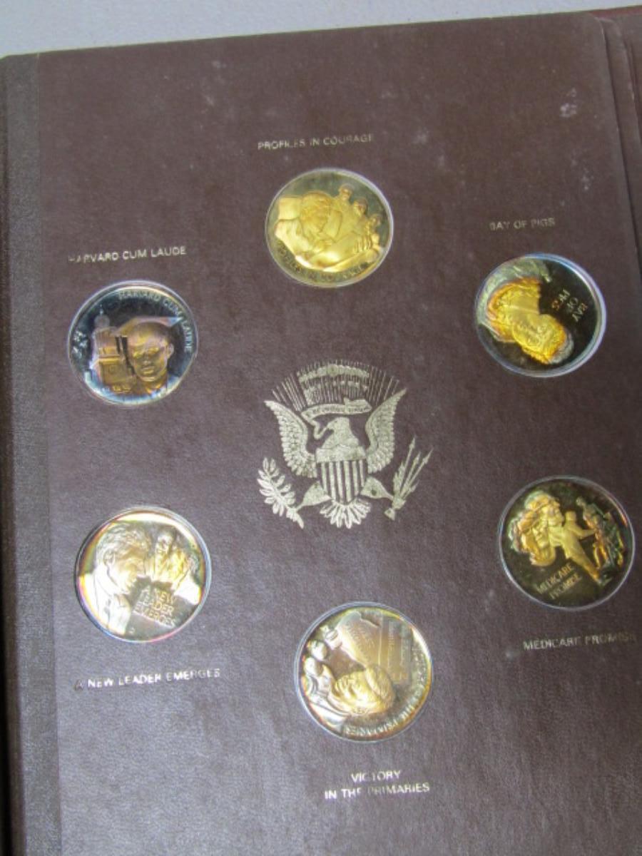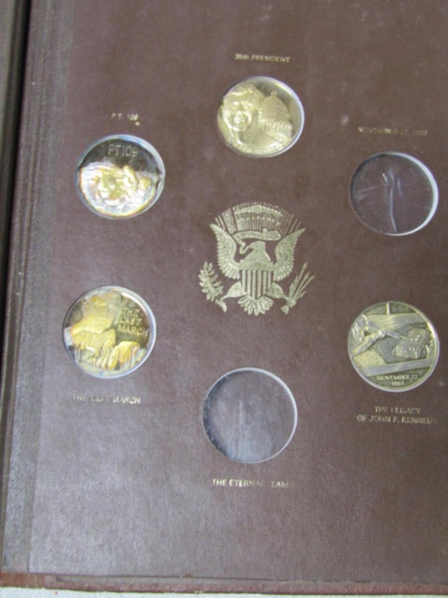 The John F. Kennedy Commemorative by The Lincoln Mint. Contains 34 of the 36 collectible medals (Two are missing on the last page). Each weighs approx 31 grams and is marked 24 kt electroplate on sterling silver.