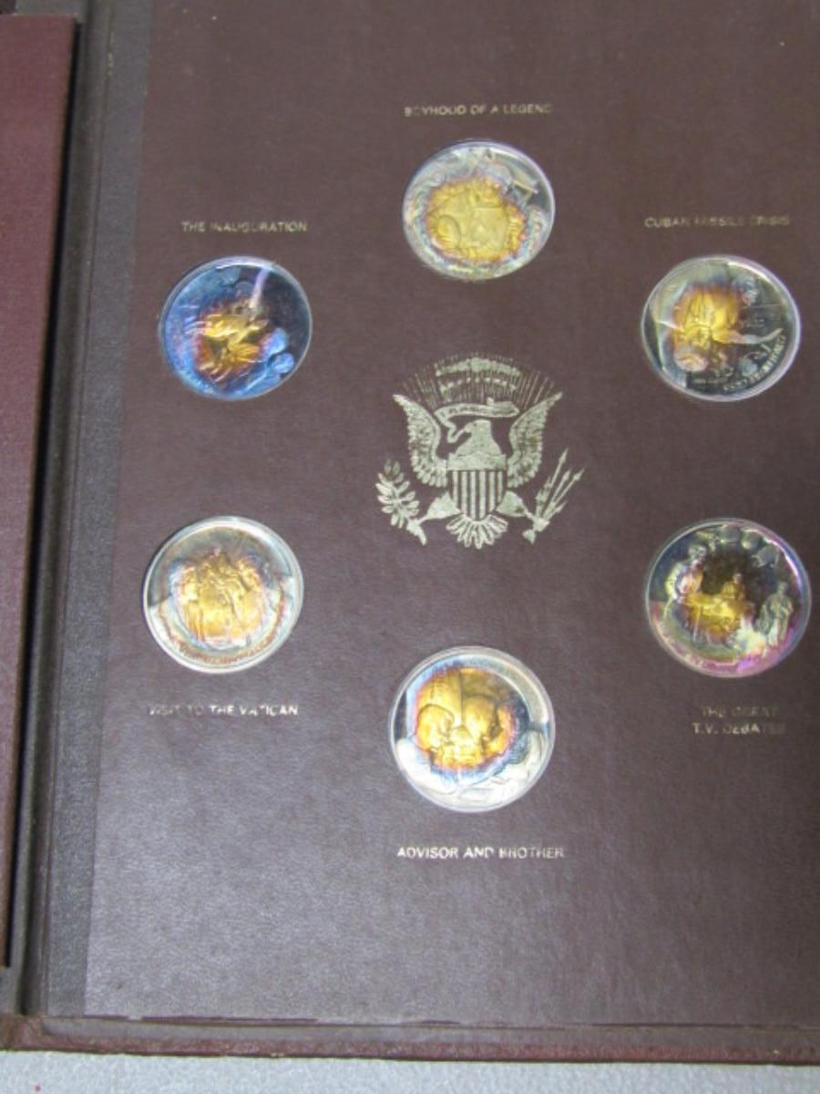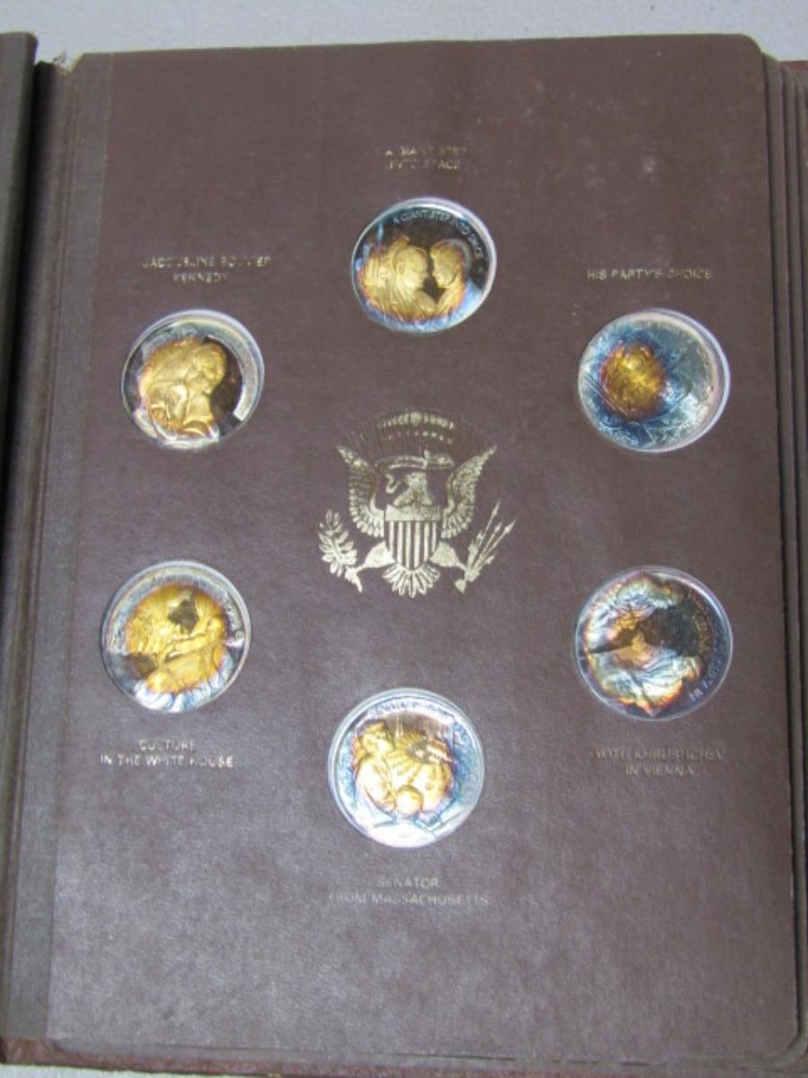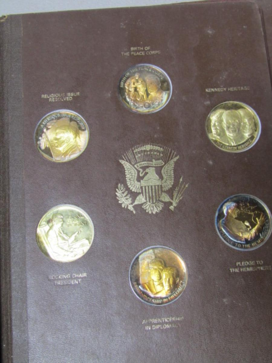 The John F. Kennedy Commemorative by The Lincoln Mint. Contains 34 of the 36 collectible medals (Two are missing on the last page). Each weighs approx 31 grams and is marked 24 kt electroplate on sterling silver.