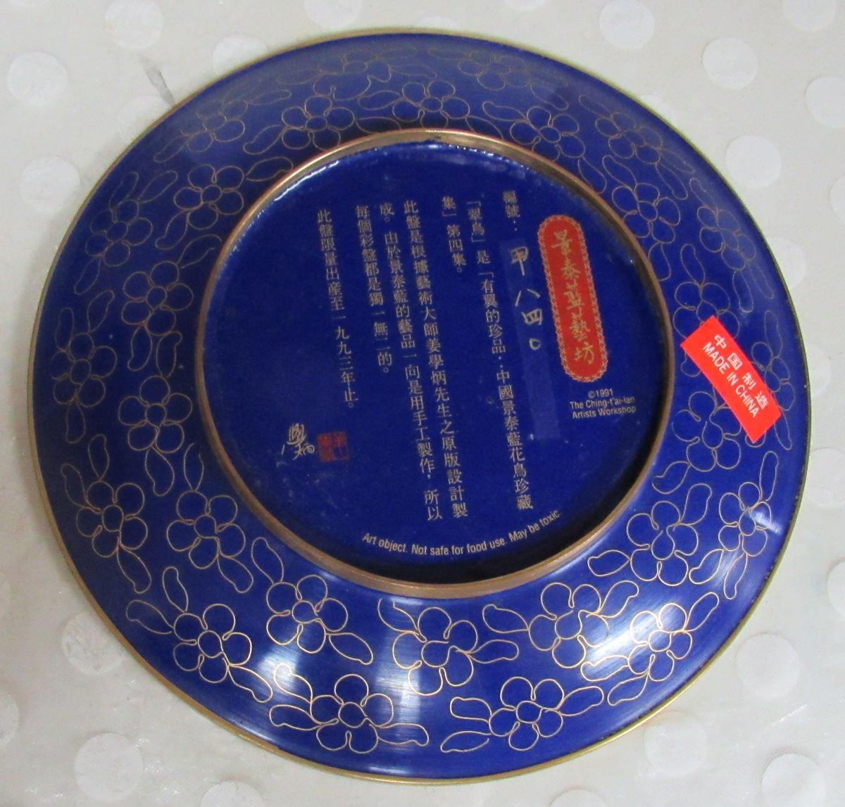 Beautiful plate, beautiful condition. 4th in series of the Winged Jewels Chinese Cloisonne Plates Series. These plates were in limited production. This one ended on 9/30/93. Comes complete in original box with package inserts. Shipping is available at shipping cost plus $5.00 handling fee on up to 8 items, $10.00 handling fee on 9 or more items.