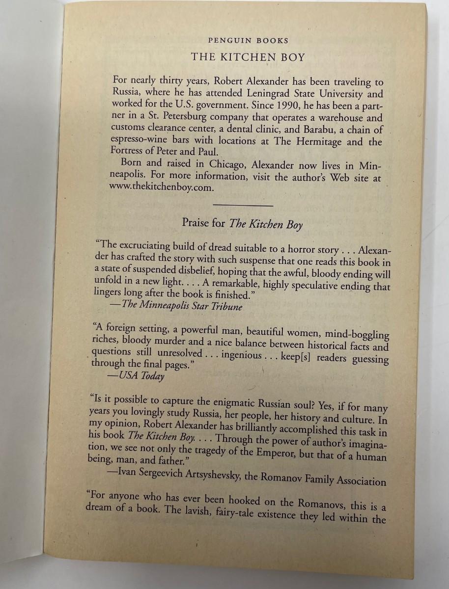 Description: The Kitchen Boy A novel of the last Tsar by Robert Alexander copyright 2003; Material: Paper