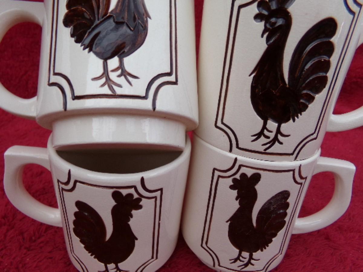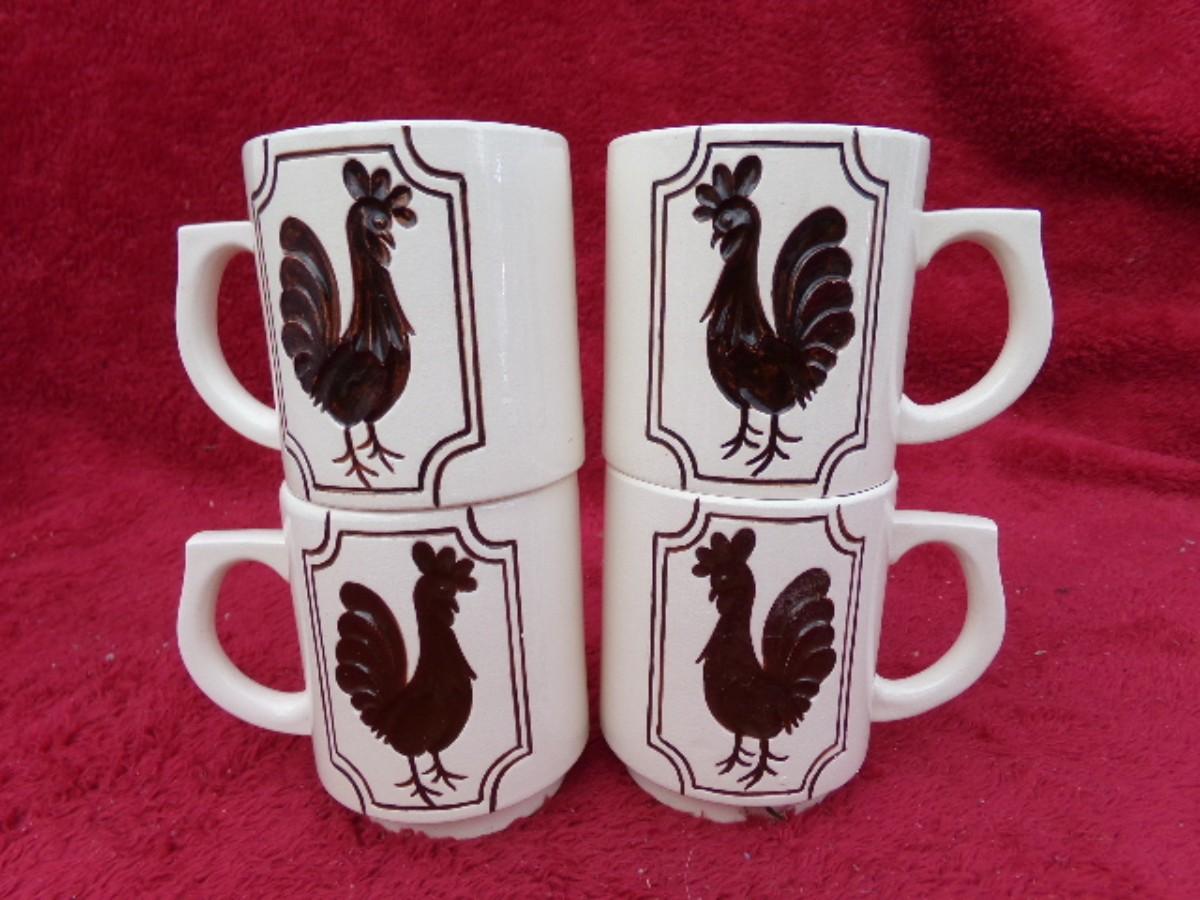 THE LAST DOZEN coffee mugs/cups in a box w/ 6 matching cupsthat have roosters on them that are easy stack design and the other 6 are assorted