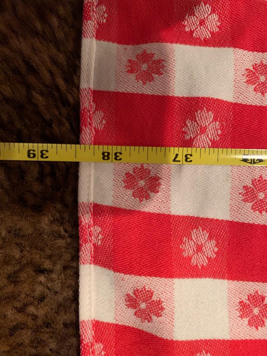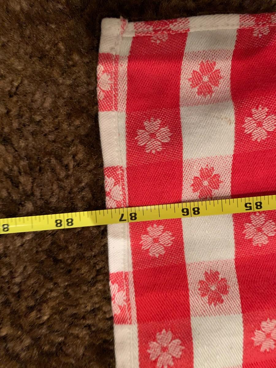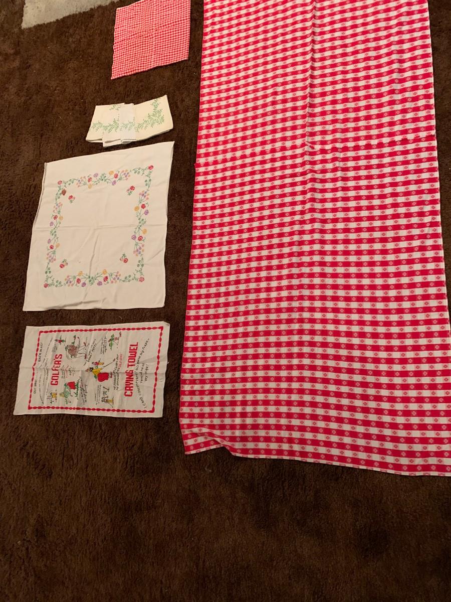 Red & white checkered tablecloth, golf towel and some napkins. Pretty random.