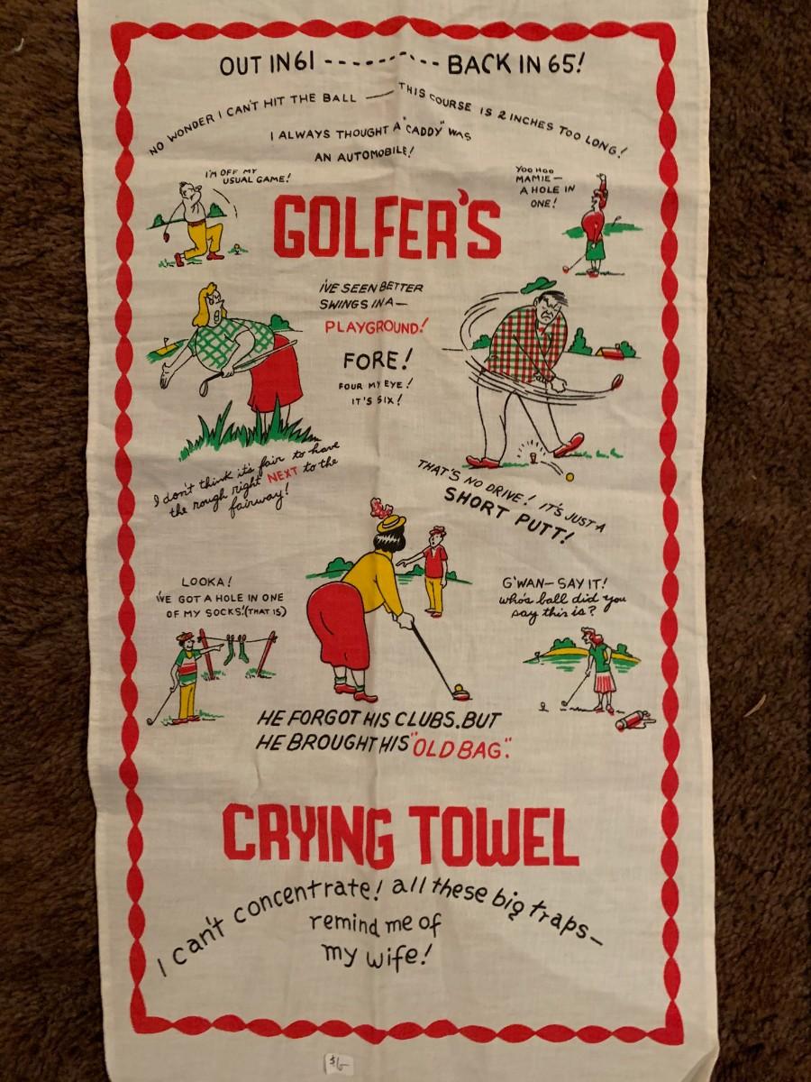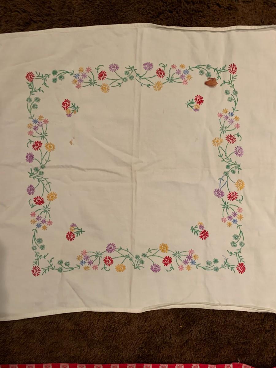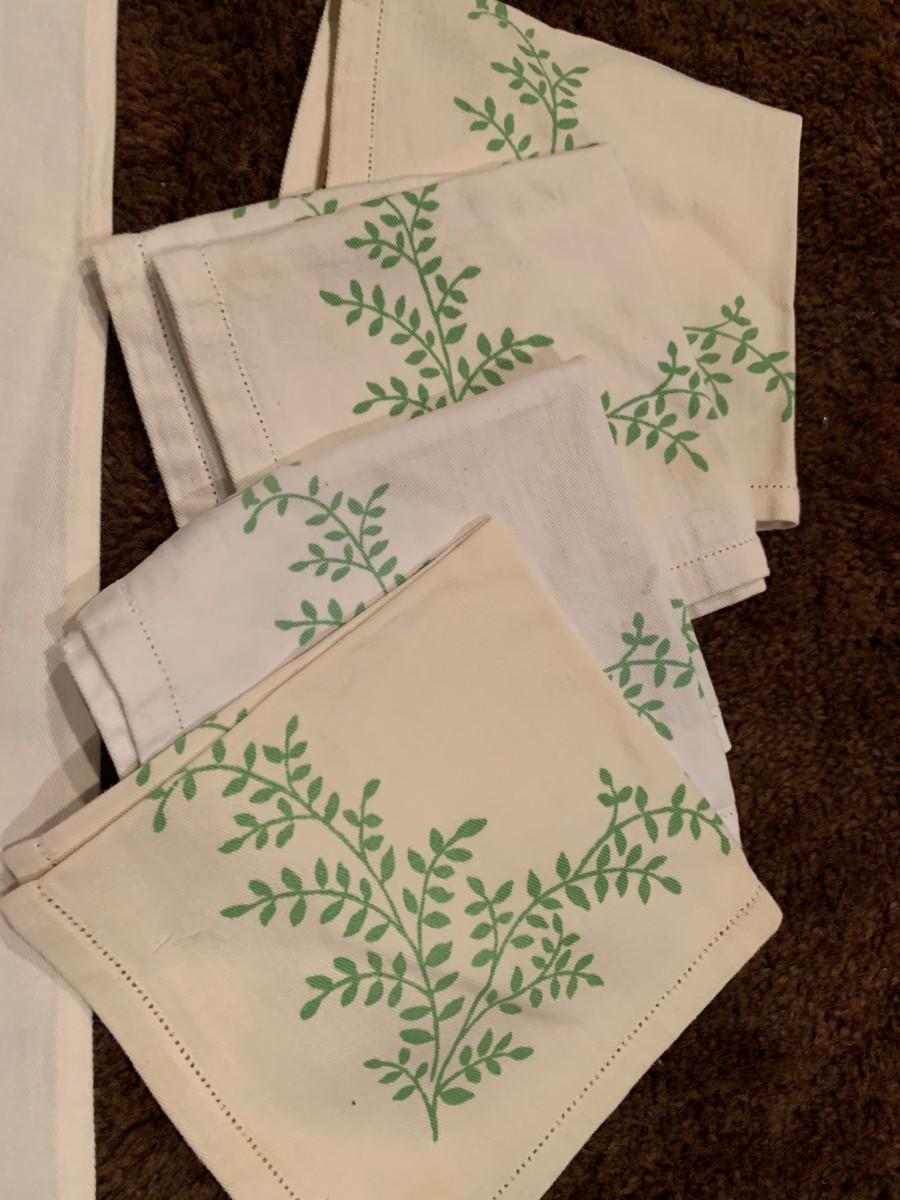 Red & white checkered tablecloth, golf towel and some napkins. Pretty random.