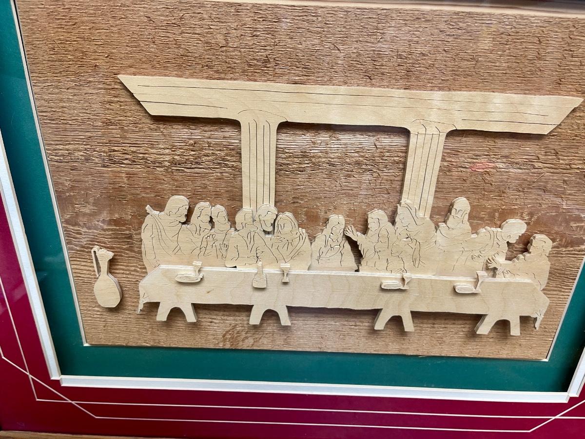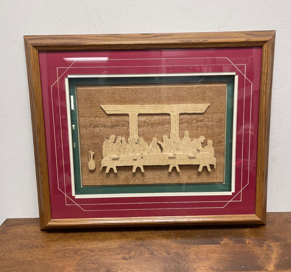 Framed size approx. 22.5" x 19". Similar to a shadow-box, has 4 layers of intricately cut wood creating a 3-D image of the last supper. Framed, matted and behind clear plexiglass.
