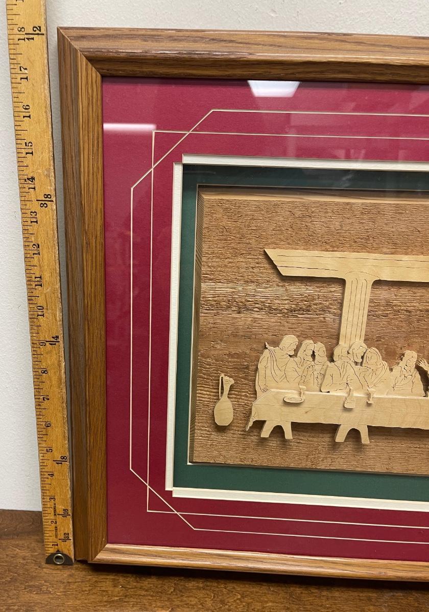 Framed size approx. 22.5" x 19". Similar to a shadow-box, has 4 layers of intricately cut wood creating a 3-D image of the last supper. Framed, matted and behind clear plexiglass.