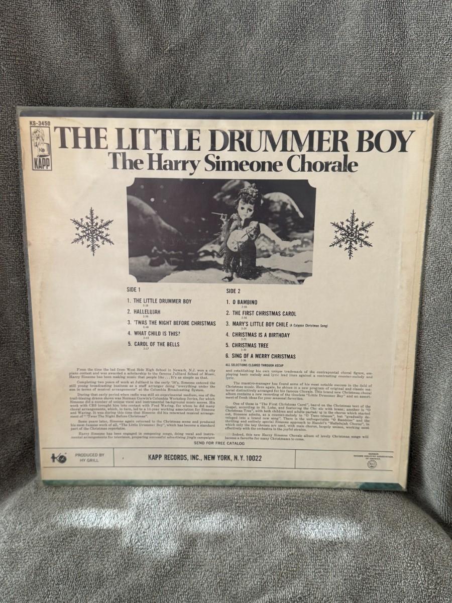 "The Little Drummer Boy" by The Harry Simeone Chorale, a well-known Christmas album released on Kapp Records.