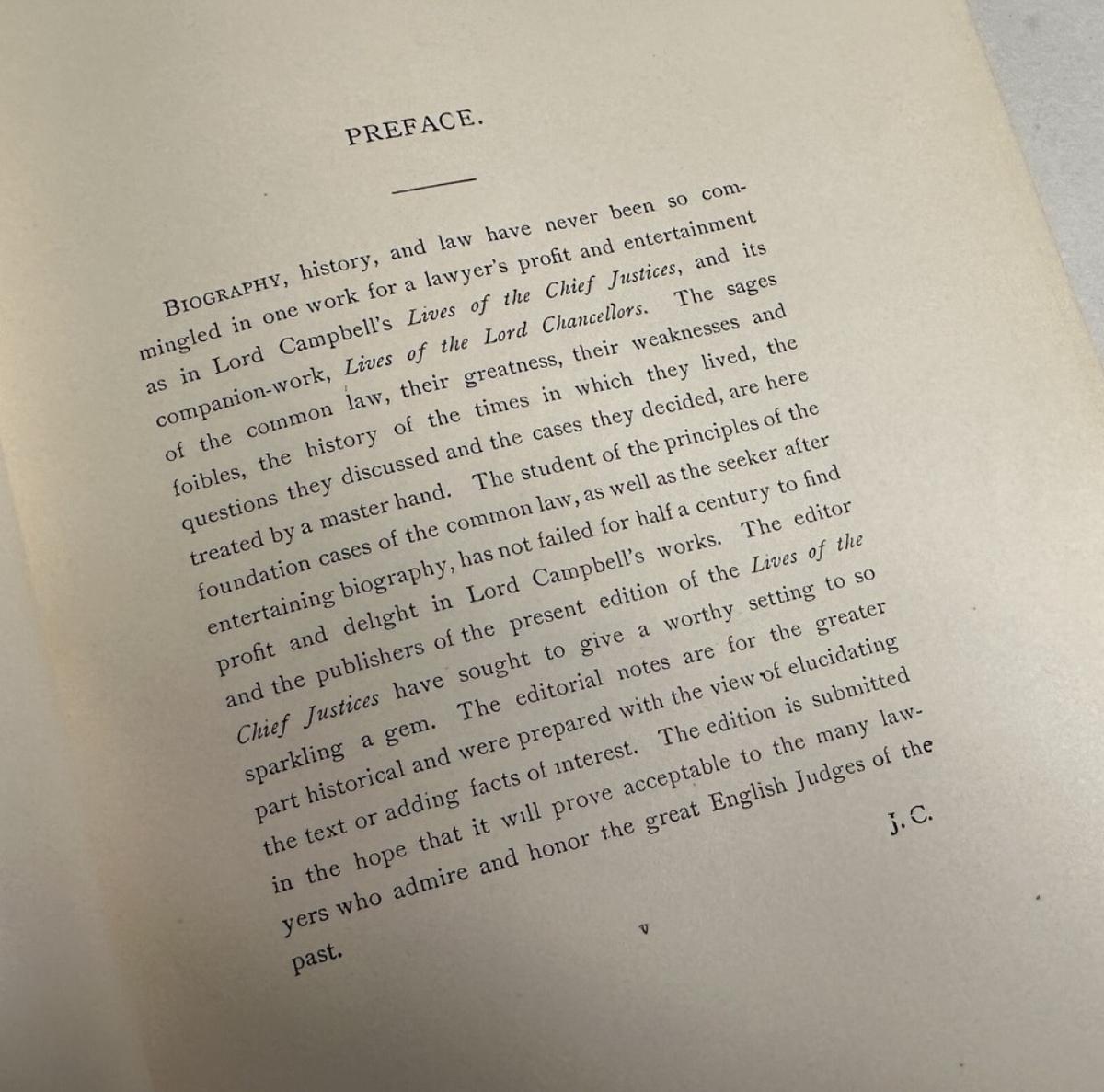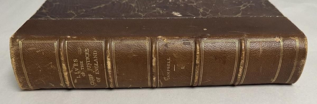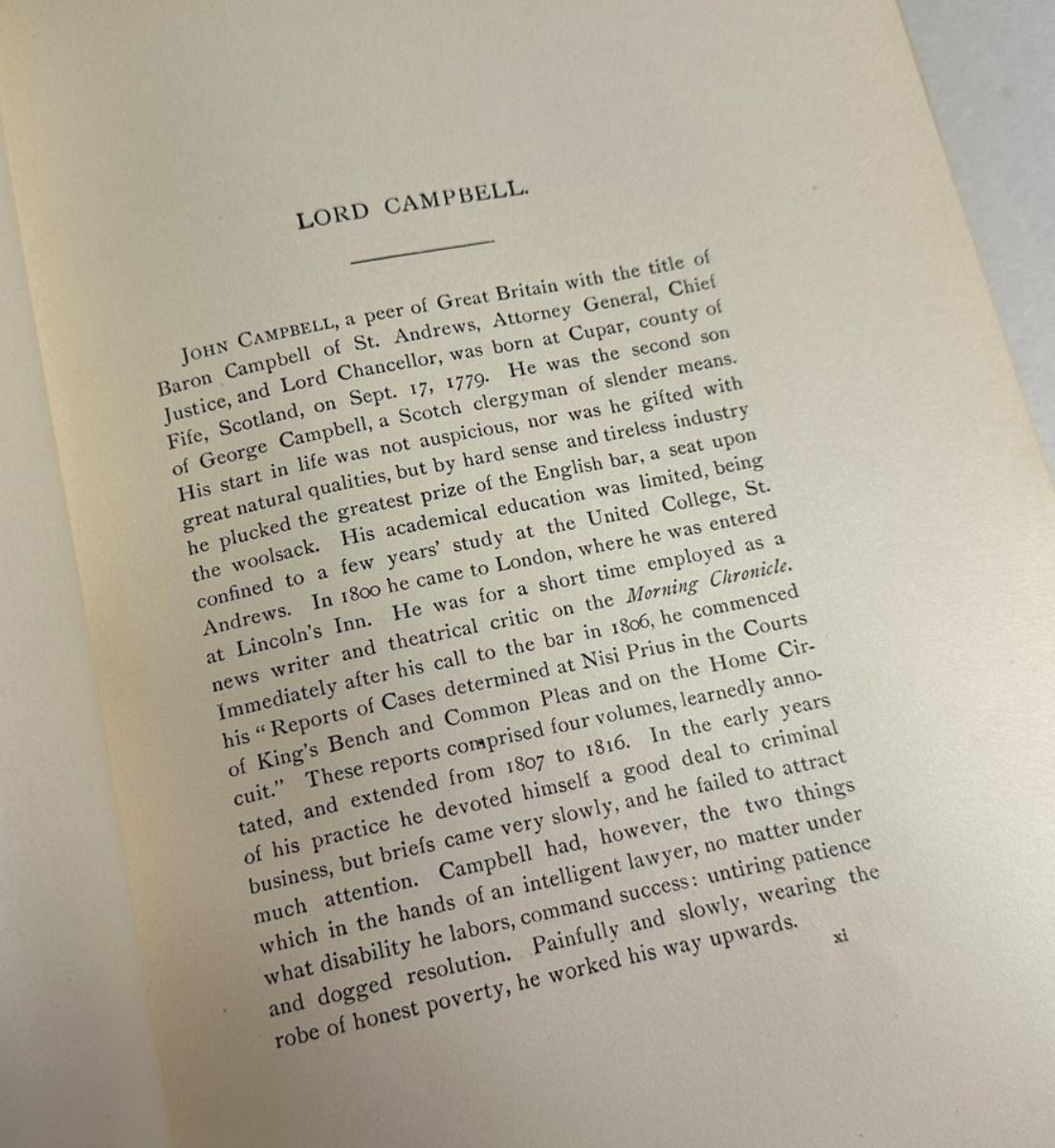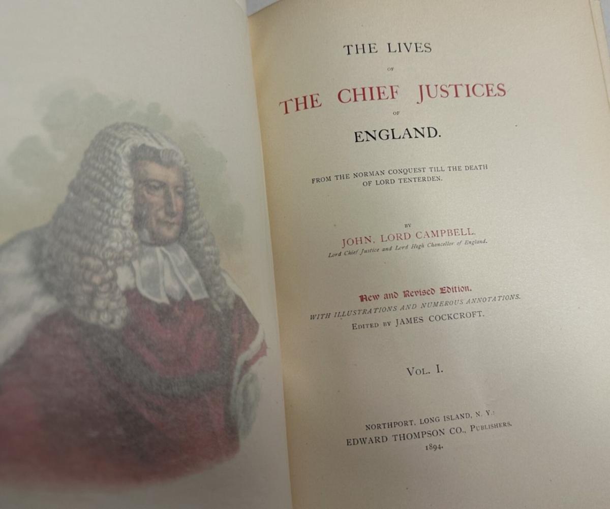 Fine condition on this original 1894 first edition of THE LIVES OF THE CHIEF JUSTICES OF ENGLAND-FROM THE NORMAN CONQUEST TILL THE DEATH OF LORD TENTERDEN by JOHN, LORD CAMPBELL, Lord Chief Justice and Lord High Chancellor of England...Binding good..Some surface rubs on exterior cover..Complete with 440 pages...9.5 x 8"..New and Revised edition. This classic study, which went through several editions, is an incomparable storehouse of legal history and numerous anecdotes....with illustrations...Volume One of Five..Printed by Edward Thompson Co. of Northport, Long Island, N.Y.