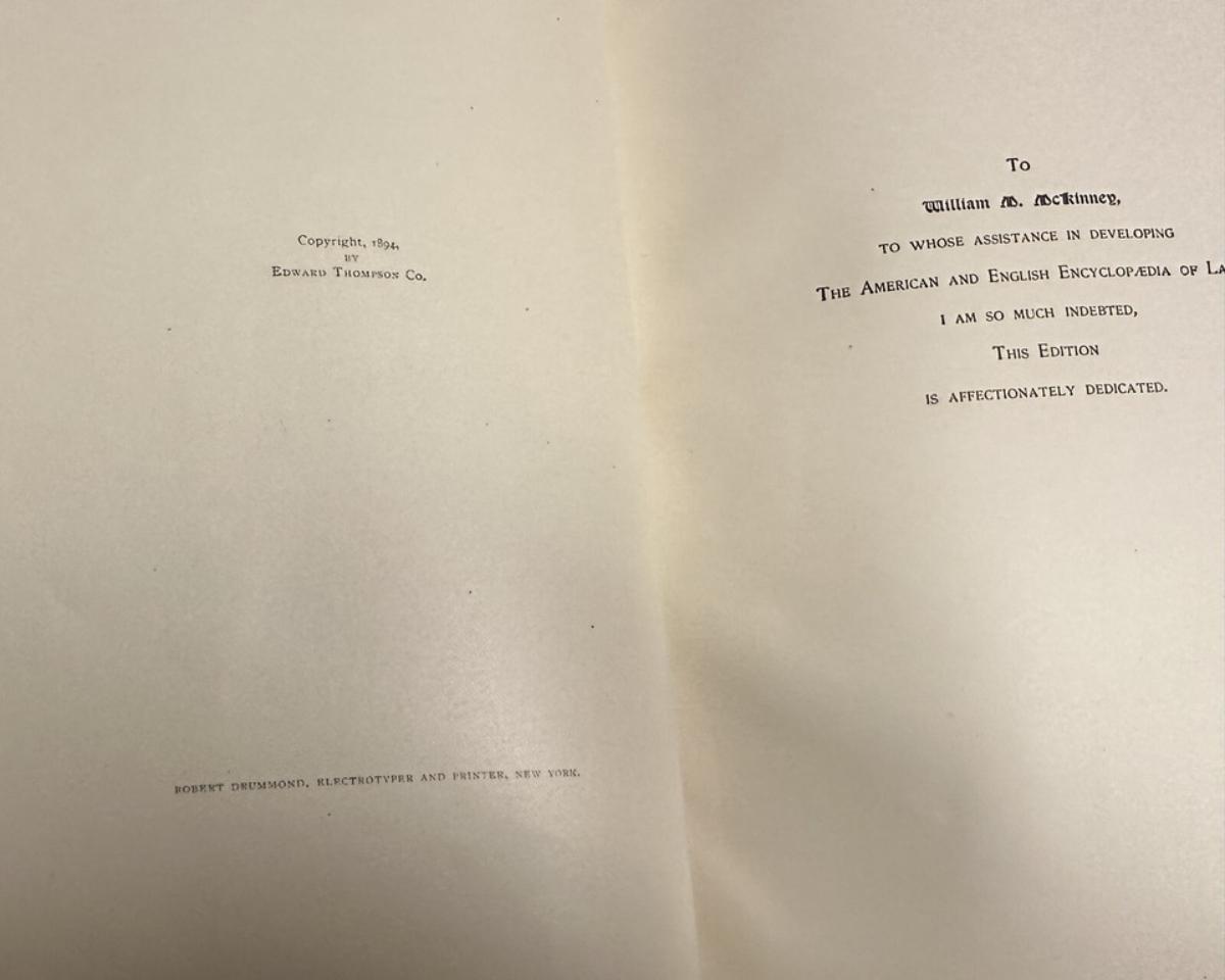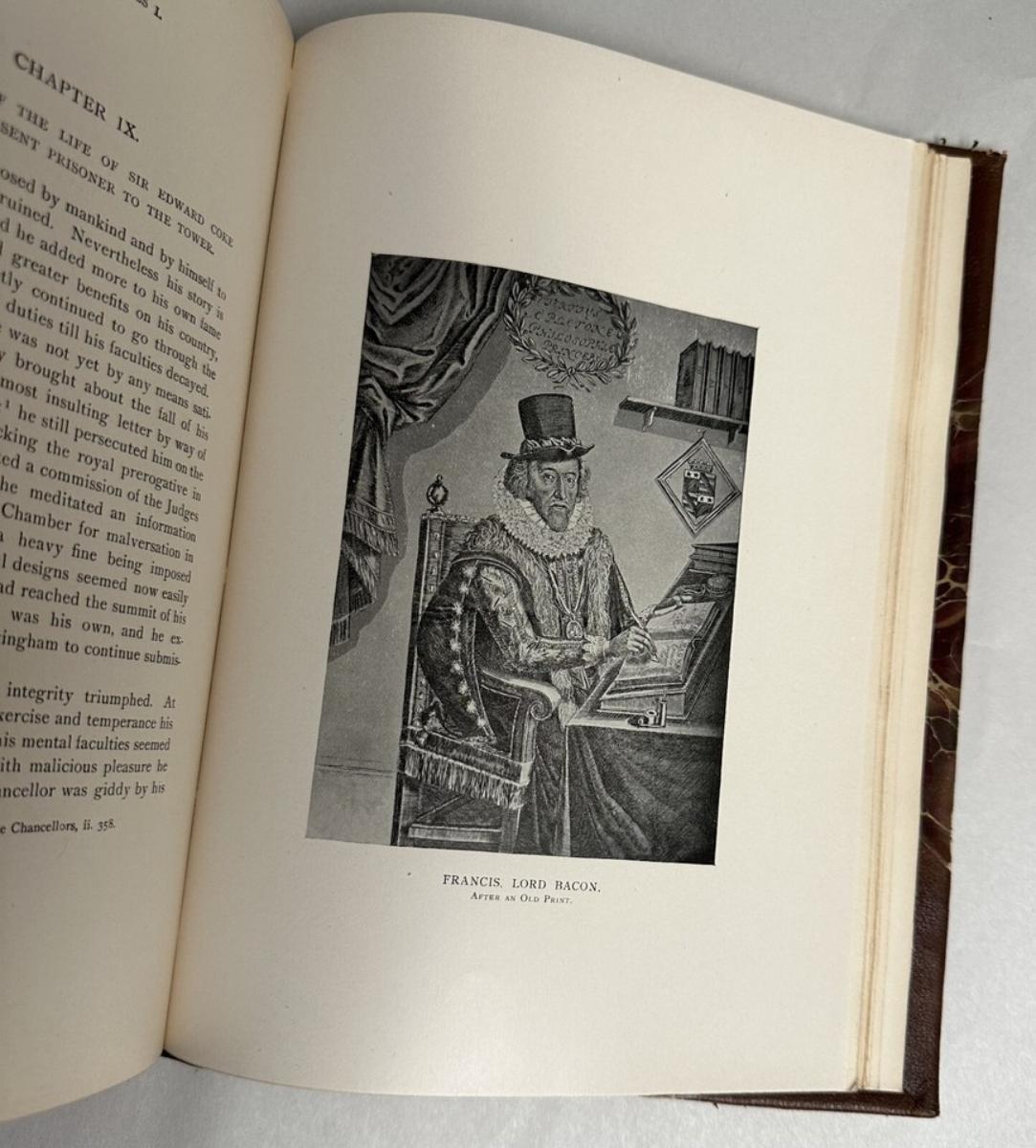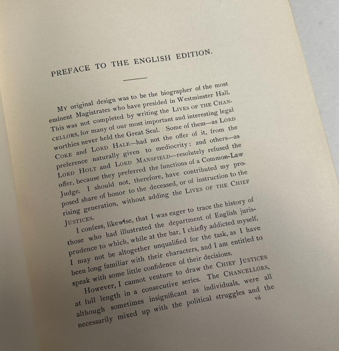 Fine condition on this original 1894 first edition of THE LIVES OF THE CHIEF JUSTICES OF ENGLAND-FROM THE NORMAN CONQUEST TILL THE DEATH OF LORD TENTERDEN by JOHN, LORD CAMPBELL, Lord Chief Justice and Lord High Chancellor of England...Binding good..Some surface rubs on exterior cover..Complete with 440 pages...9.5 x 8"..New and Revised edition. This classic study, which went through several editions, is an incomparable storehouse of legal history and numerous anecdotes....with illustrations...Volume One of Five..Printed by Edward Thompson Co. of Northport, Long Island, N.Y.