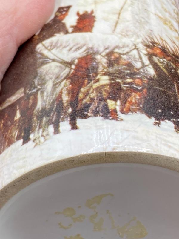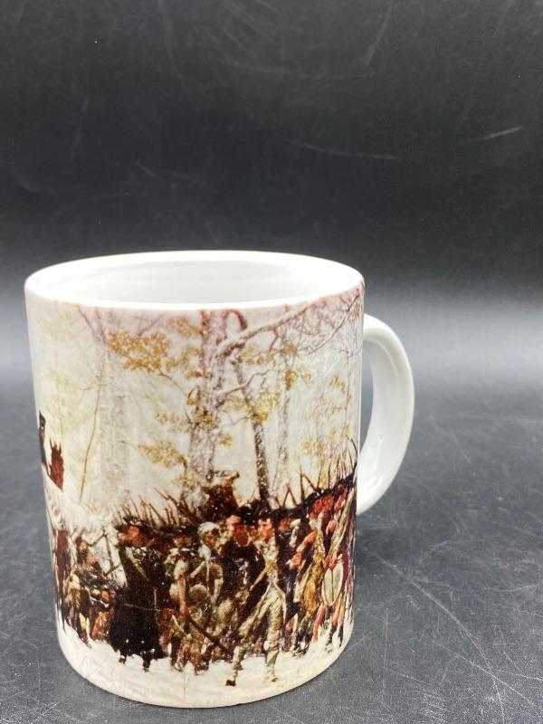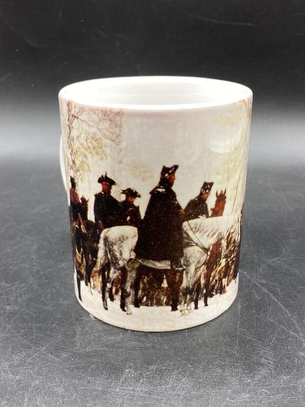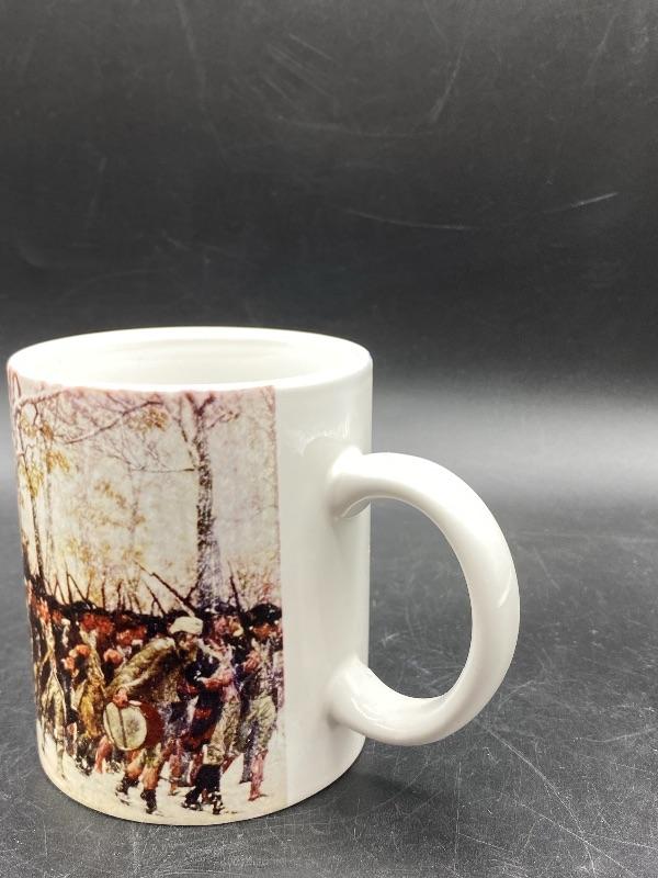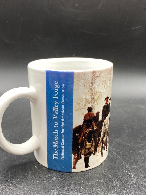The March to Valley Forge coffee cup. Souvenir from the National Center for the American Revolution. There is a fine crack inside/outside.