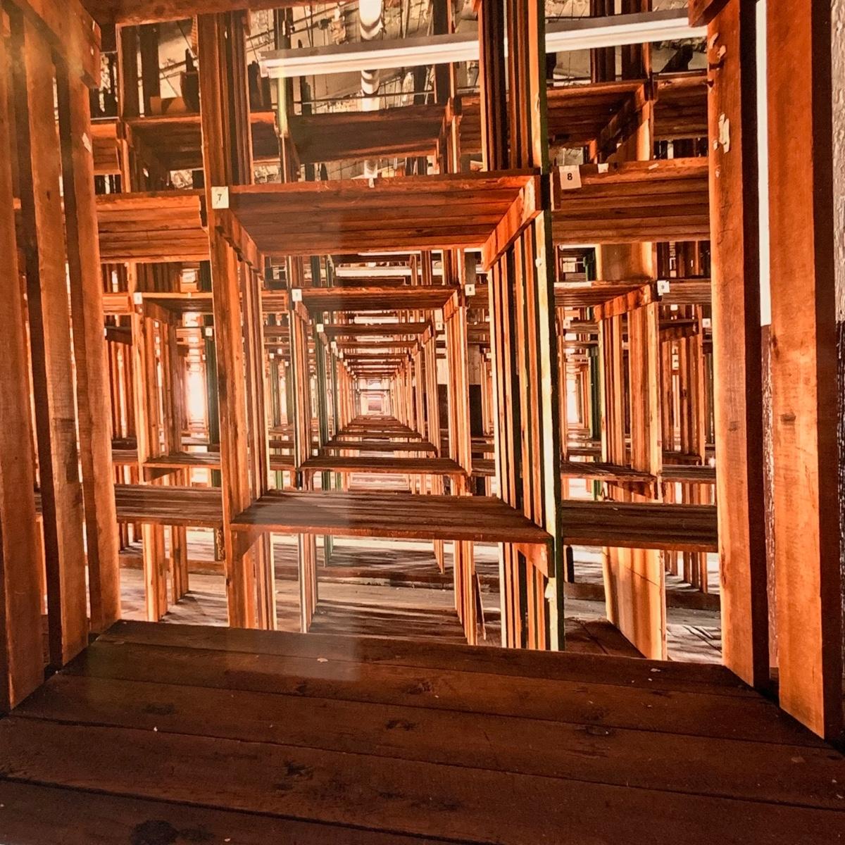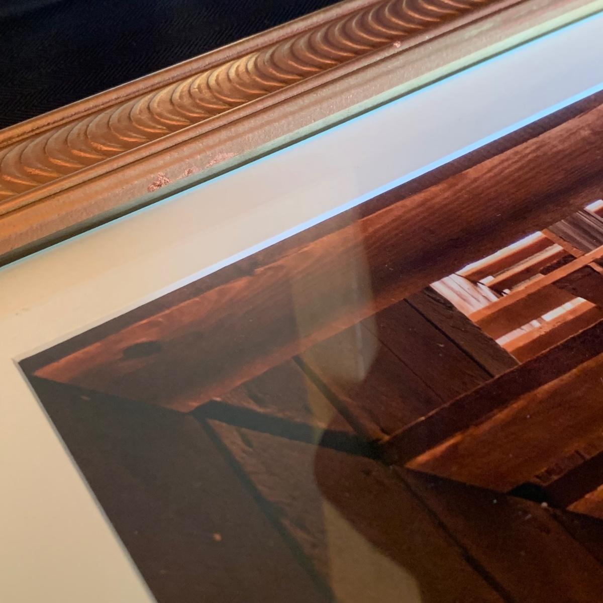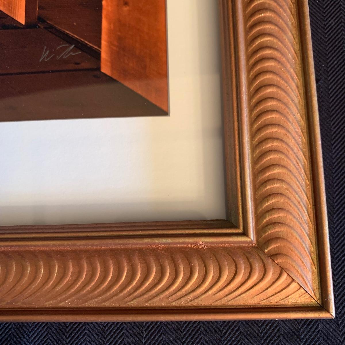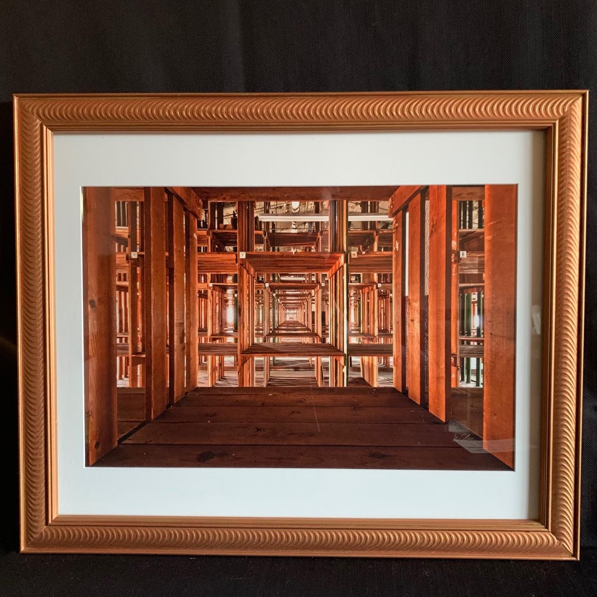 Signed by artist Walter Arnold, this photograph is his work titled “The Matrix” from his body of work called “The Art of Abandonment”. According to the artist’s website, this photograph was taken at the abandoned Scranton Lace Factory in Scranton, Pennsylvania. This piece is behind glass with a white mat board in a copper colored wood frame that is 22.5” x 18.5”H. The back of the frame is loose and has been taped.