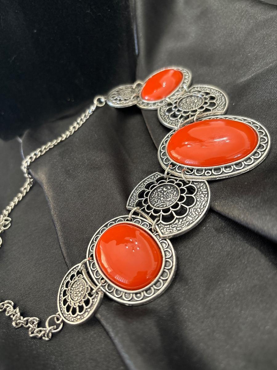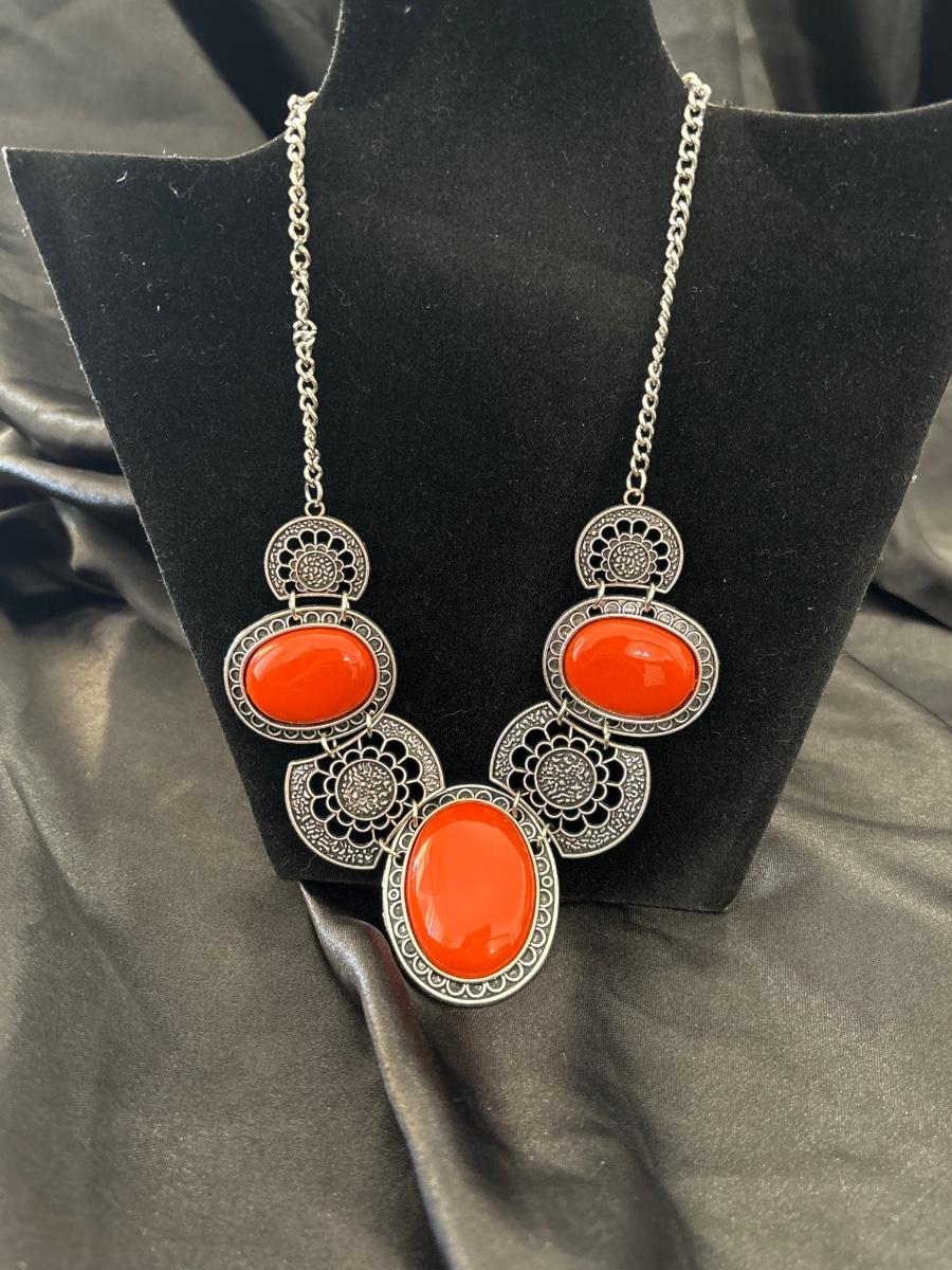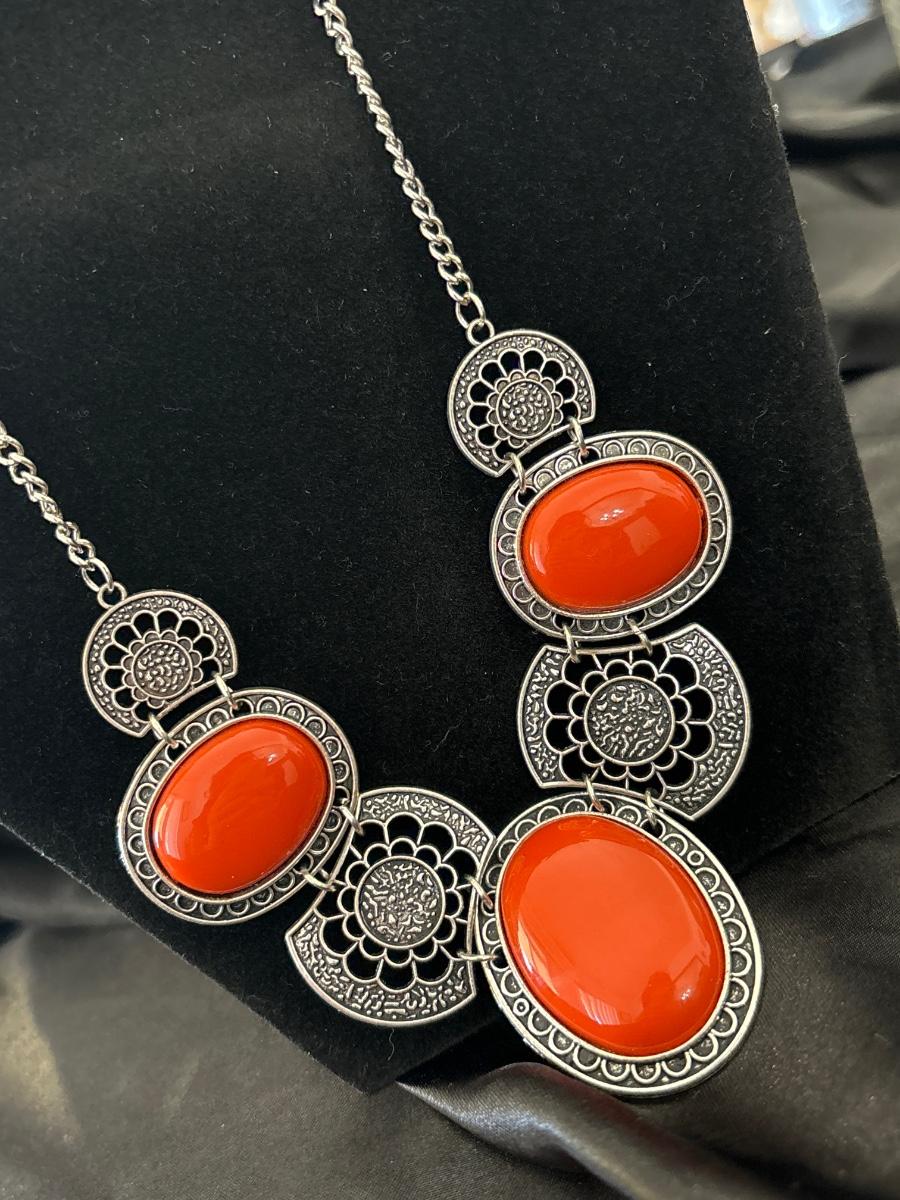 "THE MEDALLION-AIRE" ORANGE BEAD SILVER FLORAL FRAME NECKLACE