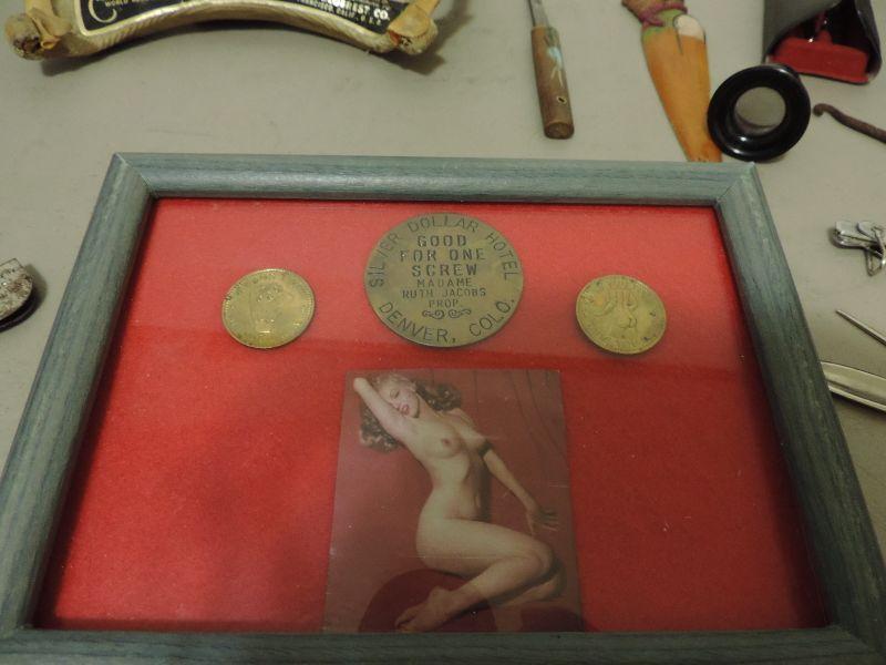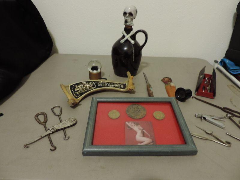 US LUTZ WRITING INSTRUMENT MADE IN GERMANY, SKULL JUG, VINTAGE SHOULDEREST BY KOLRESCH, 3 COINS FROM DENVERS PAST "SILVER DOLLAR HOTEL" HEADS & TAILS COINS AND ONE OFFERING MADAME RUTH'S FREE SERVICE ˜‚ ,AND OTHER VINTAGE ITEMS