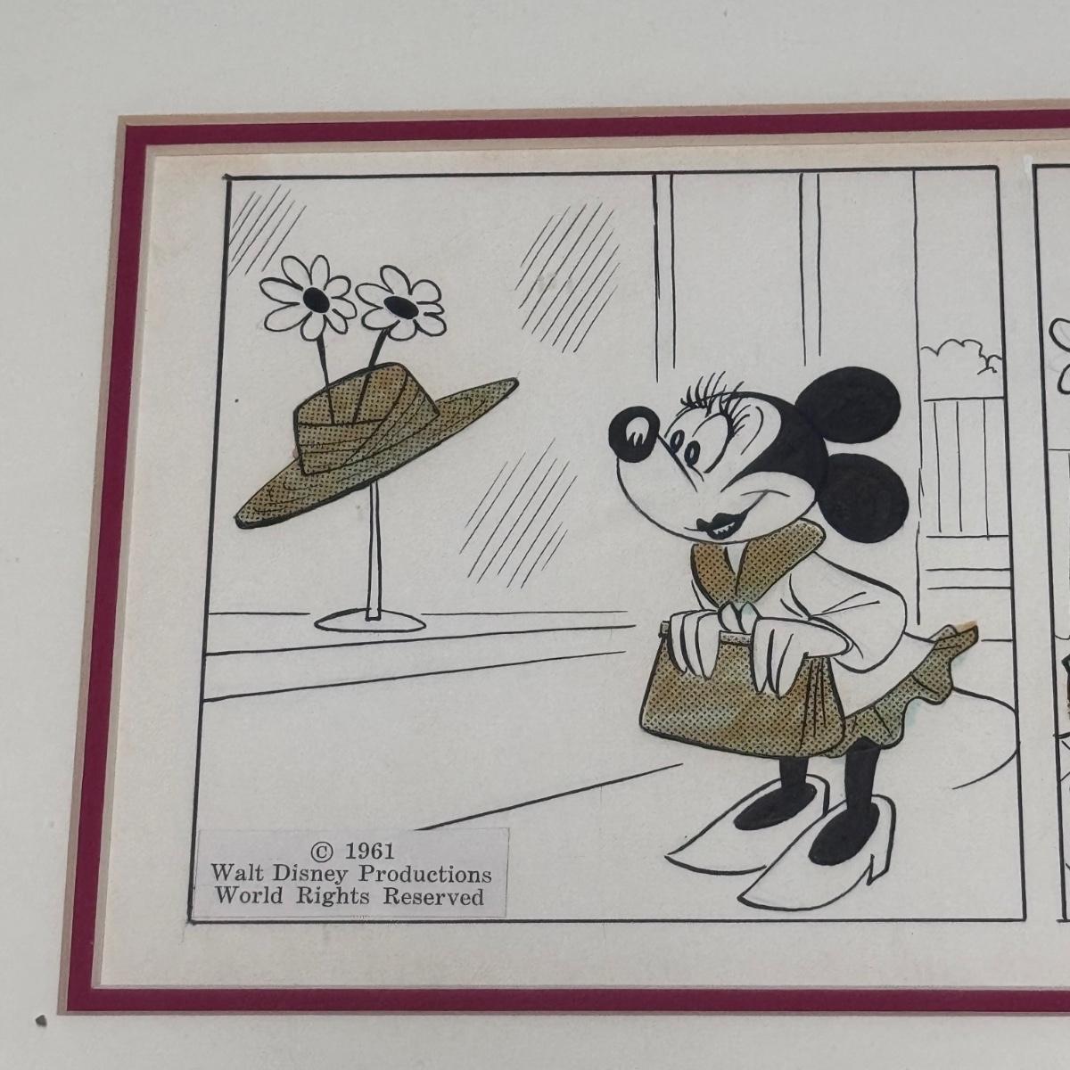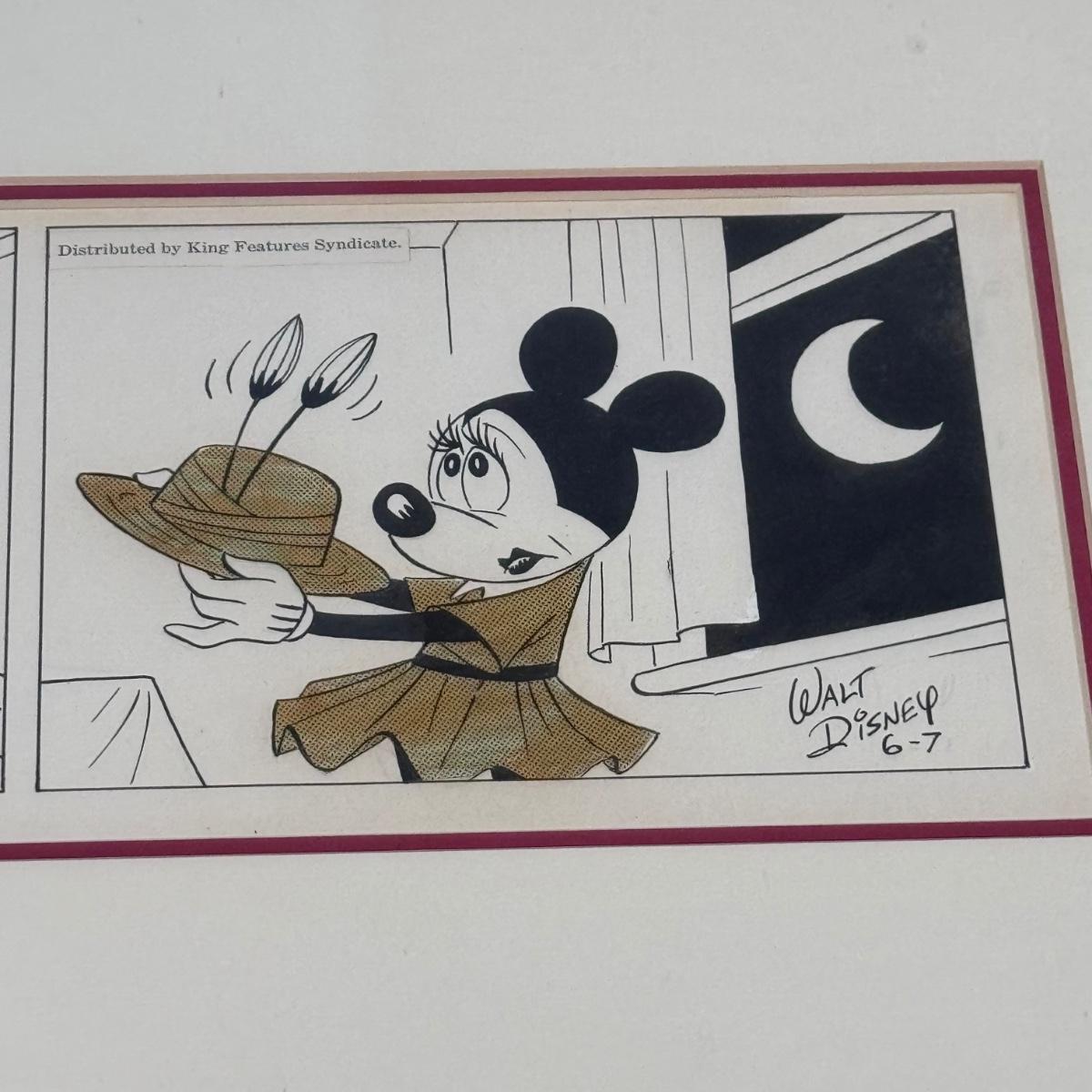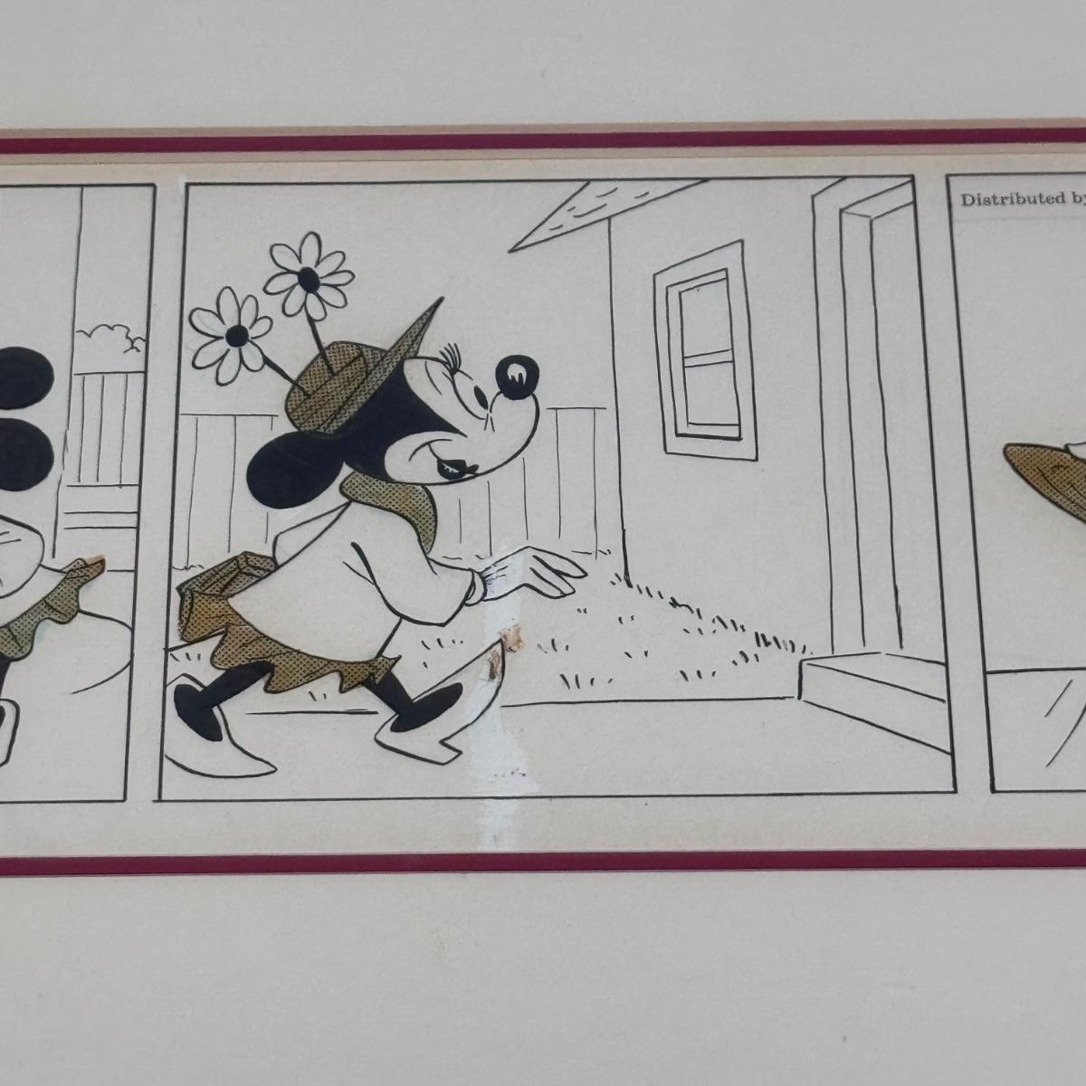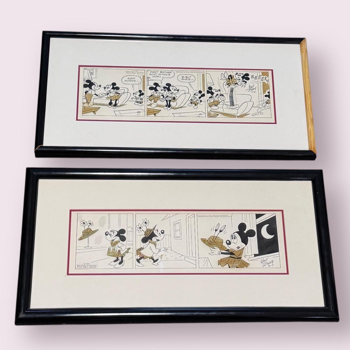 This lot includes two Walt Disney daily strips from the early 1960’s. You’ll find “The Mickey Mouse” daily strip and “The Minnie Mouse” daily strip. Both pieces of art are protected in a wooden frame with black plastic covering, a plastic layer, and double matting. “The Mickey Mouse” daily strip is a tad bigger than the other, measuring 27” x 14”H. “The Minnie Mouse” daily strip measures 26” x 13”H. The original invoices are included for both - see the last two pictures.