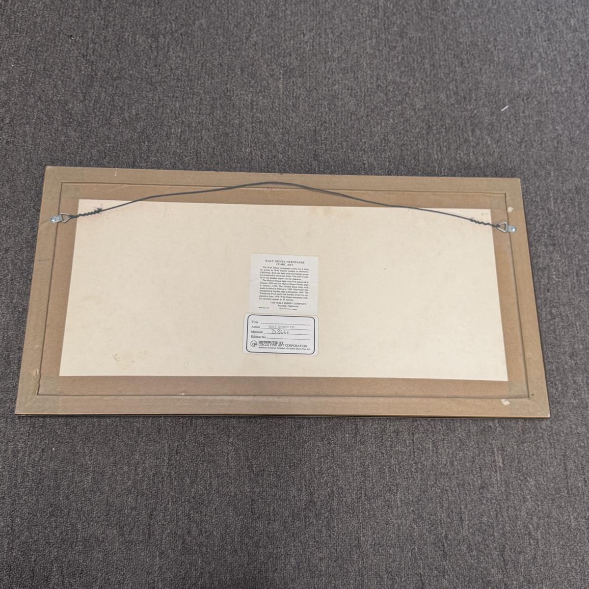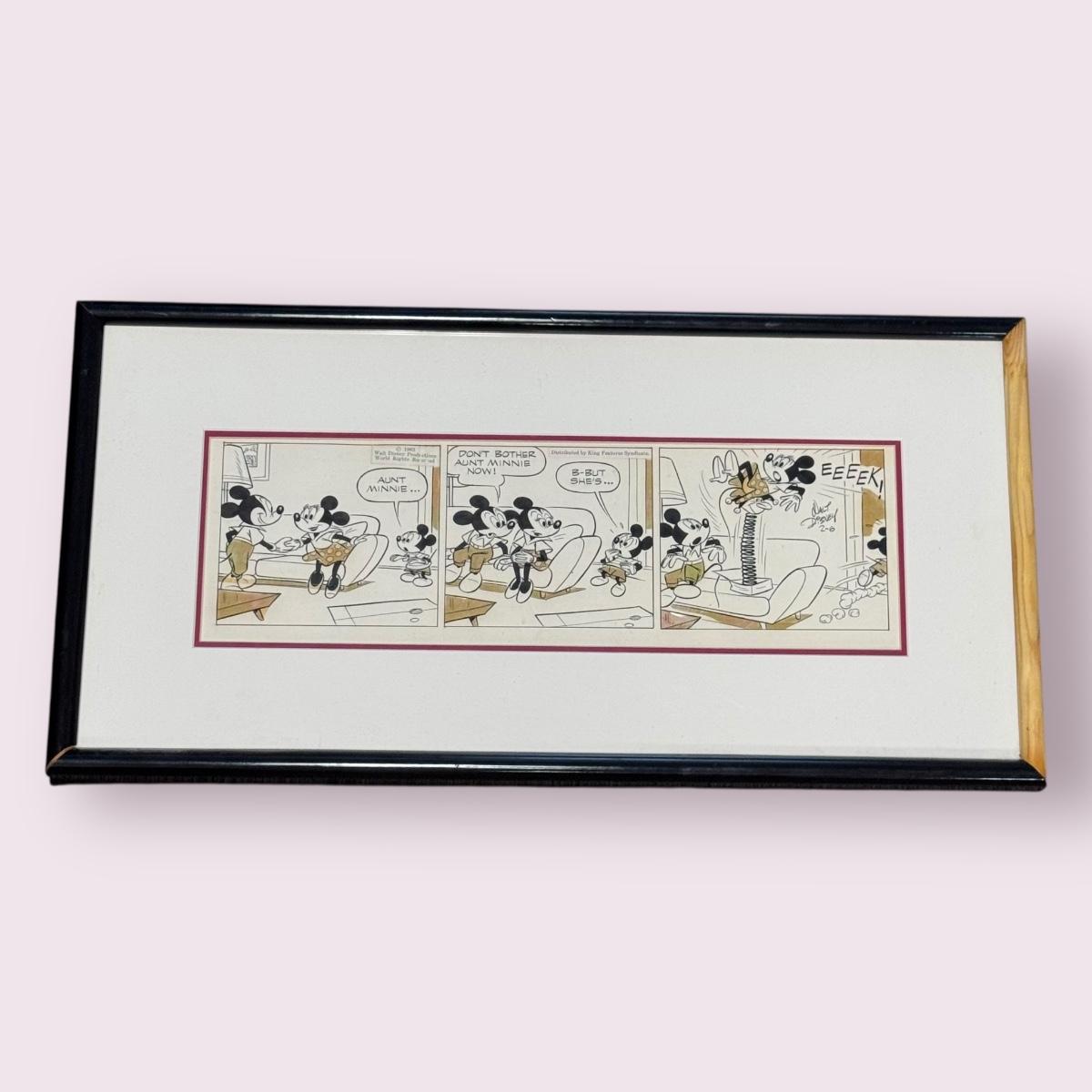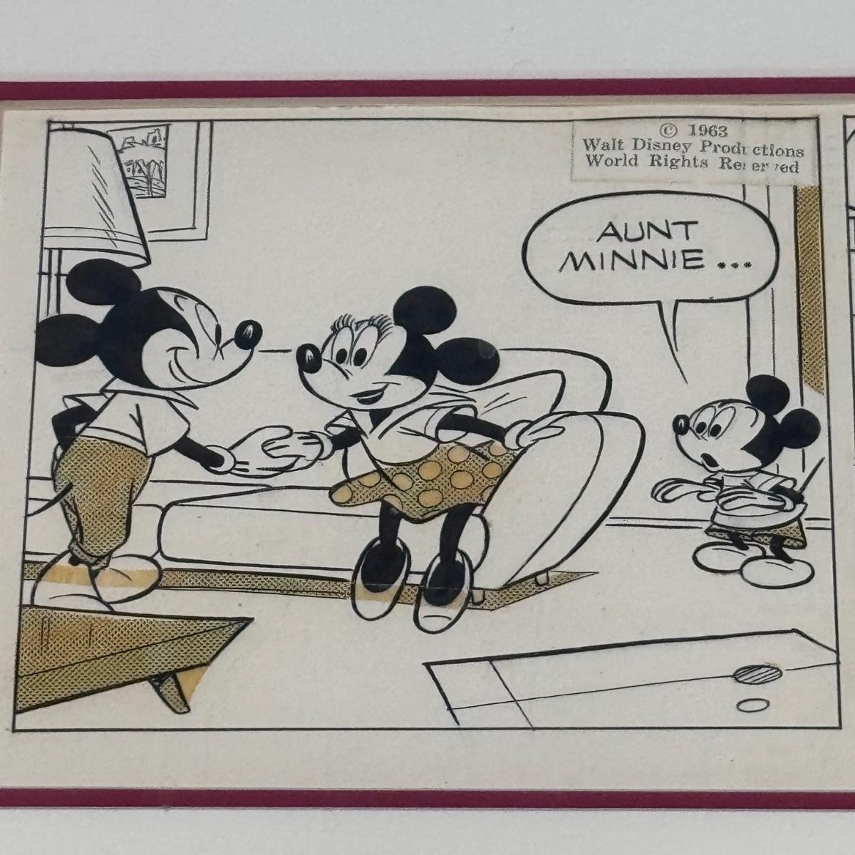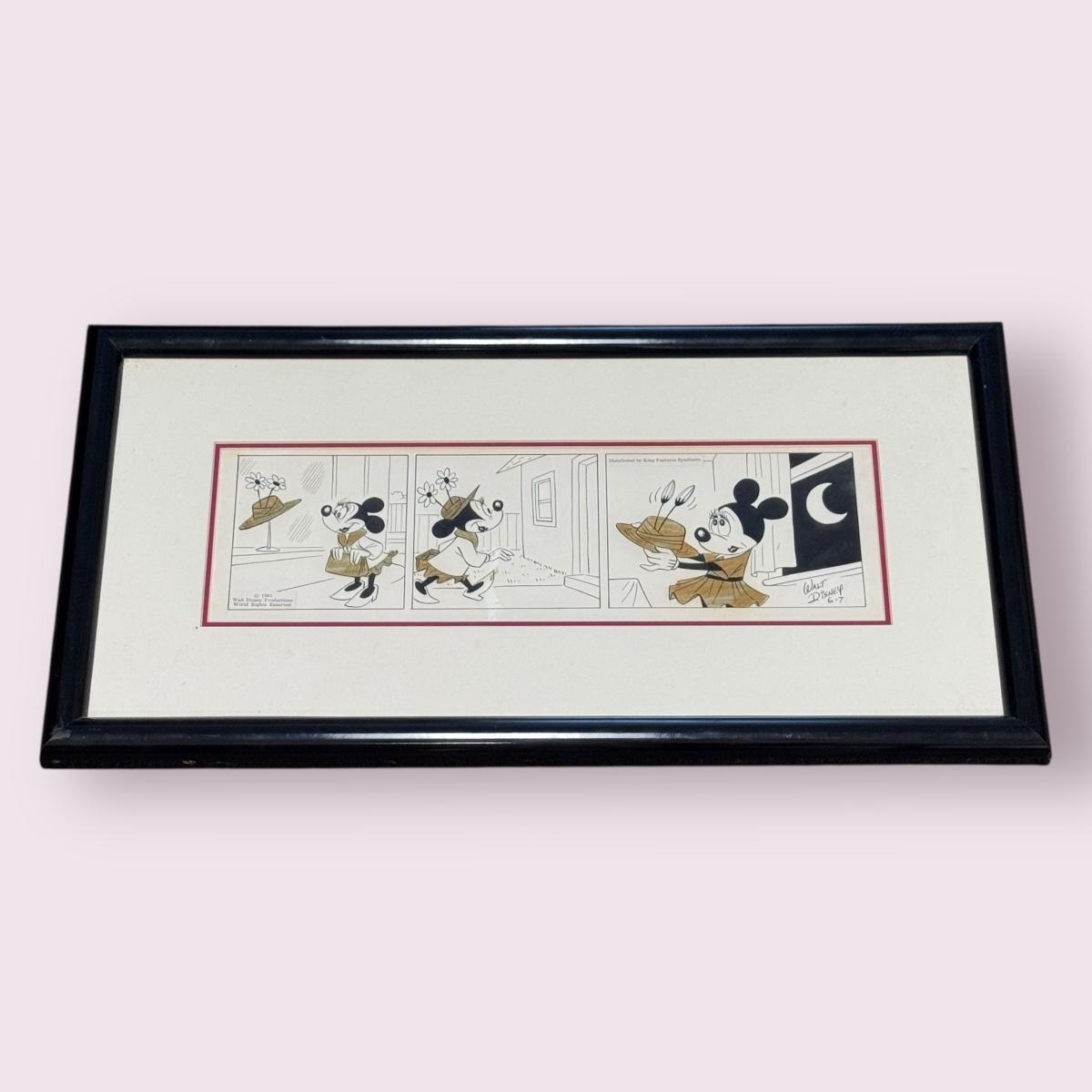 This lot includes two Walt Disney daily strips from the early 1960’s. You’ll find “The Mickey Mouse” daily strip and “The Minnie Mouse” daily strip. Both pieces of art are protected in a wooden frame with black plastic covering, a plastic layer, and double matting. “The Mickey Mouse” daily strip is a tad bigger than the other, measuring 27” x 14”H. “The Minnie Mouse” daily strip measures 26” x 13”H. The original invoices are included for both - see the last two pictures.