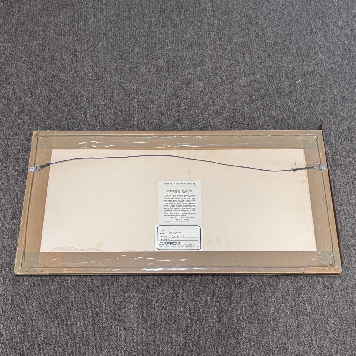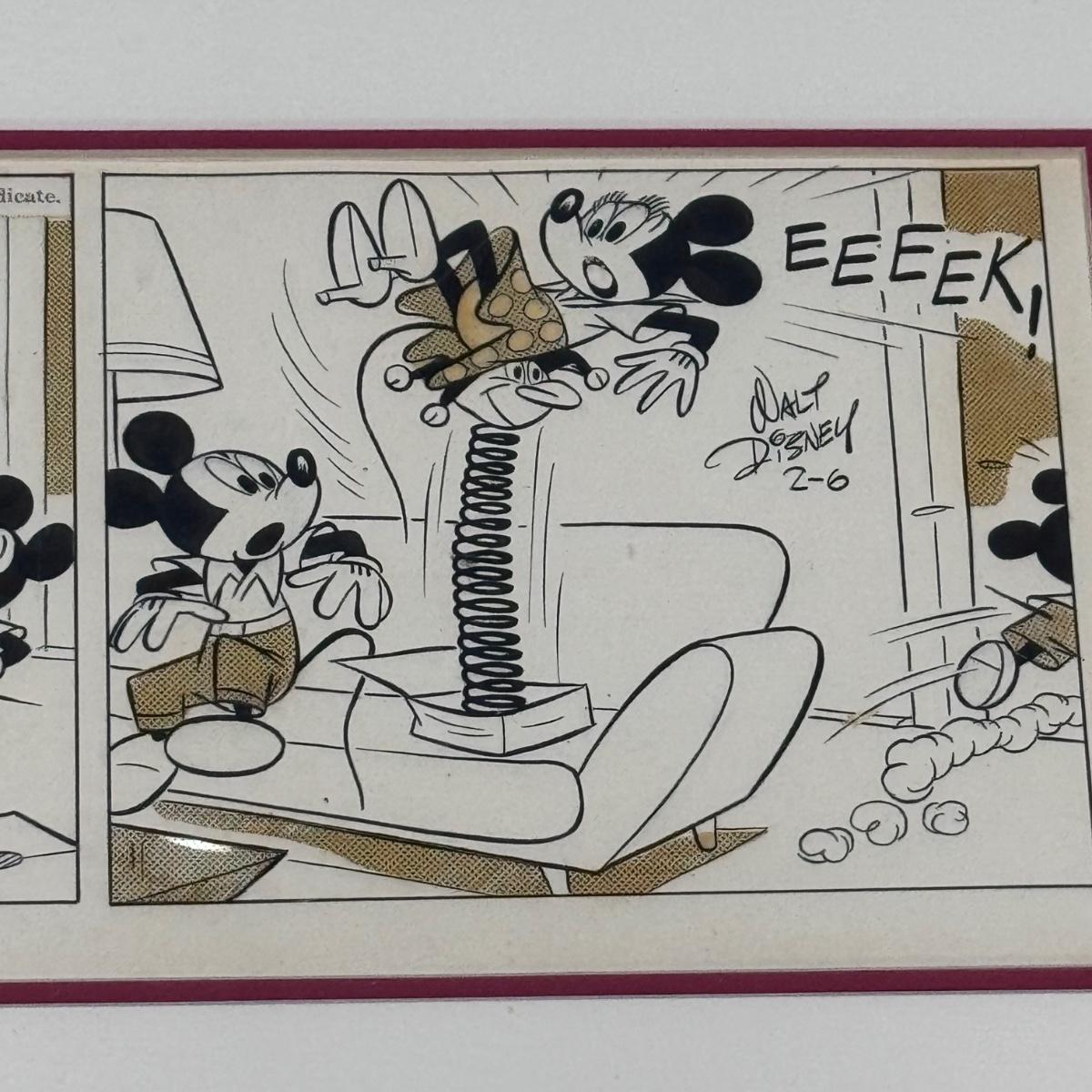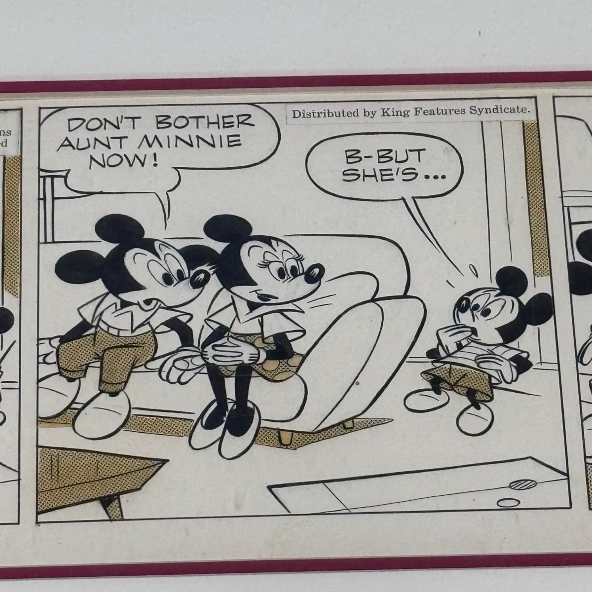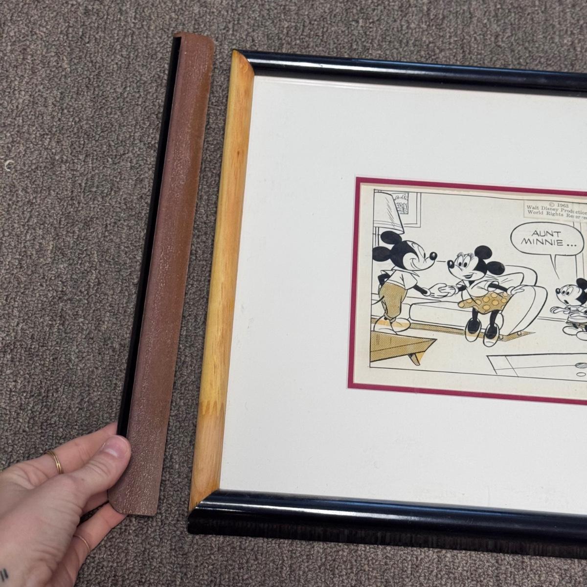 This lot includes two Walt Disney daily strips from the early 1960’s. You’ll find “The Mickey Mouse” daily strip and “The Minnie Mouse” daily strip. Both pieces of art are protected in a wooden frame with black plastic covering, a plastic layer, and double matting. “The Mickey Mouse” daily strip is a tad bigger than the other, measuring 27” x 14”H. “The Minnie Mouse” daily strip measures 26” x 13”H. The original invoices are included for both - see the last two pictures.